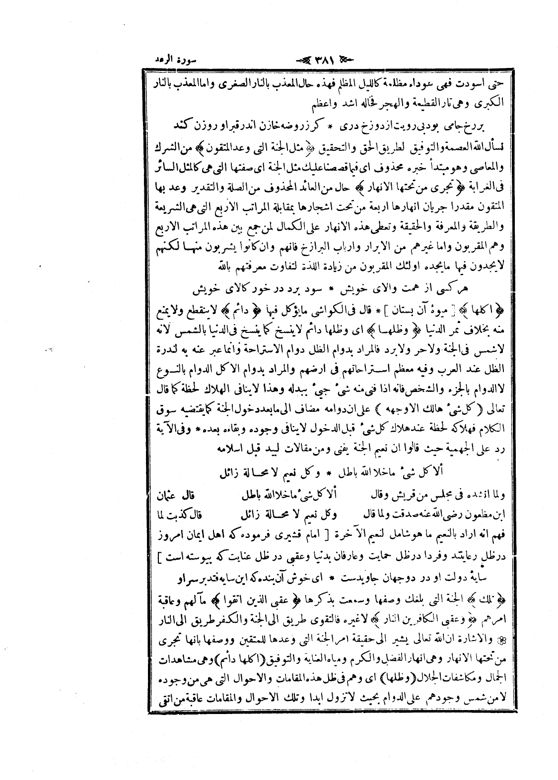 ولما أنشده فى مجلس من قريش وقال ألا كل شىء ما خلا الله باطل قال عثمان ابن مظعون رضى الله عنه صدقت ولما قال وكل نعيم لا محالة زائل قال كذبت لما فهم انه أراد بالنعيم ما هو شامل لنعيم الآخرة [امام قشيرى فرموده كه اهل ايمان امروز در ظل رعايتند وفردا در ظل حمايت وعارفان بدنيا وعقبى در ظل عنايت كه پيوسته است]