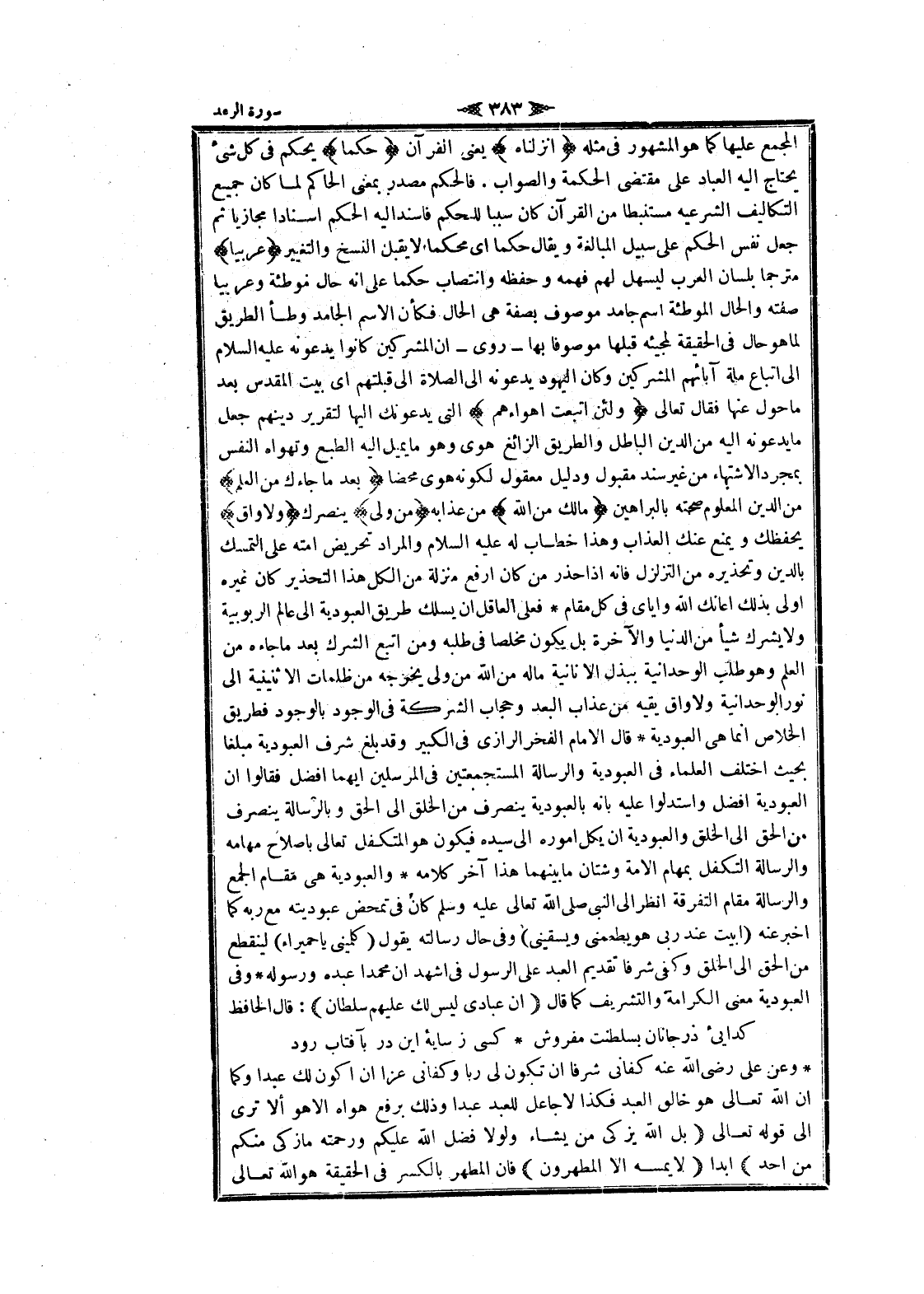 وإياي فى كل مقام فعلى العاقل ان يسلك طريق العبودية الى عالم الربوبية ولا يشرك شيأ من الدنيا والآخرة بل يكون مخلصا فى طلبه ومن اتبع الشرك بعد ما جاءه من العلم وهو طلب الوحدانية ببذل الا نانية ماله من الله من ولى يخرجه من ظلمات الاثنينية الى نور الوحدانية ولا واق يقيه من عذاب البعد وحجاب الشركة فى الوجود بالوجود فطريق الخلاص انما هى العبودية قال الامام الفخر الرازي فى الكبير وقد بلغ شرف العبودية مبلغا بحيث اختلف العلماء فى العبودية والرسالة المستجمعتين فى المرسلين أيهما أفضل فقالوا ان العبودية أفضل واستدلوا عليه بانه بالعبودية ينصرف من الخلق الى الحق وبالرسالة ينصرف من الحق الى الخلق والعبودية ان يكل أموره الى سيده فيكون هو المتكفل تعالى بإصلاح مهامه والرسالة التكفل بمهام الامة وشتان ما بينهما هذا آخر كلامه والعبودية هى مقام الجمع والرسالة مقام التفرقة انظر الى النبي صلى الله تعالى عليه وسلم كان فى تمحض عبوديته مع ربه كما اخبر عنه (أبيت عند ربى هو يطعمنى ويسقينى) وفى حال رسالته يقول (كلمينى يا حميراء) لينقطع من الحق الى الخلق وكفى شرفا تقديم العبد على الرسول فى اشهد ان محمدا عبده ورسوله وفى العبودية معنى الكرامة والتشريف كما قال إِنَّ عِبادِي لَيْسَ لَكَ عَلَيْهِمْ سُلْطانٌ: قال الحافظ