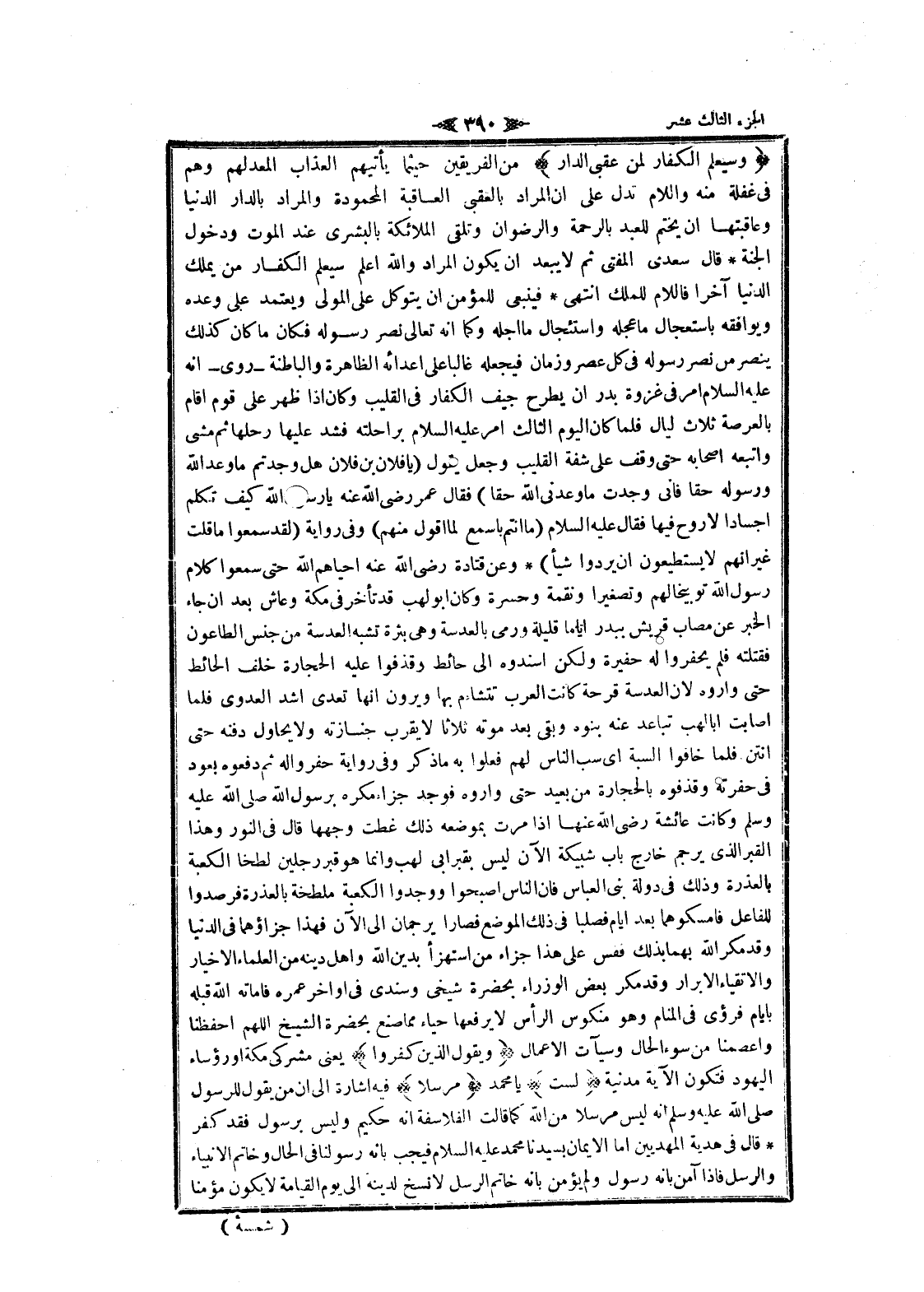 وَسَيَعْلَمُ الْكُفَّارُ لِمَنْ عُقْبَى الدَّارِ من الفريقين حيثما يأتيهم العذاب المعد لهم وهم فى غفلة منه واللام تدل على ان المراد بالعقبى العاقبة المحمودة والمراد بالدار الدنيا وعاقبتها ان يختم للعبد بالرحمة والرضوان وتلقى الملائكة بالبشرى عند الموت ودخول الجنة قال سعدى المفتى ثم لا يبعد ان يكون المراد والله اعلم سيعلم الكفار من يملك الدنيا آخرا فاللام للملك انتهى فينبعى للمؤمن ان يتوكل على المولى ويعتمد على وعده ويوافقه باستعجال ما عجله واستئجال ما اجله وكما انه تعالى نصر رسوله فكان ما كان كذلك ينصر من نصر رسوله فى كل عصر وزمان فيجعله غالبا على أعدائه الظاهرة والباطنة- روى- انه عليه السلام امر فى غزوة بدر ان يطرح جيف الكفار فى القليب وكان إذا ظهر على قوم اقام بالعرصة ثلاث ليال فلما كان اليوم الثالث امر عليه السلام براحلته فشد عليها رحلها ثم مشى واتبعه أصحابه حتى وقف على شفة القليب وجعل يقول (يا فلان بن فلان هل وجدتم ما وعد الله ورسوله حقا فانى وجدت ما وعدني الله حقا) فقال عمر رضى الله عنه يا رسول الله كيف تكلم أجسادا لا روح فيها فقال عليه السلام (ما أنتم باسمع لما أقول منهم) وفى رواية (لقد سمعوا ما قلت غير انهم لا يستطيعون ان يردوا شيأ) وعن قتادة رضى الله عنه أحياهم الله حتى سمعوا كلام رسول الله توبيخا لهم وتصغيرا ونقمة وحسرة وكان ابو لهب قد تأخر فى مكة وعاش بعد ان جاء الخبر عن مصاب قريش ببدر أياما قليلة ورمى بالعدسة وهى بثرة تشبه العدسة من جنس الطاعون فقتلته فلم يحفروا له حفيرة ولكن أسندوه الى حائط وقذفوا عليه الحجارة خلف الحائط حتى واروه لان العدسة قرحة كانت العرب تتشاءم بها ويرون انها تعدى أشد العدوى فلما أصابت أبا لهب تباعد عنه بنوه وبقي بعد موته ثلاثا لا يقرب جنازته ولا يحاول دفنه حتى أنتن فلما خافوا السبة اى سب الناس لهم فعلوا به ما ذكر وفى رواية حفروا له ثم دفعوه بعود فى حفرته وقذفوه بالحجارة من بعيد حتى واروه فوجد جزاء مكره برسول الله صلى الله عليه وسلم وكانت عائشة رضى الله عنها إذا مرت بموضعه ذلك غطت وجهها قال فى النور وهذا القبر الذي يرجم خارج باب شبيكة الآن ليس بقبر ابى لهب وانما هو قبر رجلين لطخا الكعبة بالعذرة وذلك فى دولة بنى العباس فان الناس أصبحوا ووجدوا الكعبة ملطخة بالعذرة فرصدوا للفاعل فامسكوهما بعد ايام فصلبا فى ذلك الموضع فصارا يرجمان الى الآن فهذا جزاؤهما فى الدنيا وقد مكر الله بهما بذلك فقس على هذا جزاء من استهزأ بدين الله واهل دينه من العلماء الأخيار والأتقياء الأبرار وقد مكر بعض الوزراء بحضرة شيخى وسندى فى اواخر عمره فاماته الله قبله بايام فرؤى فى المنام وهو منكوس الرأس لا يرفعها حياء مما صنع بحضرة الشيخ اللهم احفظنا واعصمنا من سوء الحال وسيآت الأعمال وَيَقُولُ الَّذِينَ كَفَرُوا يعنى مشركى مكة او رؤساء اليهود فتكون الآية مدنية لَسْتَ يا محمد مُرْسَلًا فيه اشارة الى ان من يقول للرسول صلى الله عليه وسلم انه ليس مرسلا من الله كما قالت الفلاسفة انه حكيم وليس برسول فقد كفر قال فى هدية المهديين اما الايمان بسيدنا محمد عليه السلام فيجب بانه رسولنا فى الحال وخاتم الأنبياء والرسل فاذا آمن بانه رسول ولم يؤمن بانه خاتم الرسل لا نسخ لدينه الى يوم القيامة لا يكون مؤمنا