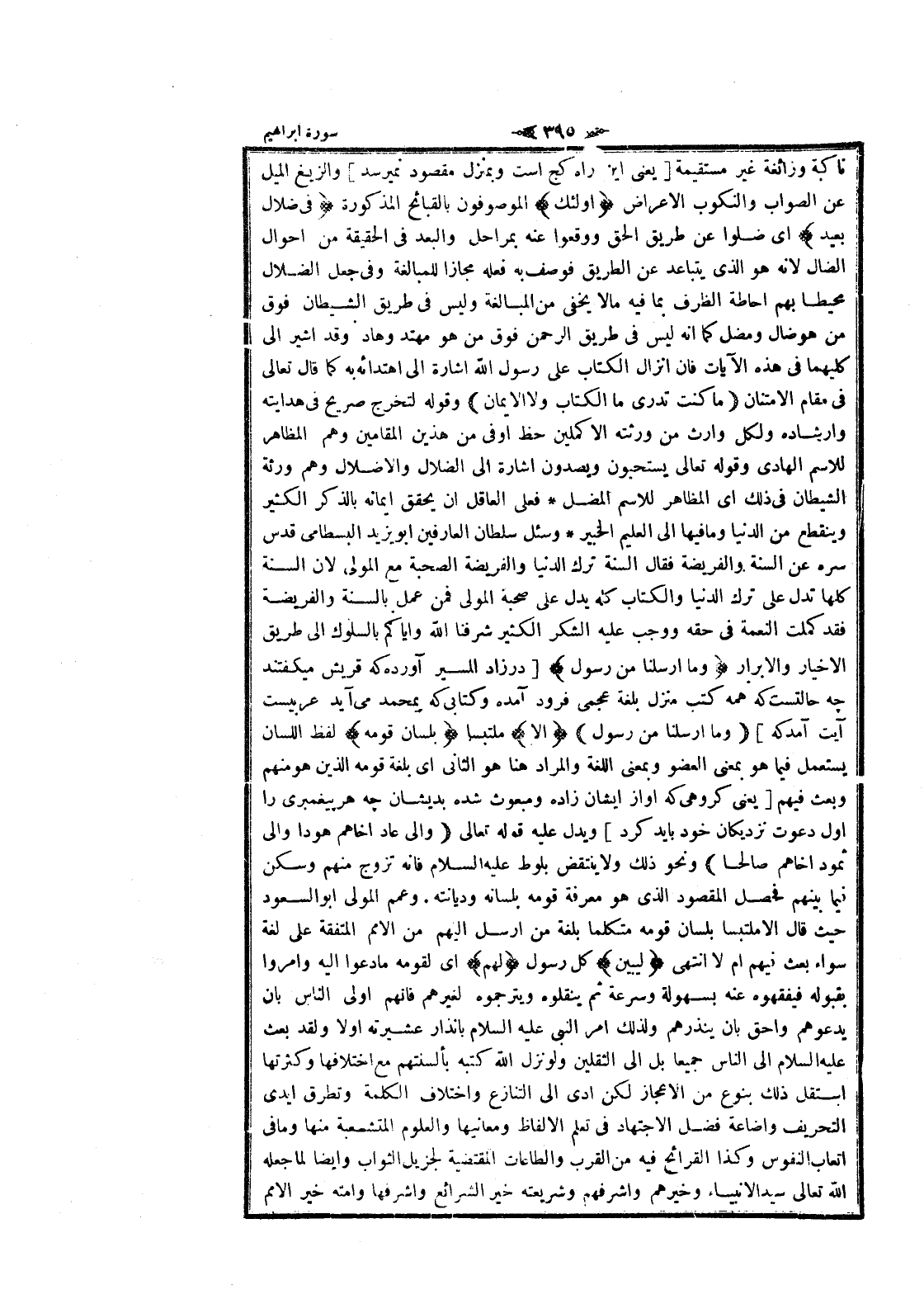 ناكبة وزائغة غير مستقيمة [يعنى اين راه كج است وبمنزل مقصود نميرسد] والزيغ الميل عن الصواب والنكوب الاعراض أُولئِكَ الموصوفون بالقبائح المذكورة فِي ضَلالٍ بَعِيدٍ اى ضلوا عن طريق الحق ووقعوا عنه بمراحل والبعد فى الحقيقة من احوال الضال لانه هو الذي يتباعد عن الطريق فوصف به فعله مجازا للمبالغة وفى جعل الضلال محيطا بهم احاطة الظرف بما فيه ما لا يخفى من المبالغة وليس فى طريق الشيطان فوق من هو ضال ومضل كما انه ليس فى طريق الرحمن فوق من هو مهتد وهاد وقد أشير الى كليهما فى هذه الآيات فان إنزال الكتاب على رسول الله اشارة الى اهتدائه به كما قال تعالى فى مقام الامتنان ما كُنْتَ تَدْرِي مَا الْكِتابُ وَلَا الْإِيمانُ وقوله لتخرج صريح فى هدايته وإرشاده ولكل وارث من ورثته الأكملين حظ اوفى من هذين المقامين وهم المظاهر للاسم الهادي وقوله تعالى يستحبون ويصدون اشارة الى الضلال والإضلال وهم ورثة الشيطان فى ذلك اى المظاهر للاسم المضل فعلى العاقل ان يحقق إيمانه بالذكر الكثير وينقطع من الدنيا وما فيها الى العليم الخبير وسئل سلطان العارفين ابو يزيد البسطامي قدس سره عن السنة والفريضة فقال السنة ترك الدنيا والفريضة الصحبة مع المولى لان السنة كلها تدل على ترك الدنيا والكتاب كله يدل على صحبة المولى فمن عمل بالسنة والفريضة فقد كملت النعمة فى حقه ووجب عليه الشكر الكثير شرفنا الله وإياكم بالسلوك الى طريق الأخيار والأبرار وَما أَرْسَلْنا مِنْ رَسُولٍ [در زاد المسير آورده كه قريش ميكفتند چهـ حالتست كه همه كتب منزل بلغة عجمى فرود آمده وكتابى كه بمحمد مى آيد عربيست آيت آمد كه] وَما أَرْسَلْنا مِنْ رَسُولٍ إِلَّا ملتبسا بِلِسانِ قَوْمِهِ لفظ اللسان يستعمل فيما هو بمعنى العضو وبمعنى اللغة والمراد هنا هو الثاني اى بلغة قومه الذين هو منهم وبعث فيهم [يعنى كروهى كه او از ايشان زاده ومبعوث شده بديشان چهـ هر پيغمبرى را أول دعوت نزديكان خود بايد كرد] ويدل عليه قوله تعالى وَإِلى عادٍ أَخاهُمْ هُوداً وَإِلى ثَمُودَ أَخاهُمْ صالِحاً ونحو ذلك ولا ينتقض بلوط عليه السلام فانه تزوج منهم وسكن فيما بينهم فحصل المقصود الذي هو معرفة قومه بلسانه وديانته. وعمم المولى ابو السعود حيث قال الا ملتبسا بلسان قومه متكلما بلغة من أرسل إليهم من الأمم المتفقة على لغة سواء بعث فيهم أم لا انتهى لِيُبَيِّنَ كل رسول لَهُمْ اى لقومه ما دعوا اليه وأمروا بقبوله فيفقهوه عنه بسهولة وسرعة ثم ينقلوه ويترجموه لغيرهم فانهم اولى الناس بان يدعوهم وأحق بان ينذرهم ولذلك امر النبي عليه السلام بانذار عشيرته اولا ولقد بعث عليه السلام الى الناس جميعا بل الى الثقلين ولو نزل الله كتبه بألسنتهم مع اختلافها وكثرتها استقل ذلك بنوع من الاعجاز لكن ادى الى التنازع واختلاف الكلمة وتطرق أيدي التحريف واضاعة فضل الاجتهاد فى تعلم الألفاظ ومعانيها والعلوم المتشعبة منها وما فى اتعاب النفوس وكذا القرائح فيه من القرب والطاعات المقتضية لجزيل الثواب وايضا لما جعله الله تعالى سيد الأنبياء وخيرهم وأشرفهم وشريعته خير الشرائع وأشرفها وأمته خير الأمم