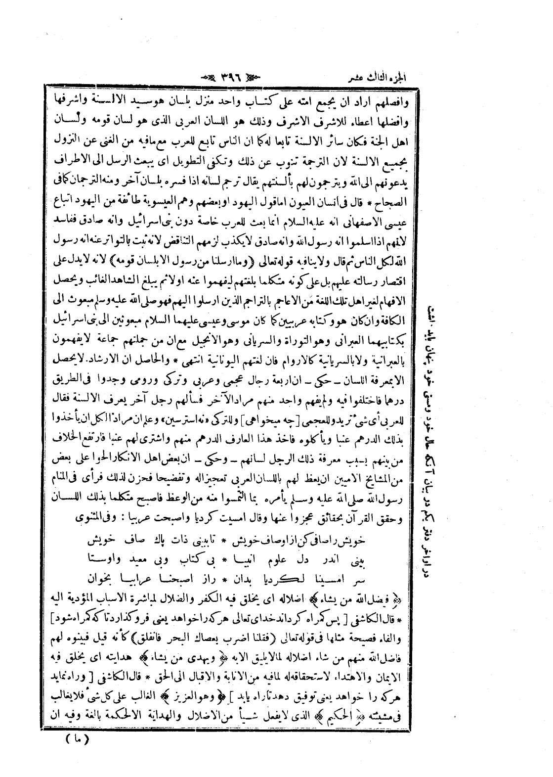 يبلغ الشاهد الغائب ويحصل الافهام لغير اهل تلك اللغة من الأعاجم بالتراجم الذين أرسلوا إليهم فهو صلى الله عليه وسلم مبعوث الى الكافة وان كان هو وكتابه عربيين كما كان موسى وعيسى عليهما السلام مبعوثين الى بنى إسرائيل بكتابيهما العبراني وهو التوراة والسرياني وهو الإنجيل مع ان من جملتهم جماعة لا يفهمون بالعبرانية ولا بالسريانية كالاروام فان لغتهم اليونانية انتهى والحاصل ان الإرشاد. لا يحصل الا بمعرفة اللسان- حكى- ان اربعة رجال عجمى وعربى وتركى ورومى وجدوا فى الطريق درهما فاختلفوا فيه ولم يفهم واحد منهم مراد الآخر فسألهم رجل آخر يعرف الالسنة فقال للعربى أي شىء تريد وللعجمى [چهـ ميخواهى] وللتركى «نه استرسين» وعلم ان مراد الكل ان يأخذوا بذلك الدرهم عنبا ويأكلوه فاخذ هذا العارف الدرهم منهم واشترى لهم عنبا فارتفع الخلاف من بينهم بسبب معرفة ذلك الرجل لسانهم- وحكى- ان بعض اهل الإنكار ألحوا على بعض من المشايخ الأميين ان يعظ لهم باللسان العربي تعجيز اله وتفضيحا فحزن لذلك فرأى فى المنام رسول الله صلى الله عليه وسلم يأمره بما التمسوا منه من الوعظ فاصبح متكلما بذلك اللسان وحقق القرآن بحقائق عجزوا عنها وقال أمسيت كرديا وأصبحت عربيا: وفى المثنوى