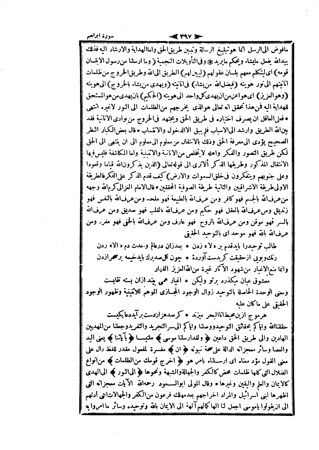ما فوض الى الرسل انما هو تبليغ الرسالة وتبيين طريق الحق واما الهداية والإرشاد اليه فذلك بيد الله يفعل ما يشاء ويحكم ما يريد وفى التأويلات النجمية وَما أَرْسَلْنا مِنْ رَسُولٍ إِلَّا بِلِسانِ قَوْمِهِ اى ليتكلم معهم بلسان عقولهم لِيُبَيِّنَ لَهُمْ الطريق الى الله وطريق الخروج من ظلمات انانيتهم الى نور هويته فَيُضِلُّ اللَّهُ مَنْ يَشاءُ فى انانيته وَيَهْدِي مَنْ يَشاءُ بالخروج الى هويته وَهُوَ الْعَزِيزُ اى هو أعز من ان يهدى كل واحد الى هويته الْحَكِيمُ بان يهدى من هو المستحق للهداية اليه فمن هذا تحقق انه تعالى هو الذي يخرجهم من الظلمات الى النور لا غيره انتهى فعلى العاقل ان يصرف اختياره فى طريق الحق ويجتهد فى الخروج من بوادي الانانية فقد بين الله الطريق وارشد الى الأسباب فلم يبق الا الدخول والانتساب قال بعض الكبار النظر الصحيح يؤدى الى معرفة الحق وذلك بالانتقال من معلوم الى معلوم الى ان ينتهى الى الحق لكن طريق التصور والفكر واهله لا يتخلص من الانانية والاثنينية واما المكاشفة فليس فيها الانتقال المذكور وطريقها الذكر ألا ترى الى قوله تعالى الَّذِينَ يَذْكُرُونَ اللَّهَ قِياماً وَقُعُوداً وَعَلى جُنُوبِهِمْ وَيَتَفَكَّرُونَ فِي خَلْقِ السَّماواتِ وَالْأَرْضِ كيف قدم الذكر على الفكر فالطريقة الاولى طريقة الإشراقيين والثانية طريقة الصوفية المحققين قال الامام الغزالي كرم الله وجهه من عرف الله بالجسم فهو كافر ومن عرف الله بالطبيعة فهو ملحد ومن عرف الله بالنفس فهو زنديق ومن عرف الله بالعقل فهو حكيم ومن عرف الله بالقلب فهو صديق ومن عرف الله بالسر فهو موقن ومن عرف الله بالروح فهو عارف ومن عرف الله بالخفي فهو مفرد ومن عرف الله بالله فهو موحد اى بالتوحيد الحقيقي