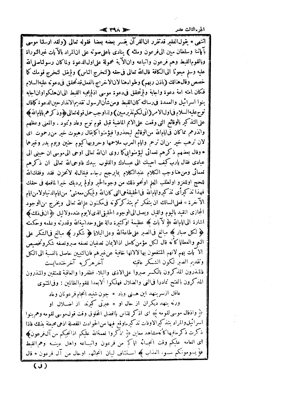 انتهى يقول الفقير قد تقرر ان القرآن يفسر بعضه بعضا فقوله تعالى وَلَقَدْ أَرْسَلْنا مُوسى بِآياتِنا وَسُلْطانٍ مُبِينٍ إِلى فِرْعَوْنَ وَمَلَائِهِ ينادى بأعلى صوته على ان المراد بالآيات غير التوراة وبالقوم القبط وهم فرعون واتباعه وان الآية محمولة على أول الدعوة ولما كان رسولنا صلى الله عليه وسلم مبعوثا الى الكافة قال الله تعالى فى حقه لِتُخْرِجَ النَّاسَ ولم يقل لتخرج قومك كما خصص وقال هنالك بِإِذْنِ رَبِّهِمْ وطواه هنا لان الإخراج بالفعل قد تحقق فى دعوته عليه السلام فكان أمته امة دعوة واجابة ولم يتحقق فى دعوة موسى إذ لم يجبه القبط الى ان هلكوا وان اجابه بنوا إسرائيل والعمدة فى رسالته كان القبط ومن شأن الرسول تقديم الانذار حين الدعوة كما قال نوح عليه السلام فى أول الأمر إِنِّي لَكُمْ نَذِيرٌ مُبِينٌ ولذا وجب حمل قوله تعالى وَذَكِّرْهُمْ بِأَيَّامِ اللَّهِ على التذكير بالوقائع التي وقعت على الأمم الماضية قبل قوم نوح وعاد وثمود. والمعنى وعظهم وانذرهم مما كان فى ايام الله من الوقائع ليحذروا فيؤمنوا كما يقال رهبوت خير من رحموت اى لان ترهب خير من ان ترحم وايام العرب ملاحمها وحروبها كيوم حنين ويوم بدر وغيرهما وقال بعضهم ذكرهم نعمائى ليؤمنوا بي كما روى ان الله تعالى اوحى الى موسى ان حببنى الى عبادى فقال يا رب كيف أحببك الى عبادك والقلوب بيدك فاوحى الله تعالى ان ذكرهم نعمائى ومن هنا وجب الكلام عند الكلام بما يرجح رجاءه فيقال له لا تحزن فقد وفقك الله للحج او للغزو او لطلب العلم او نحو ذلك من وجوه الخير ولو لم يرد بك خيرا لما فعله فى حقك فهذا تذكير أي تذكير وايام الله فى الحقيقة هى التي كان الله ولم يكن معه شىء من ايام الدنيا ولا من ايام الآخرة فعلى السالك ان يتفكر ثم يتذكر كونه فى مكنون علم الله تعالى ويخرج من الوجود المجازى المقيد باليوم والليل ويصل الى الوجود الحقيقي الذي لا يوم عنده ولاليل إِنَّ فِي ذلِكَ اشارة الى ايام الله لَآياتٍ عظيمة او كثيرة دالة على وحدانية الله وقدرته وعلمه وحكمته لِكُلِّ صَبَّارٍ مبالغ فى الصبر على طاعة الله وعلى البلايا شَكُورٍ مبالغ فى الشكر على النعم والعطايا كأنه قال لكل مؤمن كامل إذ الايمان نصفيان نصفه صبر ونصفه شكر وتخصيص الآيات بهم لانهم المنتفعون بها لا لانها خافية عن غيرهم فان التبيين حاصل بالنسبة الى الكل