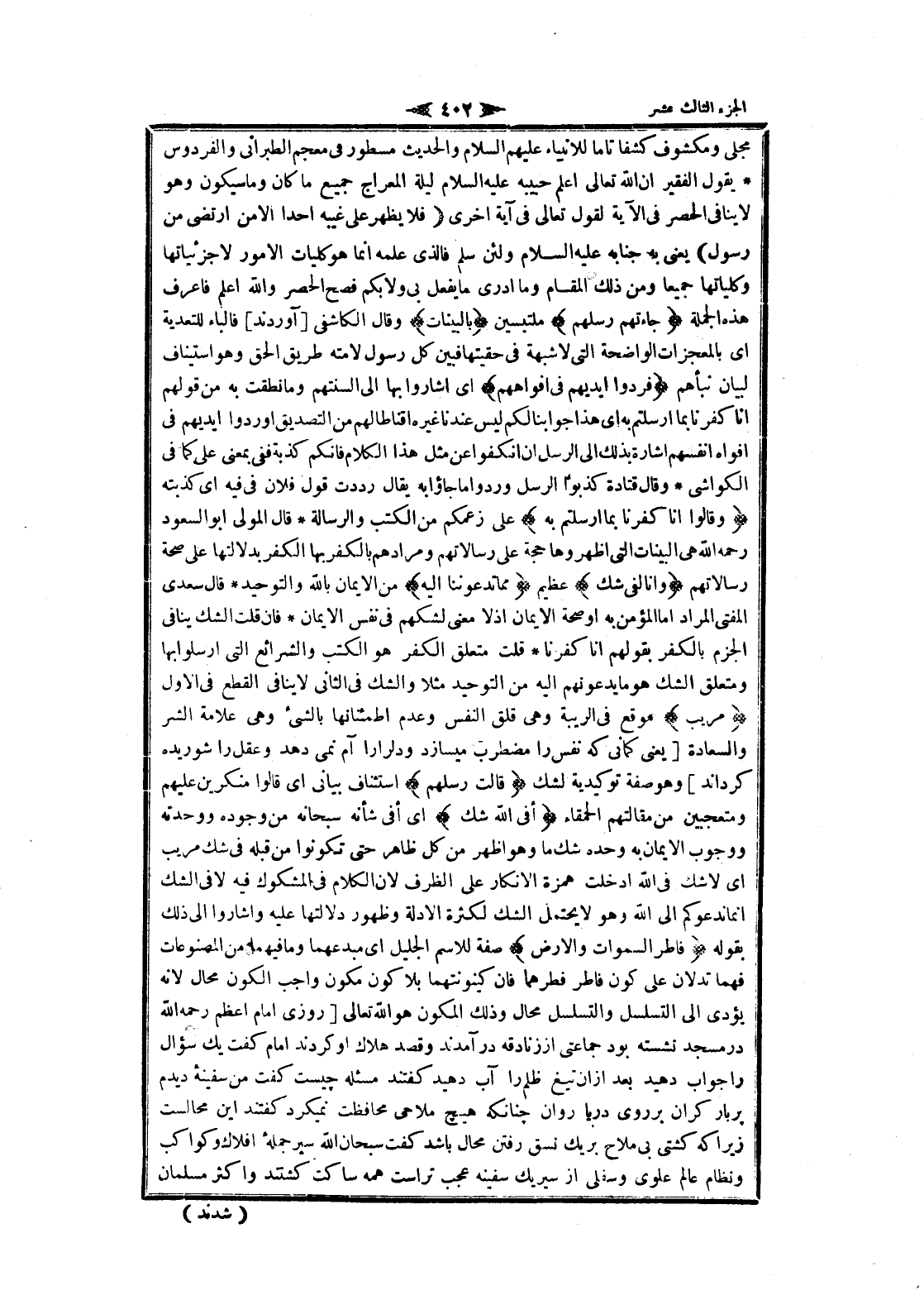 مجلى ومكشوف كشفا تاما للانبياء عليهم السلام والحديث مسطور فى معجم الطبراني والفردوس يقول الفقير ان الله تعالى اعلم حبيبه عليه السلام ليلة المعراج جميع ما كان وما سيكون وهو لا ينافى الحصر فى الآية لقول تعالى فى آية اخرى فَلا يُظْهِرُ عَلى غَيْبِهِ أَحَداً إِلَّا مَنِ ارْتَضى مِنْ رَسُولٍ يعنى به جنابه عليه السلام ولئن سلم فالذى علمه انما هو كليات الأمور لا جزئياتها وكلياتها جميعا ومن ذلك المقام وما أدرى ما يفعل بي ولا بكم فصح الحصر والله اعلم فاعرف هذه الجملة جاءَتْهُمْ رُسُلُهُمْ ملتبسين بِالْبَيِّناتِ وقال الكاشفى [آوردند] فالباء للتعدية اى بالمعجزات الواضحة التي لا شبهة فى حقيتها فبين كل رسول لامته طريق الحق وهو استيناف لبيان نبأهم فَرَدُّوا أَيْدِيَهُمْ فِي أَفْواهِهِمْ اى اشاروا بها الى ألسنتهم وما نطقت به من قولهم انا كفرنا بما أرسلتم به اى هذا جوابنا لكم ليس عندنا غيره إقناطا لهم من التصديق أوردوا أيديهم فى أفواه أنفسهم اشارة بذلك الى الرسل ان انكفوا عن مثل هذا الكلام فانكم كذبة ففى بمعنى على كما فى الكواشي وقال قتادة كذبوا الرسل وردوا ما جاؤا به يقال رددت قول فلان فى فيه اى كذبته وَقالُوا إِنَّا كَفَرْنا بِما أُرْسِلْتُمْ بِهِ على زعمكم من الكتب والرسالة قال المولى ابو السعود رحمه الله هى البينات التي أظهروها حجة على رسالاتهم ومرادهم بالكفر بها الكفر بدلالتها على صحة رسالاتهم وَإِنَّا لَفِي شَكٍّ عظيم مِمَّا تَدْعُونَنا إِلَيْهِ من الايمان بالله والتوحيد قال سعدى المفتى المراد اما المؤمن به او صحة الايمان إذ لا معنى لشكهم فى نفس الايمان فان قلت الشك ينافى الجزم بالكفر بقولهم انا كفرنا قلت متعلق الكفر هو الكتب والشرائع التي أرسلوا بها ومتعلق الشك هو ما يدعونهم اليه من التوحيد مثلا والشك فى الثاني لا ينافى القطع فى الاول مُرِيبٍ موقع فى الريبة وهى قلق النفس وعدم اطمئنانها بالشيء وهى علامة الشر والسعادة [يعنى كمانى كه نفس را مضطرب ميسازد ودلرا راآم؟؟؟ نمى دهد وعقل را شوريده كرداند] وهو صفة توكيدية لشك قالَتْ رُسُلُهُمْ استئناف بيانى اى قالوا منكرين عليهم ومتعجبين من مقالتهم الحمقاء أَفِي اللَّهِ شَكٌّ اى أفي شأنه سبحانه من وجوده ووحدته ووجوب الايمان به وحده شك ما وهو اظهر من كل ظاهر حتى تكونوا من قبله فى شك مريب اى لا شك فى الله ادخلت همزة الإنكار على الظرف لان الكلام فى المشكوك فيه لا فى الشك انما ندعوكم الى الله وهو لا يحتمل الشك لكثرة الادلة وظهور دلالتها عليه واشاروا الى ذلك بقوله فاطِرِ السَّماواتِ وَالْأَرْضِ صفة للاسم الجليل اى مبدعهما وما فيهما من المصنوعات فهما تدلان على كون فاطر فطرهما فان كينونتهما بلا كون مكون واجب الكون محال لانه يؤدى الى التسلسل والتسلسل محال وذلك المكون هو الله تعالى [روزى امام أعظم رحمه الله در مسجد نشسته بود جماعتى از زنادقه در آمدند وقصد هلاك او كردند امام كفت يك سؤال را جواب دهيد بعد از ان تيغ ظلم را آب دهيد كفتند مسئله چيست كفت من سفينه ديدم پر بار كران بر روى دريا روان چنانكه هيچ ملاحى محافظت نميكرد كفتند اين محالست زيرا كه كشتى بى ملاح بر يك نسق رفتن محال باشد كفت سبحان الله سير جمله أفلاك وكواكب ونظام عالم علوى وسفلى از سير يك سفينه عجب تر است همه ساكت كشتند واكثر مسلمان