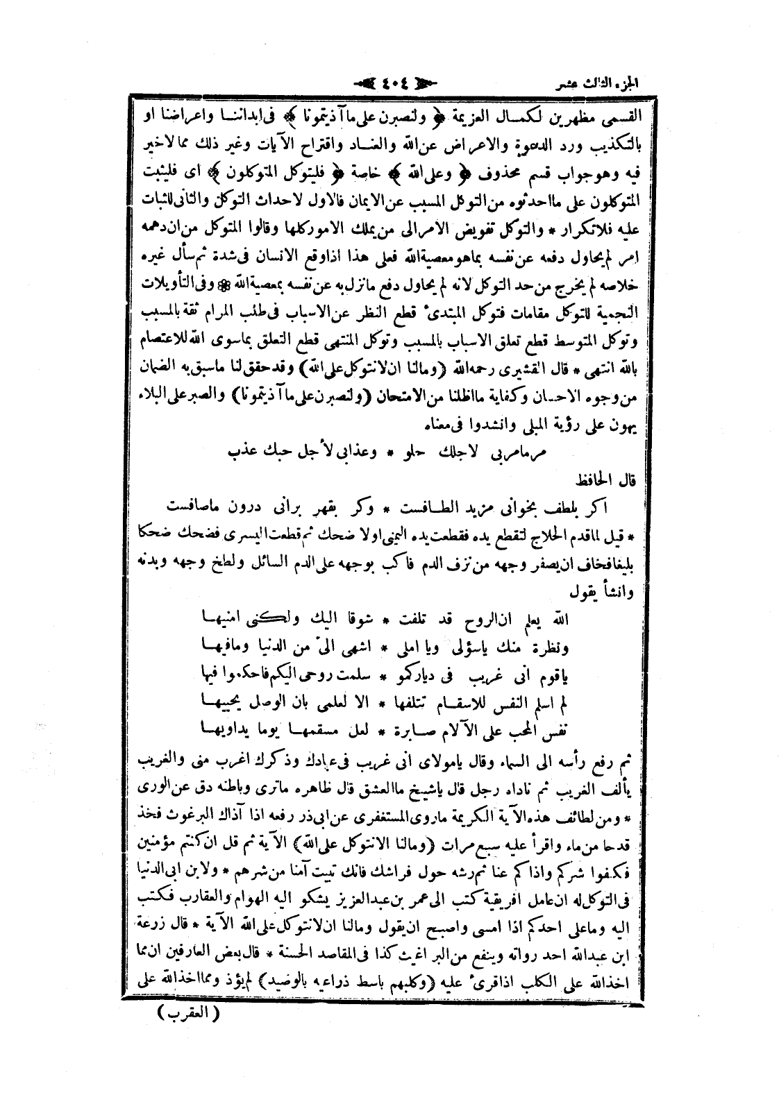 ثم رفع رأسه الى السماء وقال يا مولاى انى غريب فى عبادك وذكرك اغرب منى والغريب يألف الغريب ثم ناداه رجل قال يا شيخ ما العشق قال ظاهره ما ترى وباطنه دق عن الورى ومن لطائف هذه الآية الكريمة ما روى المستغفري عن ابى ذر رفعه إذا آذاك البرغوث فخذ قدحا من ماء واقرأ عليه سبع مرات وَما لَنا أَلَّا نَتَوَكَّلَ عَلَى اللَّهِ الآية ثم قل ان كنتم مؤمنين فكفوا شركم وإذا كم عنا ثم رشه حول فراشك فانك تبيت آمنا من شرهم ولابن ابى الدنيا فى التوكل له ان عامل افريقية كتب الى عمر بن عبد العزيز يشكو اليه الهوام والعقارب فكتب اليه وما على أحدكم إذا امسى وأصبح ان يقول وما لنا ان لا نتوكل على الله الآية قال زرعة ابن عبد الله أحد رواته وينفع من البراغيث كذا فى المقاصد الحسنة قال بعض العارفين ان مما أخذ الله على الكلب إذا قرئ عليه وَكَلْبُهُمْ باسِطٌ ذِراعَيْهِ بِالْوَصِيدِ لم يؤذ ومما أخذ الله على