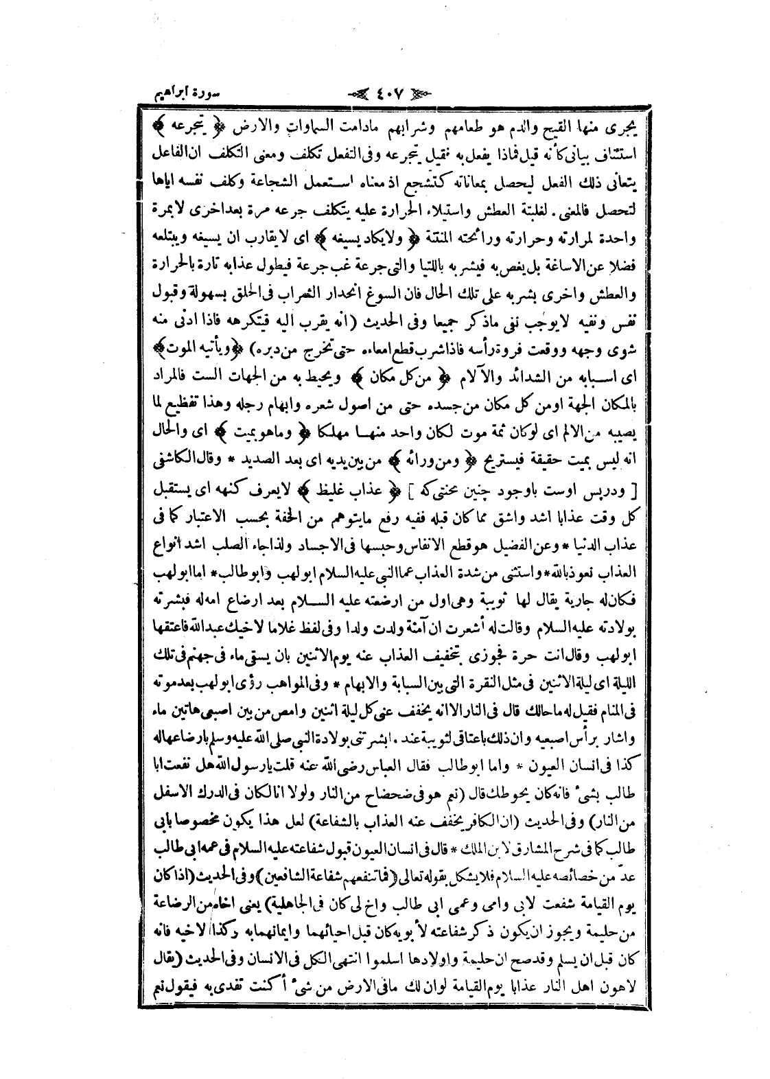 يجرى منها القبح والدم هو طعامهم وشرابهم ما دامت السماوات والأرض يَتَجَرَّعُهُ استئناف بيانى كأنه قيل فماذا يفعل به فقيل يتجرعه وفى التفعل تكلف ومعنى التكلف ان الفاعل يتعانى ذلك الفعل ليحصل بمعاناته كتشجع إذ معناه استعمل الشجاعة وكلف نفسه إياها لتحصل فالمعنى. لغلبتة العطش واستيلاء الحرارة عليه يتكلف جرعه مرة بعد اخرى لا بمرة واحدة لمرارته وحرارته ورائحته المنتنة وَلا يَكادُ يُسِيغُهُ اى لا يقارب ان يسيغه ويبتلعه فضلا عن الاساغة بل يغص به فيشر به باللتيا والتي جرعة غب جرعة فيطول عذابه تارة بالحرارة والعطش واخرى بشربه على تلك الحال فان السوغ انحدار الشراب فى الحلق بسهولة وقبول نفس ونفيه لا يوجب نفى ما ذكر جميعا وفى الحديث (انه يقرب اليه فيتكرهه فاذا ادنى منه شوى وجهه ووقعت فروة رأسه فاذا شرب قطع امعاءه حتى تخرج من دبره) وَيَأْتِيهِ الْمَوْتُ اى أسبابه من الشدائد والآلام مِنْ كُلِّ مَكانٍ ويحيط به من الجهات الست فالمراد بالمكان الجهة او من كل مكان من جسده حتى من اصول شعره وإبهام رجله وهذا تفظيع لما يصيبه من الألم اى لو كان ثمة موت لكان واحد منها مهلكا وَما هُوَ بِمَيِّتٍ اى والحال انه ليس بميت حقيقة فيستريح وَمِنْ وَرائِهِ من بين يديه اى بعد الصديد وقال الكاشفى [ودر پس اوست با وجود چنين محنتى كه] عَذابٌ غَلِيظٌ لا يعرف كنهه اى يستقبل كل وقت عذابا أشد وأشق مما كان قبله ففيه رفع ما يتوهم من الخفة بحسب الاعتبار كما فى عذاب الدنيا وعن الفضيل هو قطع الأنفاس وحبسها فى الأجساد ولذا جاء الصلب أشد انواع العذاب نعوذ بالله واستثنى من شدة العذاب عما النبي عليه السلام ابو لهب وابو طالب اما ابو لهب فكان له جارية يقال لها ثويبة وهى أول من ارضعته عليه السلام بعد إرضاع امه له فبشرته بولادته عليه السلام وقالت له أشعرت ان آمنة ولدت ولدا وفى لفظ غلاما لاخيك عبد الله فاعتقها ابو لهب وقال أنت حرة فجوزى بتخفيف العذاب عنه يوم الاثنين بان يسقى ماء فى جهنم فى تلك الليلة اى ليلة الاثنين فى مثل النقرة التي بين السبابة والإبهام وفى المواهب رؤى ابو لهب بعد موته فى المنام فقيل له ما حالك قال فى النار الا انه يخفف عنى كل ليلة اثنين وامص من بين إصبعي هاتين ماء وأشار برأس إصبعيه وان ذلك باعتاقى لثويبة عند ما بشرتنى بولادة النبي صلى الله عليه وسلم بارضاعها له كذا فى انسان العيون واما ابو طالب فقال العباس رضى الله عنه قلت يا رسول الله هل نفعت أبا طالب بشئ فانه كان يحوطك قال (نعم هو فى ضحضاح من النار ولولا انا لكان فى الدرك الأسفل من النار) وفى الحديث (ان الكافر يخفف عنه العذاب بالشفاعة) لعل هذا يكون مخصوصا بابى طالب كما فى شرح المشارق لابن الملك قال فى انسان العيون قبول شفاعته عليه السلام فى عمه ابى طالب عدّ من خصائصه عليه السلام فلا يشكل بقوله تعالى فَما تَنْفَعُهُمْ شَفاعَةُ الشَّافِعِينَ وفى الحديث (إذا كان يوم القيامة شفعت لابى وأمي وعمى ابى طالب وأخ لى كان فى الجاهلية) يعنى أخاه من الرضاعة من حليمة ويجوز ان يكون ذكر شفاعته لأبويه كان قبل احيائهما وإيمانهما به وكذا لاخيه فانه كان قبل ان يسلم وقد صح ان حليمة وأولادها اسلموا انتهى الكل فى الإنسان وفى الحديث (يقال لاهون اهل النار عذابا يوم القيامة لو ان لك ما فى الأرض من شىء أكنت تفدى به فيقول نعم