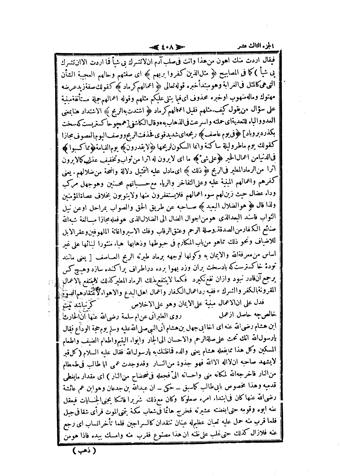 فيقال أردت منك أهون من هذا وأنت فى صلب آدم ان لا تشرك بي شيأ فما أردت الا ان تشرك بي شيأ) كما فى المصابيح مَثَلُ الَّذِينَ كَفَرُوا بِرَبِّهِمْ اى صفتهم وحالهم العجيبة الشأن التي هى كالمثل فى الغرابة وهو مبتدأ خبره قوله تعالى أَعْمالُهُمْ كَرَمادٍ كقولك صفة زيد عرضه مهتوك وماله منهوب او خبره محذوف اى فيما يتلى عليكم مثلهم وقوله أعمالهم جملة مستأنفة مبنية على سؤال من يقول كيف مثلهم فقيل أعمالهم كرماد اشْتَدَّتْ بِهِ الرِّيحُ الاشتداد هنا بمعنى العدو والباء للتعدية اى حملته وأسرعت فى الذهاب به وقال الكاشفى [همچوخاكستريست كه سخت بگذرد بر وباد] فِي يَوْمٍ عاصِفٍ ريحه اى شديد قوى فحذفت الريح ووصف اليوم بالعصوف مجازا كقولك يوم ماطر وليلة ساكنة وانما السكون لريحها لا يَقْدِرُونَ يوم القيامة مِمَّا كَسَبُوا فى الدنيا من اعمال الخير عَلى شَيْءٍ ما اى لا يرون له اثرا من ثواب وتخفيف عذاب كما لا يرون اثرا من الرماد المطير فى الريح ذلِكَ اى ما دل عليه التمثيل دلالة واضحة من ضلالهم. يعنى كفرهم وأعمالهم المبنية عليه وعلى التفاخر والرياء مع حسبانهم محسنين وهو جهل مركب وداء عضال حيث زين لهم سوء أعمالهم فلا يستغفرون منها ولا يتوبون بخلاف عصاة المؤمنين ولذا قال هُوَ الضَّلالُ الْبَعِيدُ صاحبه عن طريق الحق والصواب بمراحل او عن نيل الثواب فاسند البعد الذي هو من احوال الضال الى الضلال الذي هو فعله مجازا مبالغة شبه الله صنائع الكفار من الصدقة وصلة الرحم وعتق الرقاب وفك الأسير واغاثة الملهوفين وعقر الإبل للاضياف ونحو ذلك مما هو من باب المكارم فى حبوطها وذهابها هباء منثورا لبنائها على غير أساس من معرفة الله والايمان به وكونها لوجهه برماد طيرته الريح العاصف [يعنى مانند توده خاكسترست كه باد سخت بر ان وزد بهوا برده در أطراف پراكنده سازد وهيچ كس بر جمع آن قادر نبود واز ان نفع نكيرد فكما لا ينتفع بذلك الرماد المطير كذلك لا ينتفع بالأعمال المقرونة بالكفر والشرك ففيه رد اعمال الكفار واعمال اهل البدع والأهواء لاعتقادهم السوء فدل على ان الأعمال مبنية على الايمان وهو على الإخلاص كر نباشد نيت خالص چهـ حاصل از عمل روى الطبراني عن أم سلمة رضى الله عنها ان الحارث ابن هشام رضى الله عنه اى أخا ابى جهل بن هشام اتى النبي صلى الله عليه وسلم يوم حجة الوداع فقال يا رسول الله انك تحث على صلة الرحم والإحسان الى الجار وإيواء اليتيم واطعام الضيف واطعام المسكين وكل هذا مما يفعله هشام يعنى والده فما ظنك به يا رسول الله فقال عليه السلام (كل قبر لا يشهد صاحبه ان لا اله الا الله فهو جذوة من النار وقد وجدت عمى أبا طالب فى طمطام من النار فاخرجه الله لمكانه منى وإحسانه الىّ فجعله فى ضحضاح من النار) اى مقدار ما يغطى قدميه وهذا مخصوص بابى طالب كما سبق- حكى- ان عبد الله بن جدعان وهو ابن عم عائشة رضى الله عنها كان فى ابتداء امره صعلوكا وكان مع ذلك شريرا فاتكا يجنى الجنايات فيعقل عنه أبوه وقومه حتى أبغضته عشيرته فخرج هائما فى شعاب مكة يتمنى الموت فرأى شقا فى جبل فلما قرب منه حمل عليه ثعبان عظيم له عينان تتقدان كالسراجين فلما تأخر انساب اى رجع عنه فلا زال كذلك حتى غلب على ظنه ان هذا مصنوع فقرب منه وامسك بيده فاذا هو من