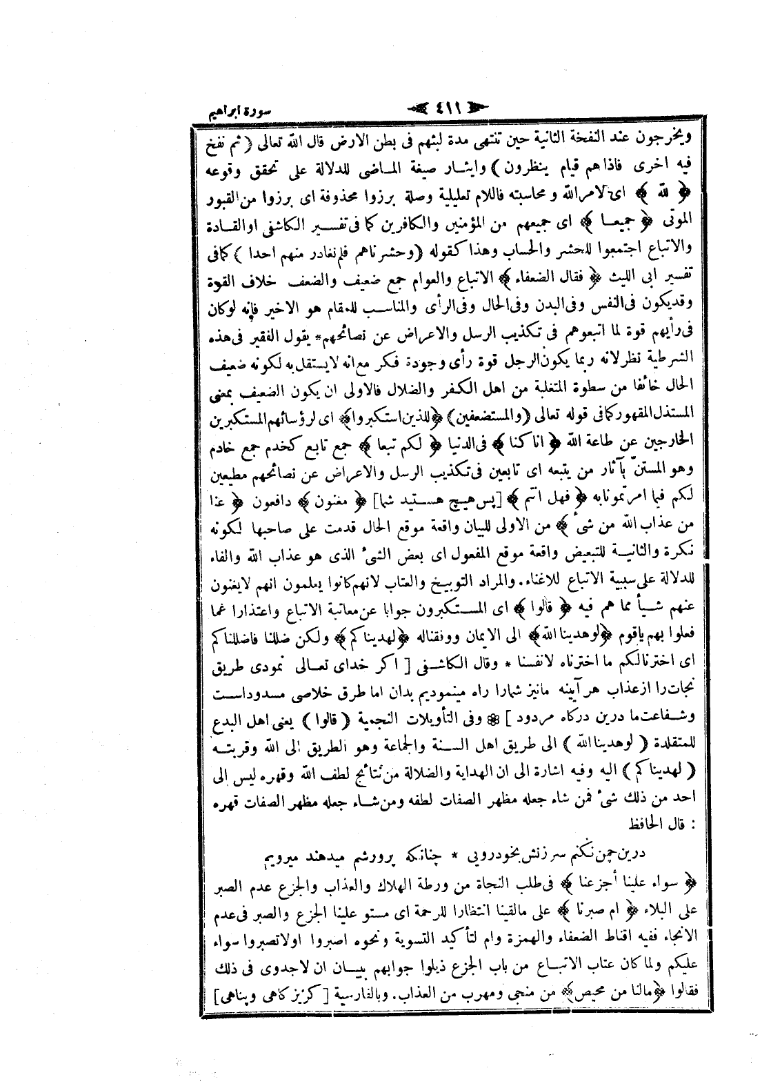 به لكونه ضعيف الحال خائفا من سطوة المتغلبة من اهل الكفر والضلال فالاولى ان يكون الضعيف بمعنى المستذل المقهور كما فى قوله تعالى وَالْمُسْتَضْعَفِينَ لِلَّذِينَ اسْتَكْبَرُوا اى لرؤسائهم المستكبرين الخارجين عن طاعة الله إِنَّا كُنَّا فى الدنيا لَكُمْ تَبَعاً جمع تابع كخدم جمع خادم وهو المستنّ بآثار من يتبعه اى تابعين فى تكذيب الرسل والاعراض عن نصائحهم مطيعين لكم فيما أمرتمونا به فَهَلْ أَنْتُمْ [پس هيچ هستيد شما] مُغْنُونَ دافعون عَنَّا مِنْ عَذابِ اللَّهِ مِنْ شَيْءٍ من الاولى للبيان واقعة موقع الحال قدمت على صاحبها لكونه نكرة والثانية للتبعيض واقعة موقع المفعول اى بعض الشيء الذي هو عذاب الله والفاء للدلالة على سببية الاتباع للاغناء والمراد التوبيخ والعتاب لانهم كانوا يعلمون انهم لا يغنون عنهم شيأ مما هم فيه قالُوا اى المستكبرون جوابا عن معاتبة الاتباع واعتذارا عما فعلوا بهم يا قوم لَوْ هَدانَا اللَّهُ الى الايمان ووفقنا له لَهَدَيْناكُمْ ولكن ضللنا فاضللناكم اى اخترنا لكم ما اخترناه لانفسنا وقال الكاشفى [اگر خداى تعالى نمودى طريق نجات را از عذاب هر آيينه ما نيز شما را راه مينموديم بدان اما طرق خلاصى مسدود است وشفاعت ما درين دركاه مردود] وفى التأويلات النجمية قالُوا يعنى اهل البدع للمتقلدة لَوْ هَدانَا اللَّهُ الى طريق اهل السنة والجماعة وهو الطريق الى الله وقربته لَهَدَيْناكُمْ اليه وفيه اشارة الى ان الهداية والضلالة من نتائج لطف الله وقهره ليس الى أحد من ذلك شىء فمن شاء جعله مظهر الصفات لطفه ومن شاء جعله مظهر الصفات قهره: قال الحافظ