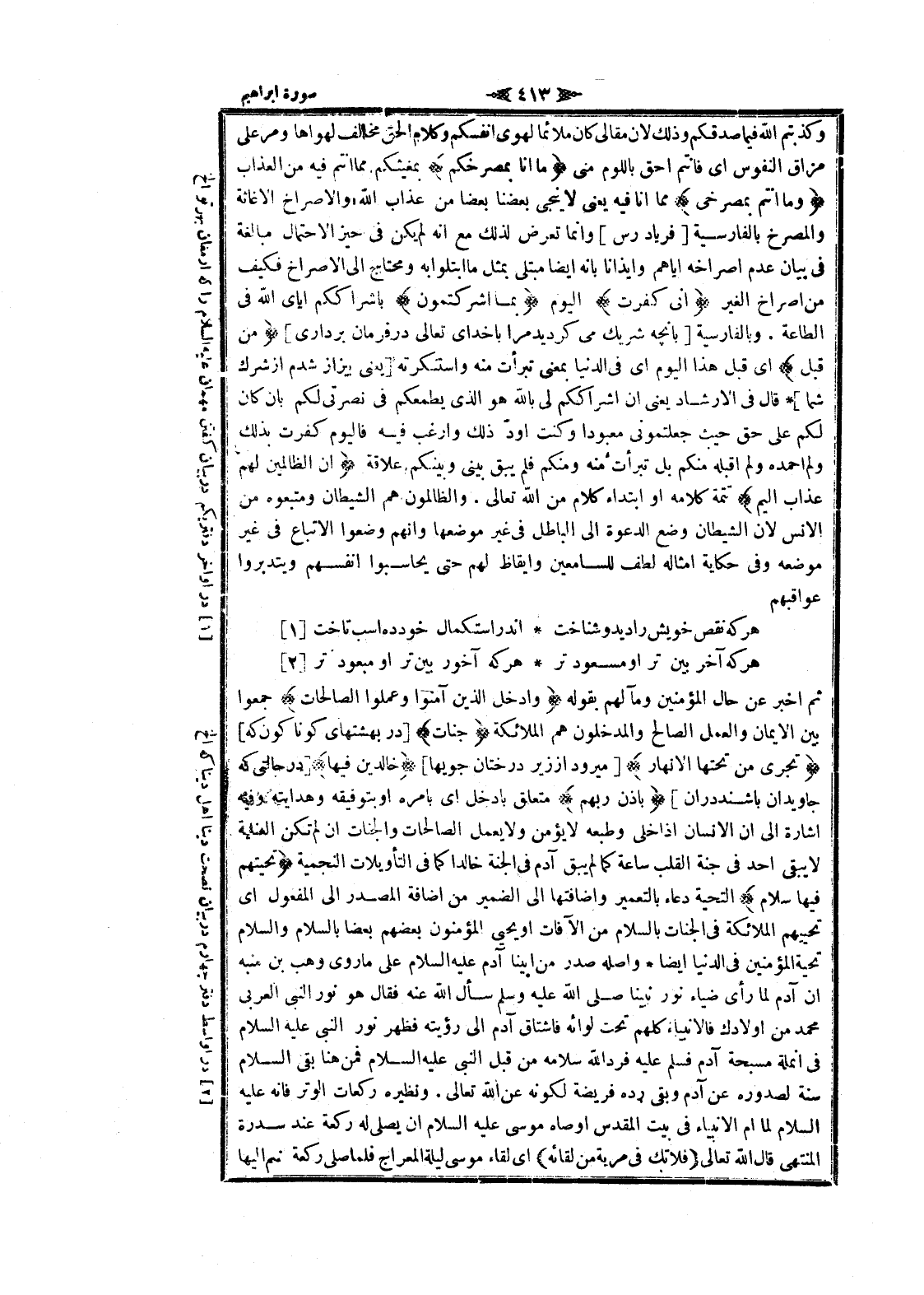 ثم اخبر عن حال المؤمنين ومآلهم بقوله وَأُدْخِلَ الَّذِينَ آمَنُوا وَعَمِلُوا الصَّالِحاتِ جمعوا بين الايمان والعمل الصالح والمدخلون هم الملائكة جَنَّاتٍ [در بهشتهاى كوناكون كه] تَجْرِي مِنْ تَحْتِهَا الْأَنْهارُ [ميرود از زير درختان جويها] خالِدِينَ فِيها [در حالتى كه جاويدان باشند دران] بِإِذْنِ رَبِّهِمْ متعلق بادخل اى بامره او بتوفيقه وهدايته وفيه اشارة الى ان الإنسان إذا خلى وطبعه لا يؤمن ولا يعمل الصالحات والجنات ان لم تكن العناية لا يبقى أحد فى جنة القلب ساعة كما لم يبق آدم فى الجنة خالدا كما فى التأويلات النجمية تَحِيَّتُهُمْ فِيها سَلامٌ التحية دعاء بالتعمير واضافتها الى الضمير من اضافة المصدر الى المفعول اى تحييهم الملائكة فى الجنات بالسلام من الآفات او يحيى المؤمنون بعضهم بعضا بالسلام والسلام تحية المؤمنين فى الدنيا ايضا وأصله صدر من أبينا آدم عليه السلام على ما روى وهب بن منبه ان آدم لما رأى ضياء نور نبينا صلى الله عليه وسلم سأل الله عنه فقال هو نور النبي العربي محمد من أولادك فالانبياء كلهم تحت لوائه فاشتاق آدم الى رؤيته فظهر نور النبي عليه السلام فى انملة مسبحة آدم فسلم عليه فرد الله سلامه من قبل النبي عليه السلام فمن هنا بقي السلام سنة لصدوره عن آدم وبقي رده فريضة لكونه عن الله تعالى. ونظيره ركعات الوتر فانه عليه السلام لما أم الأنبياء فى بيت المقدس أوصاه موسى عليه السلام ان يصلى له ركعة عند سدرة المنتهى قال الله تعالى فَلا تَكُنْ فِي مِرْيَةٍ مِنْ لِقائِهِ اى لقاء موسى ليلة المعراج فلما صلى ركعة ضم إليها