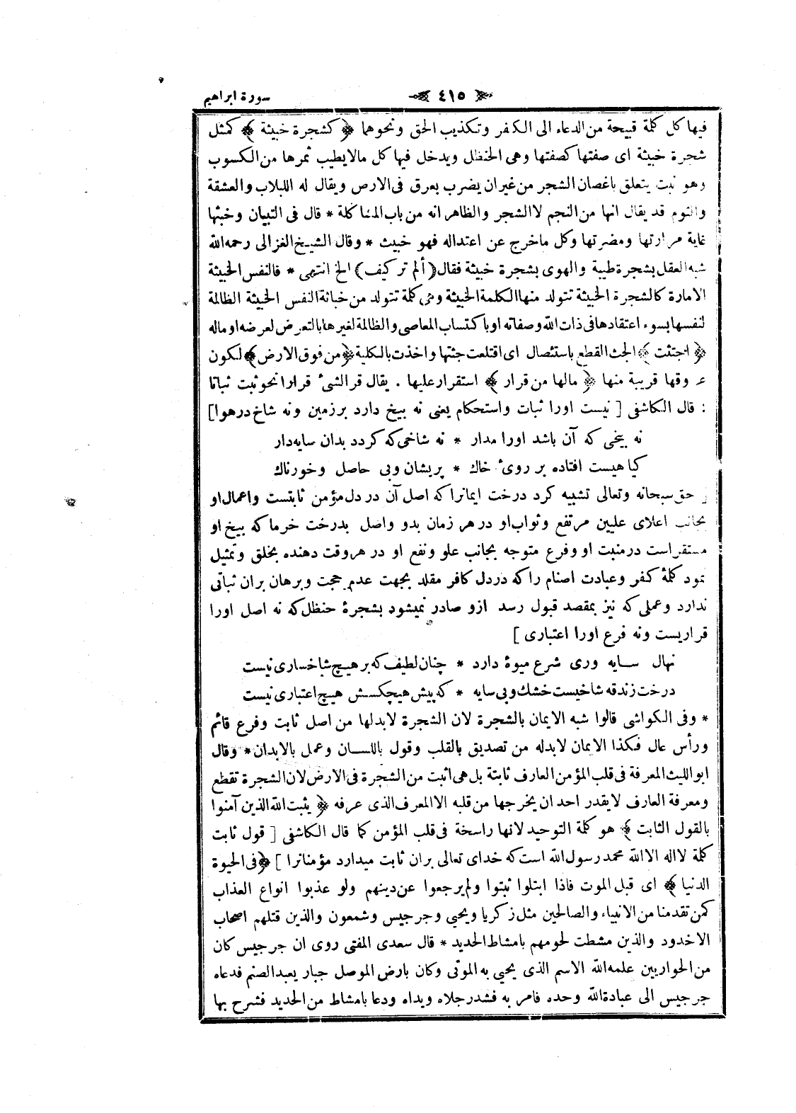 [حق سبحانه وتعالى تشبيه كرد درخت ايمانرا كه اصل آن در دل مؤمن ثابتست واعمال او بجانب اعلاى عليين مرتفع وثواب او در هر زمان بدو واصل بدرخت خرما كه بيخ او مستقر است در منبت او وفرع متوجه بجانب علو ونفع او در هر وقت دهنده بخلق وتمثيل نمود كلمه كفر وعبادت أصنام را كه در دل كافر مقلد بجهت عدم حجت وبرهان بران ثباتى ندارد وعملى كه نيز بمقصد قبول رسد ازو صادر نميشود بشجره حنظل كه نه اصل او را قراريست ونه فرع او را اعتباري]