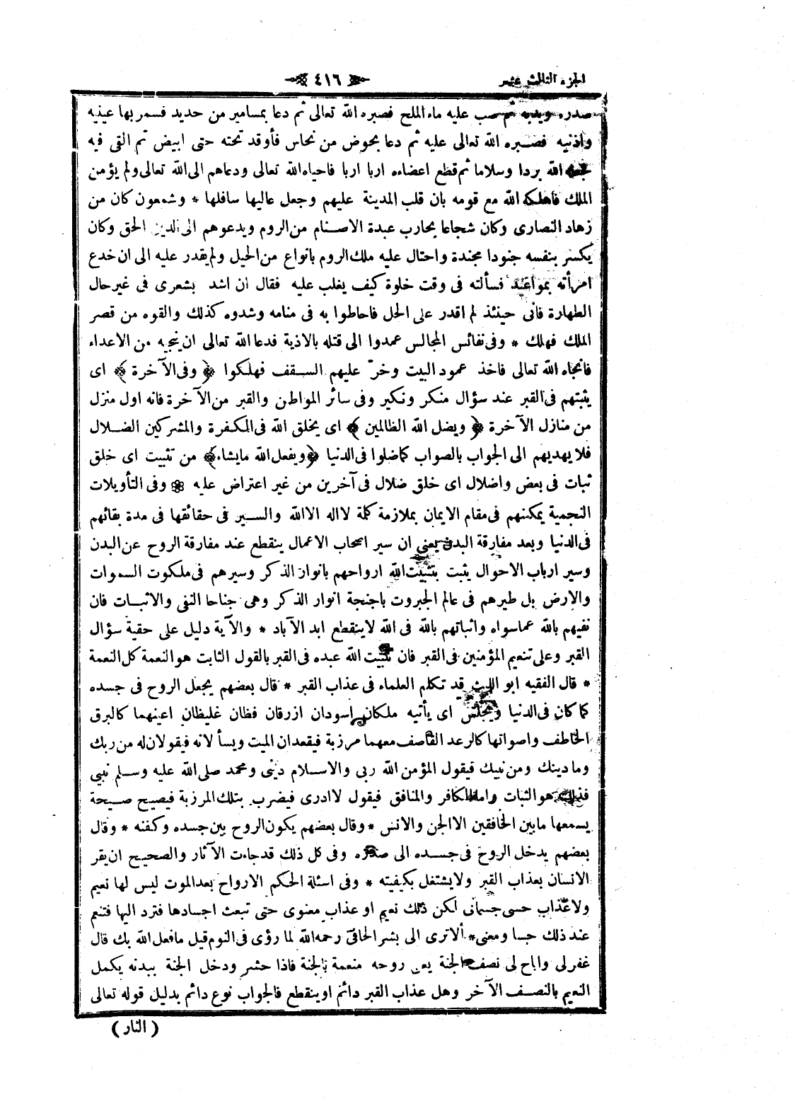 حتى تبعث أجسادها فترد إليها فتنعم عند ذلك حسا ومعنى ألا ترى الى بشر الحافى رحمه الله لما رؤى فى النوم قيل ما فعل الله بك قال غفر لى وأباح لى نصف الجنة يعنى روحه منعمة بالجنة فاذا حشر ودخل الجنة ببدنه يكمل النعيم بالنصف الآخر وهل عذاب القبر دائم او ينقطع فالجواب نوع دائم بدليل قوله تعالى