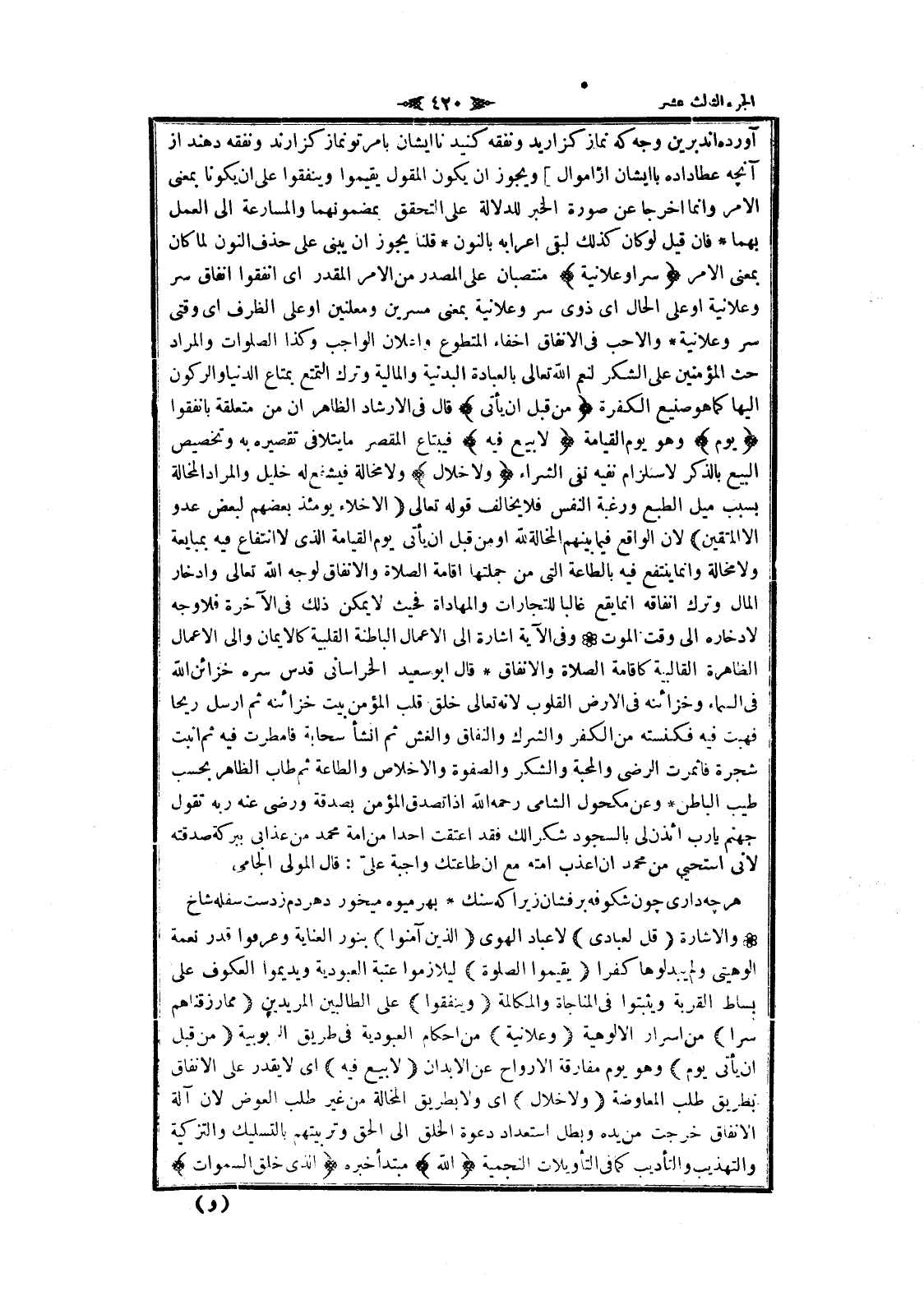 آورده اند برين وجه كه نماز كزاريد ونفقه كنيد تا ايشان بامر تو نماز كزارند ونفقه دهند از آنچهـ عطا داده با ايشان از اموال] ويجوز ان يكون المقول يقيموا وينفقوا على ان يكونا بمعنى الأمر وانما اخرجا عن صورة الخبر للدلالة على التحقق بمضمونهما والمسارعة الى العمل بهما فان قيل لو كان كذلك لبقى إعرابه بالنون قلنا يجوز ان يبنى على حذف النون لما كان بمعنى الأمر سِرًّا وَعَلانِيَةً منتصبان على المصدر من الأمر المقدر اى أنفقوا انفاق سر وعلانية او على الحال اى ذوى سر وعلانية بمعنى مسرين ومعلنين او على الظرف اى وقتى سر وعلانية والأحب فى الانفاق إخفاء المتطوع وإعلان الواجب وكذا الصلوات والمراد حث المؤمنين على الشكر لنعم الله تعالى بالعبادة البدنية والمالية وترك التمتع بمتاع الدنيا والركون إليها كما هو صنيع الكفرة مِنْ قَبْلِ أَنْ يَأْتِيَ قال فى الإرشاد الظاهر ان من متعلقة بانفقوا يَوْمٌ وهو يوم القيامة لا بَيْعٌ فِيهِ فيبتاع المقصر ما يتلافى تقصيره به وتخصيص البيع بالذكر لاستلزام نفيه نفى الشراء وَلا خِلالٌ ولا مخالة فيشفع له خليل والمراد المخالة بسبب ميل الطبع ورغبة النفس فلا يخالف قوله تعالى الْأَخِلَّاءُ يَوْمَئِذٍ بَعْضُهُمْ لِبَعْضٍ عَدُوٌّ إِلَّا الْمُتَّقِينَ لان الواقع فيما بينهم المخالة لله او من قبل ان يأتى يوم القيامة الذي لا انتفاع فيه بمبايعة ولا مخالة وانما ينتفع فيه بالطاعة التي من جملتها اقامة الصلاة والانفاق لوجه الله تعالى وادخار المال وترك إنفاقه انما يقع غالبا للتجارات والمهاداة فحيث لا يمكن ذلك فى الآخرة فلا وجه لادخاره الى وقت الموت وفى الآية اشارة الى الأعمال الباطنة القلبية كالايمان والى الأعمال الظاهرة القالبية كاقامة الصلاة والانفاق قال ابو سعيد الخراسانى قدس سره خزائن الله فى السماء وخزائنه فى الأرض القلوب لانه تعالى خلق قلب المؤمن بيت خزائنه ثم أرسل ريحا فهبت فيه فكنسته من الكفر والشرك والنفاق والغش ثم انشأ سحابة فامطرت فيه ثم أنبت شجرة فاثمرت الرضى والمحبة والشكر والصفوة والإخلاص والطاعة ثم طاب الظاهر بحسب طيب الباطن وعن مكحول الشامي رحمه الله إذا تصدق المؤمن بصدقة ورضى عنه ربه تقول جهنم يا رب ائذن لى بالسجود شكرا لك فقد اعتقت أحدا من امة محمد من عذابى ببركة صدقته لانى استحيى من محمد ان أعذب أمته مع ان طاعتك واجبة علىّ: قال المولى الجامى