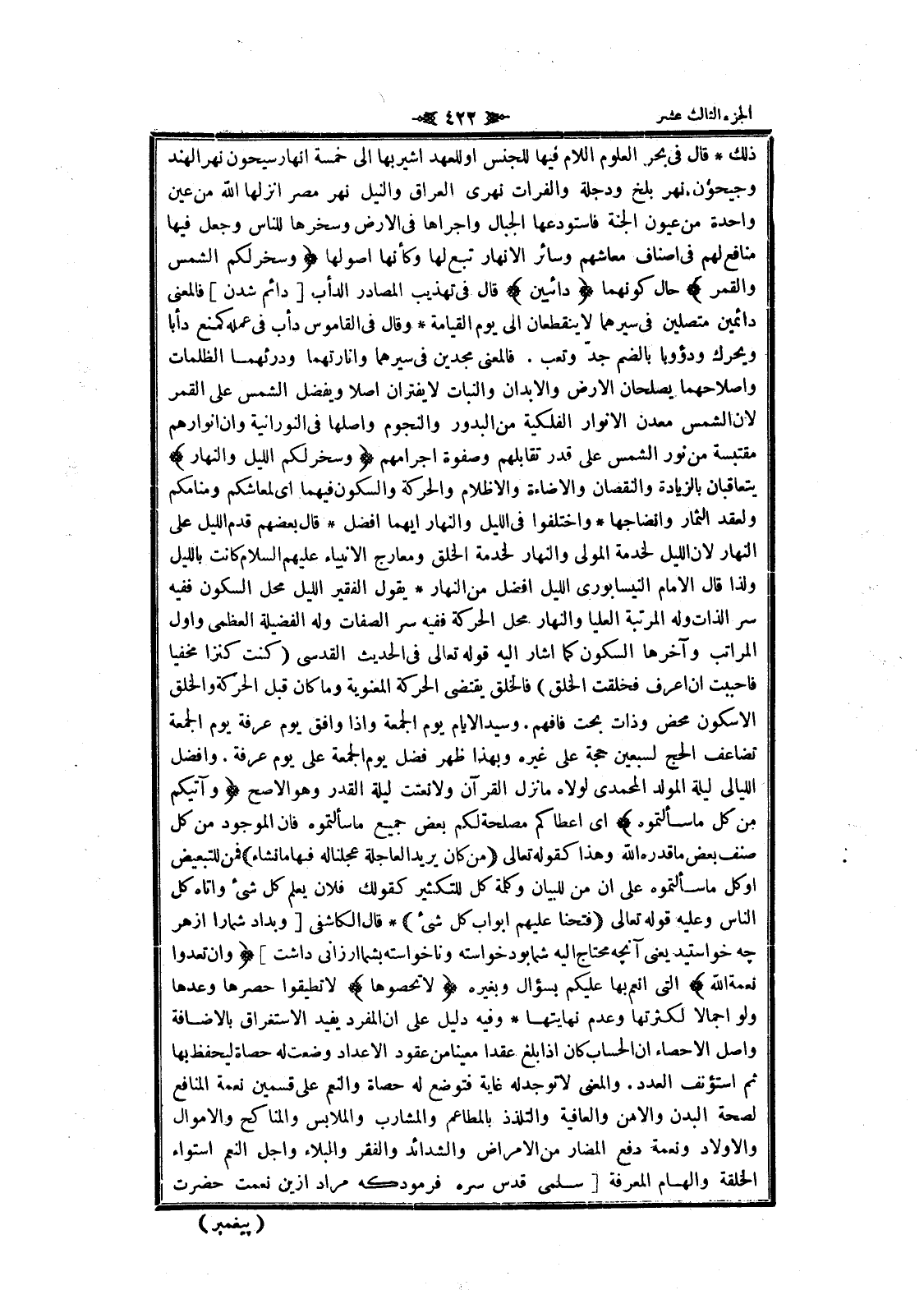 ذلك قال فى بحر العلوم اللام فيها للجنس او للعهد أشير بها الى خمسة انهار سيحون نهر الهند وجيحون نهر بلخ ودجلة والفرات نهرى العراق والنيل نهر مصر أنزلها الله من عين واحدة من عيون الجنة فاستودعها الجبال وأجراها فى الأرض وسخرها للناس وجعل فيها منافع لهم فى اصناف معاشهم وسائر الأنهار تبع لها وكأنها أصولها وَسَخَّرَ لَكُمُ الشَّمْسَ وَالْقَمَرَ حال كونهما دائِبَيْنِ قال فى تهذيب المصادر الدأب [دائم شدن] فالمعنى دائمين متصلين فى سيرهما لا ينقطعان الى يوم القيامة وقال فى القاموس دأب فى عمله كمنع دأبا ويحرك ودؤوبا بالضم جدّ وتعب. فالمعنى مجدين فى سيرهما وانارتهما ودرئهما الظلمات واصلاحهما يصلحان الأرض والأبدان والنبات لا يفتران أصلا ويفضل الشمس على القمر لان الشمس معدن الأنوار الفلكية من البدور والنجوم وأصلها فى النورانية وان أنوارهم مقتبسة من نور الشمس على قدر تقابلهم وصفوة اجرامهم وَسَخَّرَ لَكُمُ اللَّيْلَ وَالنَّهارَ يتعاقبان بالزيادة والنقصان والاضاءة والاظلام والحركة والسكون فيهما اى لمعاشكم ومنامكم ولعقد الثمار وانضاجها واختلفوا فى الليل والنهار أيهما أفضل قال بعضهم قدم الليل على النهار لان الليل لخدمة المولى والنهار لخدمة الخلق ومعارج الأنبياء عليهم السلام كانت بالليل ولذا قال الامام النيسابورى الليل أفضل من النهار يقول الفقير الليل محل السكون ففيه سر الذات وله المرتبة العليا والنهار محل الحركة ففيه سر الصفات وله الفضيلة العظمى وأول المراتب وآخرها السكون كما أشار اليه قوله تعالى فى الحديث القدسي (كنت كنزا مخفيا فاحببت ان اعرف فخلقت الخلق) فالخلق يقتضى الحركة المعنوية وما كان قبل الحركة والخلق إلا سكون محض وذات بحت فافهم. وسيد الأيام يوم الجمعة وإذا وافق يوم عرفة يوم الجمعة تضاعف الحج لسبعين حجة على غيره وبهذا ظهر فضل يوم الجمعة على يوم عرفة. وأفضل الليالى ليلة المولد المحمدي لو لاه ما نزل القرآن ولا نعتت ليلة القدر وهو الأصح وَآتاكُمْ مِنْ كُلِّ ما سَأَلْتُمُوهُ اى اعطاكم مصلحة لكم بعض جميع ما سألتموه فان الموجود من كل صنف بعض ما قدره الله وهذا كقوله تعالى مَنْ كانَ يُرِيدُ الْعاجِلَةَ عَجَّلْنا لَهُ فِيها ما نَشاءُ