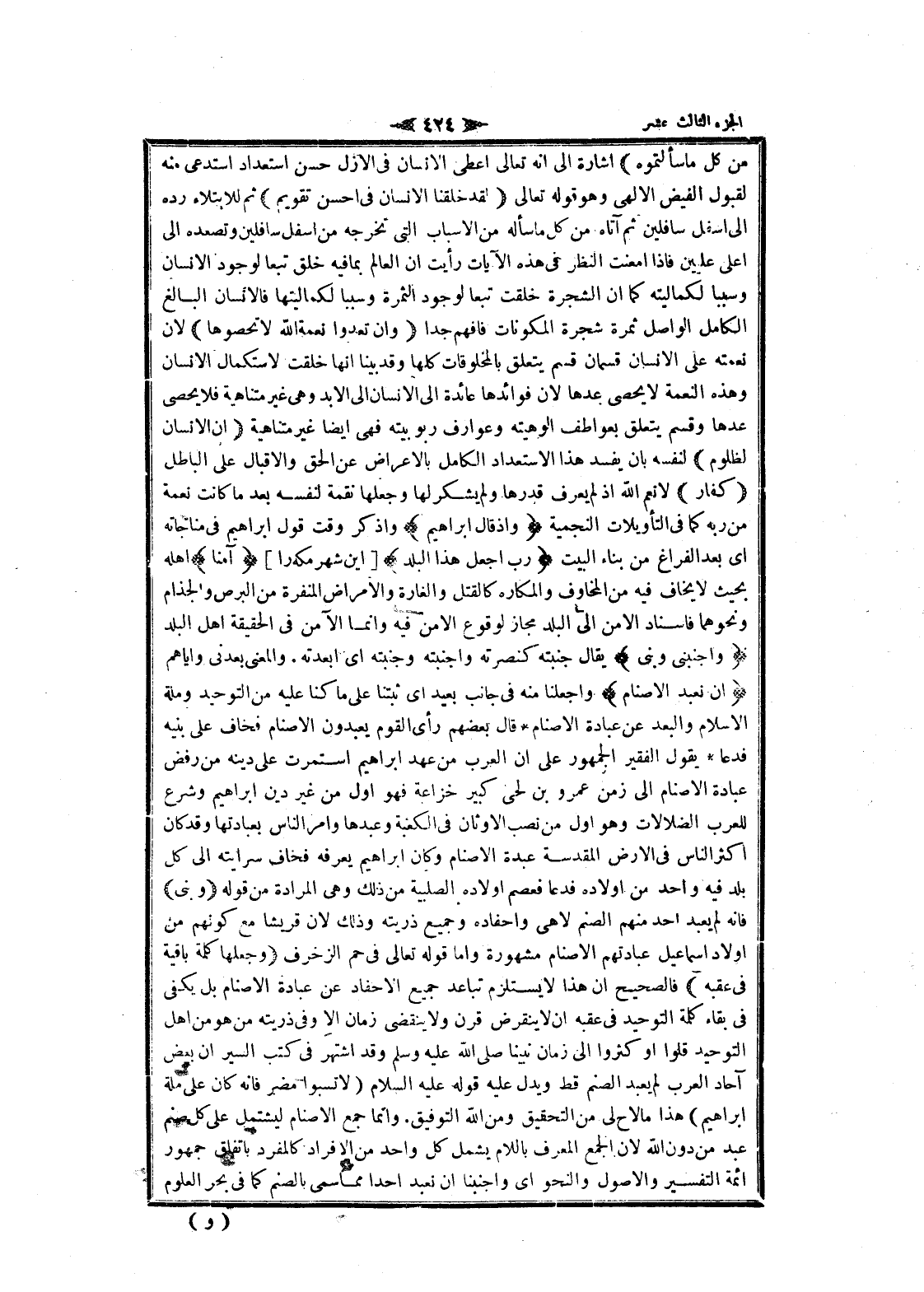 اشارة الى انه تعالى اعطى الإنسان فى الأزل حسن استعداد استدعى منه لقبول الفيض الإلهي وهو قوله تعالى لَقَدْ خَلَقْنَا الْإِنْسانَ فِي أَحْسَنِ تَقْوِيمٍ ثم للابتلاء رده الى أسفل سافلين ثم آتاه من كل ما سأله من الأسباب التي تخرجه من أسفل سافلين وتصعده الى أعلى عليين فاذا أمعنت النظر فى هذه الآيات رأيت ان العالم بما فيه خلق تبعا لوجود الإنسان وسببا لكماليته كما ان الشجرة خلقت تبعا لوجود الثمرة وسببا لكماليتها فالانسان البالغ الكامل الواصل ثمرة شجرة المكونات فافهم جدا وَإِنْ تَعُدُّوا نِعْمَةَ اللَّهِ لا تُحْصُوها لان نعمته على الإنسان قسمان قسم يتعلق بالمخلوقات كلها وقد بينا انها خلقت لاستكمال الإنسان وهذه النعمة لا يحصى عدها لان فوائدها عائدة الى الإنسان الى الابد وهى غير متناهية فلا يحصى عدها وقسم يتعلق بعواطف ألوهيته وعوارف ربوبيته فهى ايضا غير متناهية إِنَّ الْإِنْسانَ لَظَلُومٌ لنفسه بان يفسد هذا الاستعداد الكامل بالاعراض عن الحق والإقبال على الباطل كَفَّارٌ لا نعم الله إذ لم يعرف قدرها ولم يشكر لها وجعلها نقمة لنفسه بعد ما كانت نعمة من ربه كما فى التأويلات النجمية وَإِذْ قالَ إِبْراهِيمُ واذكر وقت قول ابراهيم فى مناجاته اى بعد الفراغ من بناء البيت رَبِّ اجْعَلْ هَذَا الْبَلَدَ [اين شهر مكه را] آمِناً اهله بحيث لا يخاف فيه من المخاوف والمكاره كالقتل والغارة والأمراض المنفرة من البرص والجذام ونحوهما فاسناد الامن الى البلد مجاز لوقوع الامن فيه وانما الآمن فى الحقيقة اهل البلد وَاجْنُبْنِي وَبَنِيَّ يقال جنبته كنصرته واجنبته وجنبته اى أبعدته. والمعنى بعدنى وإياهم أَنْ نَعْبُدَ الْأَصْنامَ واجعلنا منه فى جانب بعيد اى ثبتنا على ما كنا عليه من التوحيد وملة الإسلام والبعد عن عبادة الأصنام قال بعضهم رأى القوم يعبدون الأصنام فخاف على بنيه فدعا يقول الفقير الجمهور على ان العرب من عهد ابراهيم استمرت على دينه من رفض عبادة الأصنام الى زمن عمرو بن لحى كبير خزاعة فهو أول من غير دين ابراهيم وشرع للعرب الضلالات وهو أول من نصب الأوثان فى الكعبة وعبدها وامر الناس بعبادتها وقد كان اكثر الناس فى الأرض المقدسة عبدة الأصنام وكان ابراهيم يعرفه فخاف سرايته الى كل بلد فيه واحد من أولاده فدعا فعصم أولاده الصلبية من ذلك وهى المرادة من قوله وَبَنِيَّ فانه لم يعبد أحد منهم الصنم لاهى وأحفاده وجميع ذريته وذلك لان قريشا مع كونهم من أولاد إسماعيل عبادتهم الأصنام مشهورة واما قوله تعالى فى حم الزخرف وَجَعَلَها كَلِمَةً باقِيَةً فِي عَقِبِهِ فالصحيح ان هذا لا يستلزم تباعد جميع الأحفاد عن عبادة الأصنام بل يكفى فى بقاء كلمة التوحيد فى عقبه ان لا ينقرض قرن ولا ينقضى زمان الا وفى ذريته من هو من اهل التوحيد قلوا او كثروا الى زمان نبينا صلى الله عليه وسلم وقد اشتهر فى كتب السير ان بعض آحاد العرب لم يعبد الصنم قط ويدل عليه قوله عليه السلام (لا تسبوا مضر فانه كان على ملة ابراهيم) هذا ما لاح لى من التحقيق ومن الله التوفيق. وانما جمع الأصنام ليشتمل على كل صنم عبد من دون الله لان الجمع المعرف باللام يشمل كل واحد من الافراد كالمفرد باتفاق جمهور ائمة التفسير والأصول والنحو اى واجنبنا ان نعبد أحدا مما سمى بالصنم كما فى بحر العلوم