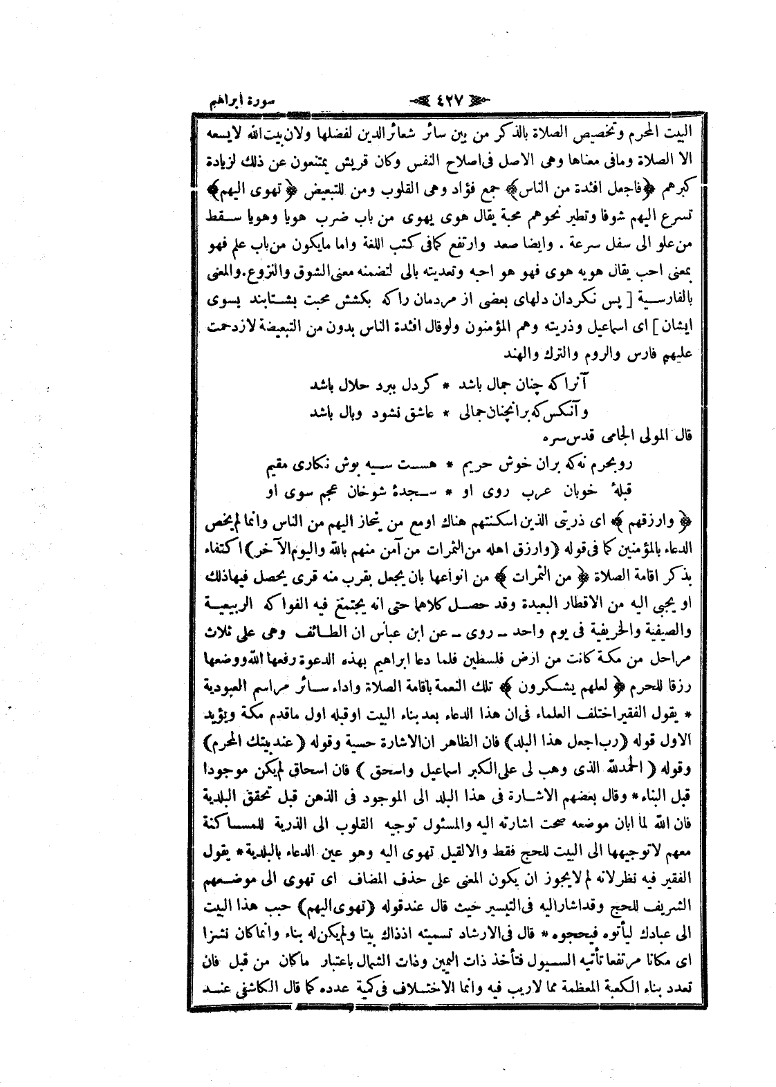 البيت المحرم وتخصيص الصلاة بالذكر من بين سائر شعائر الدين لفضلها ولان بيت الله لا يسعه الا الصلاة وما فى معناها وهى الأصل فى إصلاح النفس وكان قريش يمتنعون عن ذلك لزيادة كبرهم فَاجْعَلْ أَفْئِدَةً مِنَ النَّاسِ جمع فؤاد وهى القلوب ومن للتبعيض تَهْوِي إِلَيْهِمْ تسرع إليهم شوفا وتطير نحوهم محبة يقال هوى يهوى من باب ضرب هويا وهويا سقط من علو الى سفل سرعة. وايضا صعد وارتفع كما فى كتب اللغة واما ما يكون من باب علم فهو بمعنى أحب يقال هويه هوى فهو هو أحبه وتعديته بالى التضمنه معنى الشوق والنزوع. والمعنى بالفارسية [پس نكردان دلهاى بعضى از مردمان را كه بكشش محبت بشتابند بسوى ايشان] اى إسماعيل وذريته وهم المؤمنون ولو قال فائدة الناس بدون من التبعيضية لازدحمت عليهم فارس والروم والترك والهند