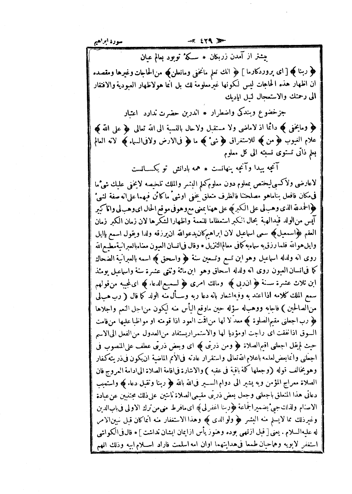 لا عارضى ولا كسبى ليختص بمعلوم دون معلوم كعلم البشر والملك تلخيصه لا يخفى عليك شىء ما فى مكان فافعل بنا ما هو مصلحتنا فالظرف متعلق بيخفى او شىء ما كائن فيهما على انه صفة لشئ الْحَمْدُ لِلَّهِ الَّذِي وَهَبَ لِي عَلَى الْكِبَرِ على هاهنا بمعنى مع وهو فى موقع الحال اى وهب لى وانا كبير آيس من الولد قيد الهبة بحال الكبر استعظاما للنعمة وإظهارا لشكرها لان زمان الكبر زمان العقم إِسْماعِيلَ سمى إسماعيل لان ابراهيم كان يدعو الله ان يرزقه ولدا ويقول اسمع يا ايل وايل هو الله فلما رزق به سماه به كما فى معالم التنزيل وقال فى انسان العيون معناه بالعبرانية مطيع الله روى انه ولد له إسماعيل وهو ابن تسع وتسعين سنة وَإِسْحاقَ اسمه بالعبرانية الضحاك كما فى انسان العيون روى انه ولد له إسحاق وهو ابن مائة وثنتى عشرة سنة وإسماعيل يومئذ ابن ثلاث عشرة سنة إِنَّ رَبِّي ومالك امرى لَسَمِيعُ الدُّعاءِ اى لمجيبه من قولهم سمع الملك كلامه إذا اعتد به وفيه اشعار بانه دعا ربه وسأل منه الولد كما قال رَبِّ هَبْ لِي مِنَ الصَّالِحِينَ فاجابه ووهب له سؤله حين ما وقع اليأس منه ليكون من أجل النعم وأجلاها رَبِّ اجْعَلْنِي مُقِيمَ الصَّلاةِ معدّ لا لها من أقمت العود إذا قومته او مواظبا عليها من قامت السوق إذا نفقت اى راجت او مؤديا لها والاستمرار يستفاد من العدول من الفعل الى الاسم حيث لم يقل اجعلنى أقيم الصلاة وَمِنْ ذُرِّيَّتِي اى وبعض ذريتى عطف على المنصوب فى اجعلنى وانما بعض لعلمه باعلام الله تعالى واستقرار عادته فى الأمم الماضية ان يكون فى ذريته كفار وهو يخالف قوله وَجَعَلَها كَلِمَةً باقِيَةً فِي عَقِبِهِ والاشارة فى اقامة الصلاة الى ادامة العروج فان الصلاة معراج المؤمن وبه يشير الى دوام السير فى الله بالله رَبَّنا وَتَقَبَّلْ دُعاءِ واستجب دعائى هذا المتعلق باجعلنى وجعل بعض ذريتى مقيمى الصلاة ثابتين على ذلك مجتنبين عن عبادة الأصنام ولذلك جيئ بضمير الجماعة رَبَّنَا اغْفِرْ لِي اى ما فرط منى من ترك الاولى فى باب الدين وغير ذلك مما لا يسلم منه البشر وَلِوالِدَيَّ وهذا الاستغفار منه انما كان قبل تبين الأمر له عليه السلام. يعنى [قبل از نهى بوده وهنوز يأس از ايمان ايشان نداشت] قال فى الكواشي استغفر لابويه وهما حيان طمعا فى هدايتهما أو أن امه أسلمت فاراد اسلام أبيه وذلك انهم