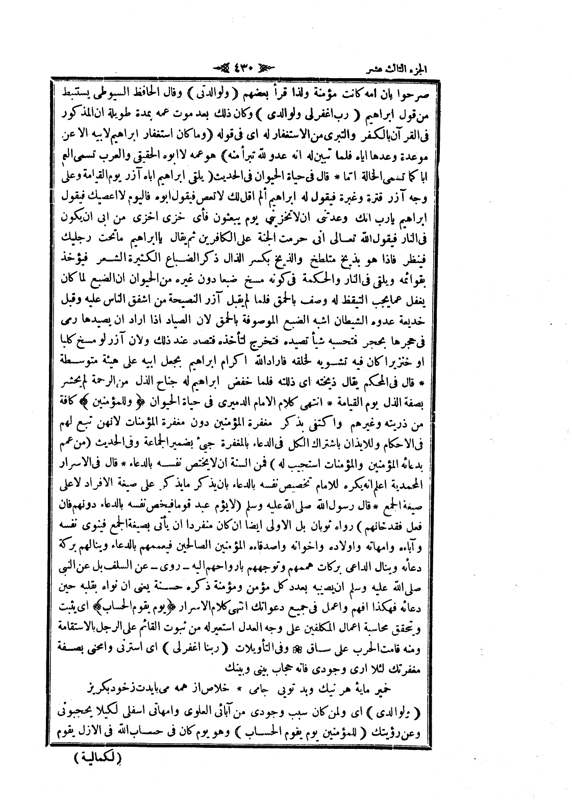 صرحوا بان امه كانت مؤمنة ولذا قرأ بعضهم ولوالدتى وقال الحافظ السيوطي يستنبط من قول ابراهيم رَبِّ اغْفِرْ لِي وَلِوالِدَيَّ وكان ذلك بعد موت عمه بمدة طويلة ان المذكور فى القرآن بالكفر والتبري من الاستغفار له اى فى قوله وَما كانَ اسْتِغْفارُ إِبْراهِيمَ لِأَبِيهِ إِلَّا عَنْ مَوْعِدَةٍ وَعَدَها إِيَّاهُ فَلَمَّا تَبَيَّنَ لَهُ أَنَّهُ عَدُوٌّ لِلَّهِ تَبَرَّأَ مِنْهُ هو عمه لا أبوه الحقيقي والعرب تسمى العم أبا كما تسمى الخالة امّا قال فى حياة الحيوان فى الحديث (يلقى ابراهيم أباه آزر يوم القيامة وعلى وجه آزر قترة وغبرة فيقول له ابراهيم ألم اقل لك لا تعص فيقول أبوه فاليوم لا أعصيك فيقول ابراهيم يا رب انك وعدتني ان لا تخزيني يوم يبعثون فأى خزى اخزى من ابى ان يكون فى النار فيقول الله تعالى انى حرمت الجنة على الكافرين ثم يقال يا ابراهيم ما تحت رجليك فينظر فاذا هو بذيخ متلطخ والذيخ بكسر الذال ذكر الضباع الكثيرة الشعر فيؤخذ بقوائمه ويلقى فى النار والحكمة فى كونه مسخ ضبعا دون غيره من الحيوان ان الضبع لما كان يغفل عما يجب التيقظ له وصف بالحمق فلما لم يقبل آزر