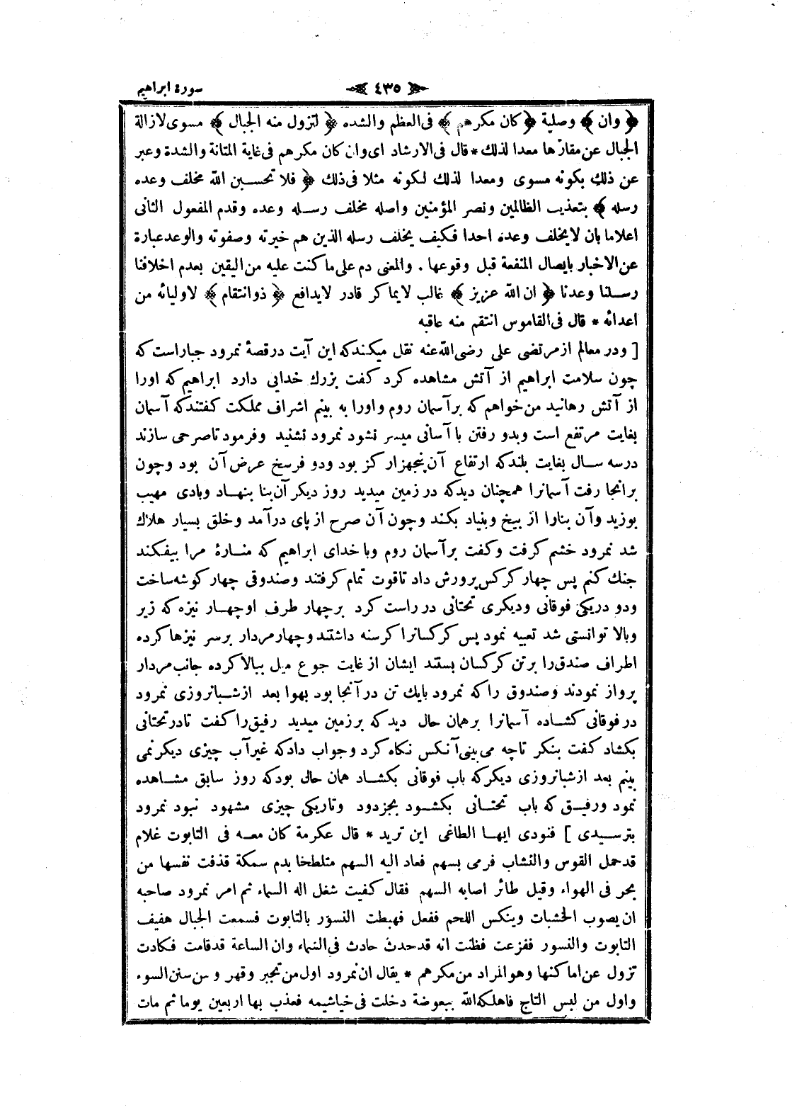 وَإِنْ وصلية كانَ مَكْرُهُمْ فى العظم والشدة لِتَزُولَ مِنْهُ الْجِبالُ مسوى لازالة الجبال عن مقارّها معدا لذلك قال فى الإرشاد اى وان كان مكرهم فى غاية المتانة والشدة وعبر عن ذلك بكونه مسوى ومعدا لذلك لكونه مثلا فى ذلك فَلا تَحْسَبَنَّ اللَّهَ مُخْلِفَ وَعْدِهِ رُسُلَهُ بتعذيب الظالمين ونصر المؤمنين وأصله مخلف رسله وعده وقدم المفعول الثاني اعلاما بان لا يخلف وعده أحدا فكيف يخلف رسله الذين هم خيرته وصفوته والوعد عبارة عن الاخبار بايصال المنفعة قبل وقوعها. والمعنى دم على ما كنت عليه من اليقين بعدم اخلافنا رسلنا وعدنا إِنَّ اللَّهَ عَزِيزٌ غالب لا يماكر قادر لا يدافع ذُو انتِقامٍ لاوليائه من أعدائه قال فى القاموس انتقم منه عاقبه [ودر معالم از مرتضى على رضى الله عنه نقل ميكند كه اين آيت در قصه نمرود جبار است كه چون سلامت ابراهيم از آتش مشاهده كرد كفت بزرك خدايى دارد ابراهيم كه او را از آتش رهانيد من خواهم كه بر آسمان روم واو را به بينم اشراف مملكت كفتند كه آسمان بغايت مرتفع است وبدو رفتن با آسانى ميسر نشود نمرود نشنيد وفرمود تا صرحى سازند در سه سال بغايت بلند كه ارتفاع آن پنجهزار كز بود ودو فرسخ عرض آن بود و چون بر آنجا رفت آسمان را همچنان ديد كه در زمين ميديد روز ديكر آن بنا بنهاد وبادى مهيب بوزيد وآن بنا را از بيخ وبنياد بكند و چون آن صرح از پاى در آمد وخلق بسيار هلاك شد نمرود خشم كرفت وكفت بر آسمان روم وبا خداى ابراهيم كه مناره مرا بيفكند جنك كنم پس چهار كركس پرورش داد تا قوت تمام كرفتند وصندوقى چهار كوشه ساخت ودو در يكى فوقانى وديكرى تحتانى در راست كرد بر چهار طرف او چهار نيزه كه زير وبالا توانستى شد تعبيه نمود پس كركسانرا كرسنه داشتند و چهار مردار بر سر نيزها كرده أطراف صندق را بر تن كركسان بستند ايشان از غايت جوع ميل ببالا كرده جانب مردار پرواز نمودند وصندوق را كه نمرود با يك تن در آنجا بود بهوا بعد از شبانروزى نمرود در فوقانى كشاده آسمان را بر همان حال ديد كه بر زمين ميديد رفيق را كفت تا در تحتانى بگشاد كفت بنكر تا چهـ مى بينى آنكس نكاه كرد وجواب داد كه غير آب چيزى ديكر نمى بينم بعد از شبانروزى ديكر كه باب فوقانى بگشاد همان حال بود كه روز سابق مشاهده نمود ورفيق كه باب تحتانى بگشود بجز دود وتاريكى چيزى مشهود نبود نمرود بترسيدى] فنودى ايها الطاغي اين تريد قال عكرمة كان معه فى التابوت غلام قد حمل القوس والنشاب فرمى بسهم فعاد اليه السهم متلطخا بدم سمكة قذفت نفسها من بحر فى الهواء وقيل طائر أصابه السهم فقال كفيت شغل اله السماء ثم امر نمرود صاحبه ان يصوب الخشبات وينكس اللحم ففعل فهبطت النسور بالتابوت فسمعت الجبال هفيف التابوت والنسور ففزعت فظنت انه قد حدث حادث فى السماء وان الساعة قد قامت فكادت تزول عن أماكنها وهو المراد من مكرهم يقال ان نمرود أول من تجبر وقهر وسن سنن السوء وأول من لبس التاج فاهلكه الله ببعوضة دخلت فى خياشيمه فعذب بها أربعين يوما ثم مات