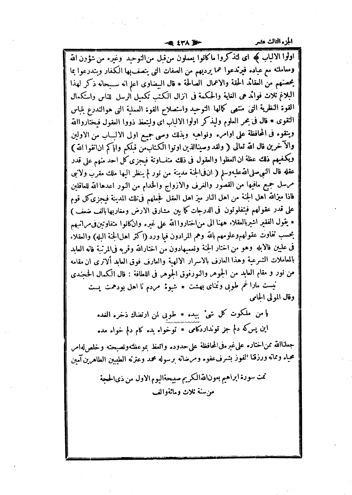 جعلنا الله ممن اختاره على غيره فى المحافظة على حدوده واتعظ بموعظته ونصيحته وخلص له امر محياه ومماته ورزقنا الفوز بشرف عفوه ومرضاته برسوله محمد وعترته الطيبين الطاهرين آمين تمت سورة ابراهيم بعون الله الكريم صبيحة اليوم الاول من ذى الحجة من سنة ثلاث ومائة والف