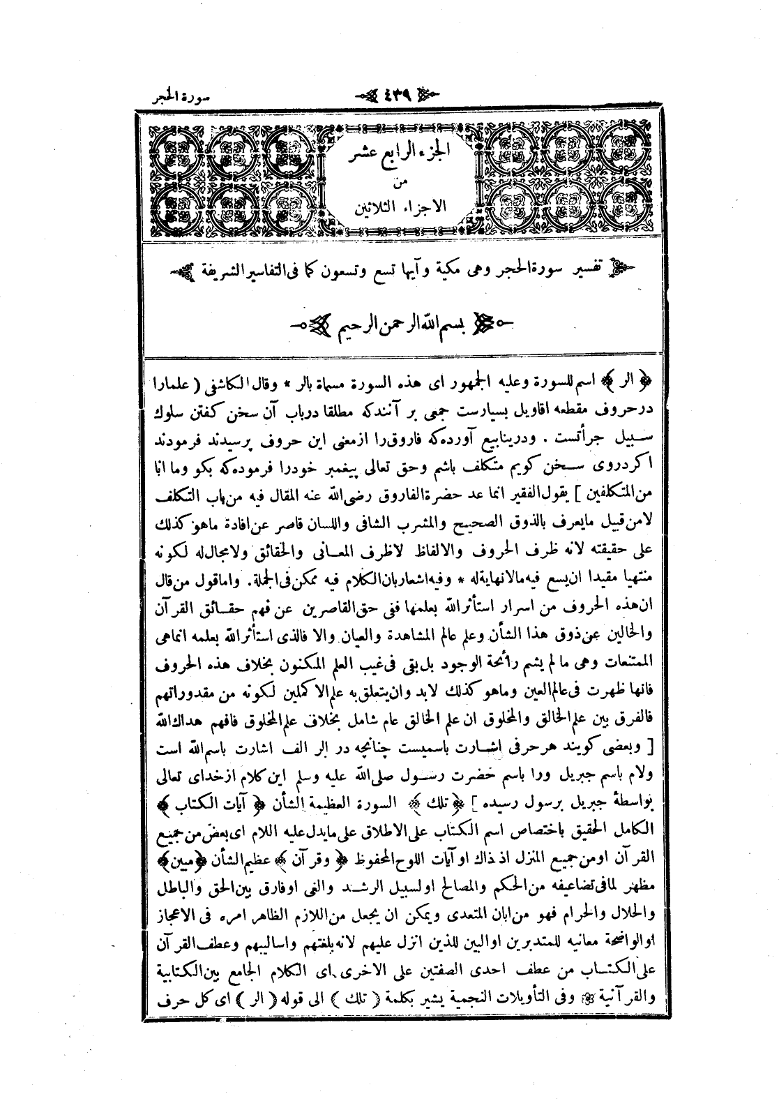 بسم الله الرحمن الرحيم الر اسم للسورة وعليه الجمهور اى هذه السورة مسماة بالر وقال الكاشفى (علما را در حروف مقطعه أقاويل بسيارست جمعى بر آنند كه مطلقا در باب آن سخن گفتن سلوك سبيل جرأتست. ودر ينابيع آورده كه فاروق را از معنى اين حروف پرسيدند فرمودند اگر در وى سخن گويم متكلف باشم وحق تعالى پيغمبر خود را فرموده كه بگو وما انا من المتكلفين] يقول الفقير انما عد حضرة الفاروق رضى الله عنه المقال فيه من باب التكلف لا من قبيل ما يعرف بالذوق الصحيح والمشرب الشافي واللسان قاصر عن إفادة ما هو كذلك على حقيقته لانه ظرف الحروف والألفاظ لا ظرف المعاني والحقائق ولا مجال له لكونه منتهيا مقيدا ان يسع فيه ما لا نهاية له وفيه اشعار بان الكلام فيه ممكن فى الجملة. واما قول من قال ان هذه الحروف من اسرار استأثر الله بعلمها ففى حق القاصرين عن فهم حقائق القرآن والخالين عن ذوق هذا الشأن وعلم عالم المشاهدة والعيان والا فالذى استأثر الله بعلمه انما هى الممتنعات وهى ما لم يشم رائحة الوجود بل بقي فى غيب العلم المكنون بخلاف هذه الحروف فانها ظهرت فى عالم العين وما هو كذلك لا بد وان يتعلق به علم الأكملين لكونه من مقدوراتهم فالفرق بين علم الخالق والمخلوق ان علم الخالق عام شامل بخلاف علم المخلوق فافهم هداك الله [وبعضى گويند هر حرفى اشارت باسميست چنانچهـ در الر الف اشارت باسم الله است ولام باسم جبريل ورا باسم حضرت رسول صلى الله عليه وسلم اين كلام از خداى تعالى بواسطه جبريل برسول رسيده] تِلْكَ السورة العظيمة الشأن آياتُ الْكِتابِ الكامل الحقيق باختصاص اسم الكتاب على الإطلاق على ما يدل عليه اللام اى بعض من جميع القرآن او من جميع المنزل إذ ذاك او آيات اللوح المحفوظ وَقُرْآنٍ عظيم الشأن مُبِينٍ مظهر لما فى تضاعيفه من الحكم والمصالح او لسبيل الرشد والغى او فارق بين الحق والباطل والحلال والحرام فهو من ابان المتعدى ويمكن ان يجعل من اللازم الظاهر امره فى الاعجاز او الواضحة معانيه للمتدبرين او البين للذين انزل عليهم لانه بلغتهم وأساليبهم وعطف القرآن على الكتاب من عطف احدى الصفتين على الاخرى اى الكلام الجامع بين الكتابية والقرآنية وفى التأويلات النجمية يشير بكلمة تِلْكَ الى قوله الر اى كل حرف