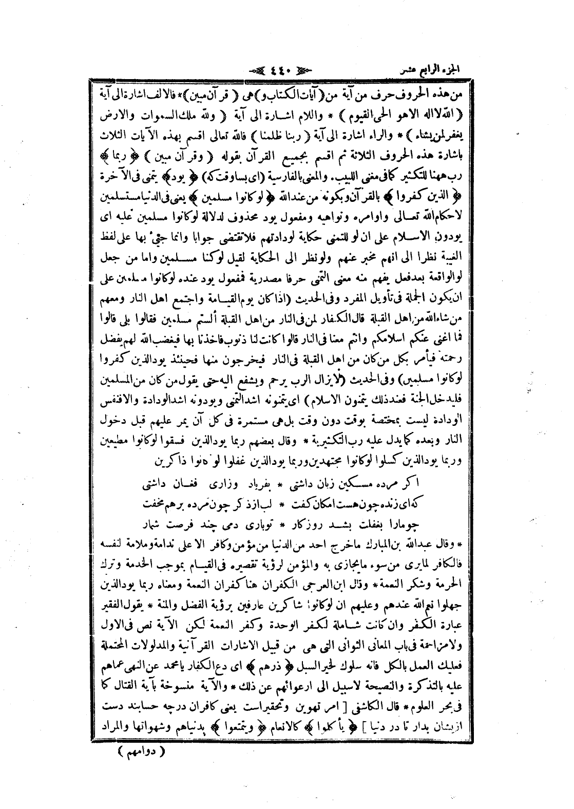 من هذه الحروف حرف من آية من آياتُ الْكِتابِ وَهى قُرْآنٍ مُبِينٍ فالالف اشارة الى آية اللَّهُ لا إِلهَ إِلَّا هُوَ الْحَيُّ الْقَيُّومُ واللام اشارة الى آية وَلِلَّهِ مُلْكُ السَّماواتِ وَالْأَرْضِ يَغْفِرُ لِمَنْ يَشاءُ والراء اشارة الى آية رَبَّنا ظَلَمْنا فالله تعالى اقسم بهذه الآيات الثلاث باشارة هذه الحروف الثلاثة ثم اقسم بجميع القرآن بقوله وَقُرْآنٍ مُبِينٍ رُبَما رب هاهنا للتكثير كما فى مغنى اللبيب. والمعنى بالفارسية اى بسا وقت كه يَوَدُّ يتمنى فى الآخرة الَّذِينَ كَفَرُوا بالقرآن وبكونه من عند الله لَوْ كانُوا مُسْلِمِينَ يعنى فى الدنيا مستسلمين لاحكام الله تعالى وأوامره ونواهيه ومفعول يود محذوف لدلالة لو كانوا مسلمين عليه اى يودون الإسلام على ان لو للتمنى حكاية لودادتهم فلا تقتضى جوابا وانما جيئ بها على لفظ الغيبة نظرا الى انهم مخبر عنهم ولو نظر الى الحكاية لقيل لو كنا مسلمين واما من جعل لو الواقعة بعد فعل يفهم منه معنى التمني حرفا مصدرية فمفعول يود عنده لو كانوا مسلمين على ان يكون الجملة فى تأويل المفرد وفى الحديث (إذا كان يوم القيامة واجتمع اهل النار ومعهم من شاء الله من اهل القبلة قال الكفار لمن فى النار من اهل القبلة ألستم مسلمين فقالوا بلى قالوا فما اغنى عنكم إسلامكم وأنتم معنا فى النار قالوا كانت لنا ذنوب فاخذنا بها فيغضب الله لهم بفضل رحمته فيأمر بكل من كان من اهل القبلة فى النار فيخرجون منها فحينئذ يود الذين كفروا لو كانوا مسلمين) وفى الحديث (لا يزال الرب يرحم ويشفع اليه حتى يقول من كان من المسلمين فليدخل الجنة فعند ذلك يتمنون الإسلام) اى يتمنونه أشد التمني ويودونه أشد الودادة وإلا فنفس الودادة ليست بمختصة بوقت دون وقت بل هى مستمرة فى كل آن يمر عليهم قبل دخول النار وبعده كما يدل عليه رب التكثيرية وقال بعضهم ربما يود الذين فسقوا لو كانوا مطيعين وربما يود الذين كسلوا لو كانوا مجتهدين وربما يود الذين غفلوا لو كانوا ذاكرين