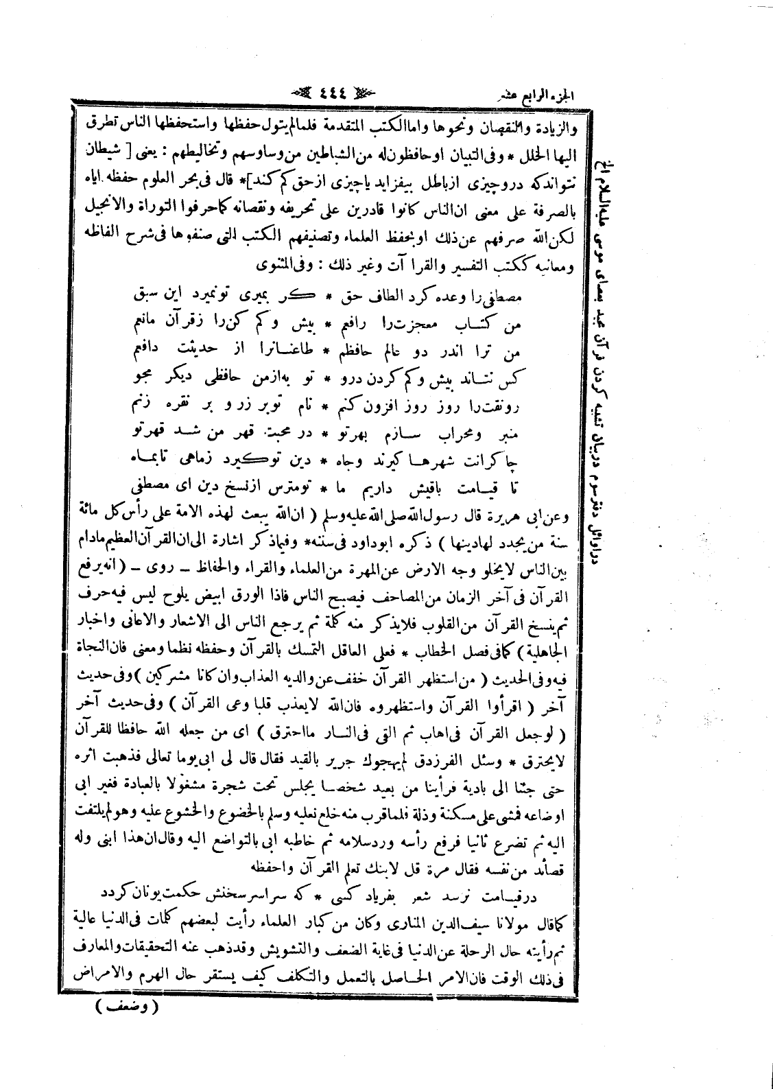 وعن ابى هريرة قال رسول الله صلى الله عليه وسلم (ان الله يبعث لهذه الامة على رأس كل مائة سنة من يجدد لها دينها) ذكره ابو داود فى سننه وفيما ذكر اشارة الى ان القرآن العظيم مادام بين الناس لا يخلو وجه الأرض عن المهرة من العلماء والقراء والحفاظ- روى- (انه يرفع القرآن فى آخر الزمان من المصاحف فيصبح الناس فاذا الورق ابيض يلوح ليس فيه حرف ثم ينسخ القرآن من القلوب فلا يذكر منه كلمة ثم يرجع الناس الى الاشعار والأغاني واخبار الجاهلية) كما فى فصل الخطاب فعلى العاقل التمسك بالقرآن وحفظه نظما ومعنى فان النجاة فيه وفى الحديث (من استظهر القرآن خفف عن والديه العذاب وان كانا مشركين) وفى حديث آخر (اقرأوا القرآن واستظهروه فان الله لا يعذب قلبا وعى القرآن) وفى حديث آخر (لو جعل القرآن فى إهاب ثم القى فى النار ما احترق) اى من جعله الله حافظا للقرآن لا يحترق وسئل الفرزدق لم يهجوك جرير بالقيد فقال قال لى ابى يوما تعالى فذهبت اثره حتى جئنا الى بادية فرأينا من بعيد شخصا يجلس تحت شجرة مشغولا بالعبادة فغير ابى أوضاعه فمشى على مسكنة وذلة فلما قرب منه خلع نعليه وسلم بالخضوع والخشوع عليه وهو لم يلتفت اليه ثم تضرع ثانيا فرفع رأسه ورد سلامه ثم خاطبه ابى بالتواضع اليه وقال ان هذا ابني وله قصائد من نفسه فقال مرة قل لابنك تعلم القرآن واحفظه