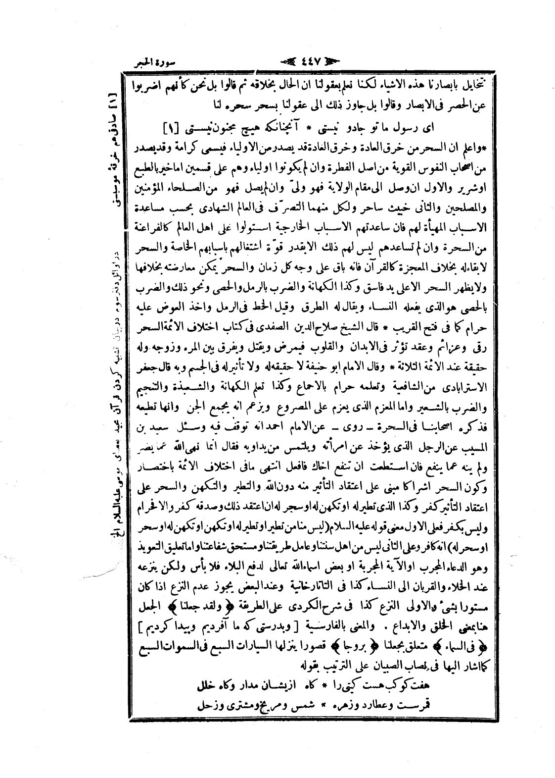 واعلم ان السحر من خرق العادة وخرق العادة قد يصدر من الأولياء فيسمى كرامة وقد يصدر من اصحاب النفوس القوية من اصل الفطرة وان لم يكونوا اولياء وهم على قسمين اما خير بالطبع او شرير والاول ان وصل الى مقام الولاية فهو ولىّ وان لم يصل فهو من الصلحاء المؤمنين والمصلحين والثاني خبيث ساحر ولكل منهما التصرّف فى العالم الشهادى بحسب مساعدة الأسباب المهيأة لهم فان ساعدتهم الأسباب الخارجية استولوا على اهل العالم كالفراعنة من السحرة وان لم تساعدهم ليس لهم ذلك الا بقدر قوّة اشتغالهم بأسبابهم الخاصة والسحر لا بقاء له بخلاف المعجزة كالقرآن فانه باق على وجه كل زمان والسحر يمكن معارضته بخلافها ولا يظهر السحر الا على يد فاسق وكذا الكهانة والضرب بالرمل والحصى ونحو ذلك والضرب بالحصى هو الذي يفعله النساء ويقال له الطرق وقيل الخط فى الرمل وأخذ العوض عليه حرام كما فى فتح القريب قال الشيخ صلاح الدين الصفدي فى كتاب اختلاف الائمة السحر رقى وعزائم وعقد تؤثر فى الأبدان والقلوب فيمرض ويقتل ويفرق بين المرء وزوجه وله حقيقة عند الائمة الثلاثة وقال الامام ابو حنيفة لا حقيقه له ولا تأثير له فى الجسم وبه قال جعفر الاسترابادى من الشافعية وتعلمه حرام بالإجماع وكذا تعلم الكهانة والشعبذة والتنجيم والضرب بالشعير واما المعزم الذي يعزم على المصروع ويزعم انه يجمع الجن وانها تطيعه فذكره أصحابنا فى السحرة- روى- عن الامام احمد انه توقف فيه وسئل سعيد بن المسيب عن الرجل الذي يؤخذ عن امرأته ويلتمس من يداويه فقال انما نهى الله عما يضر ولم ينه عما ينفع فان استطعت ان تنفع أخاك فافعل انتهى ما فى اختلاف الائمة باختصار وكون السحر اشراكا مبنى على اعتقاد التأثير منه دون الله والتطير والتكهن والسحر على اعتقاد التأثير كفر وكذا الذي تطير له او تكهن له او سحر له ان اعتقد ذلك وصدقه كفر والا فحرام وليس بكفر فعلى الاول معنى قوله عليه السلام (ليس منا من تطير او تطير له او تكهن او تكهن له او سحر او سحر له) انه كافر وعلى الثاني ليس من اهل سنتنا وعامل طريقتنا ومستحق شفاعتنا واما تعليق التعويذ وهو الدعاء المجرب او الآية المجربة او بعض اسماء الله تعالى لدفع البلاء فلا بأس ولكن ينزعه عند الخلاء والقربان الى النساء كذا فى التاتار خانية وعند البعض يجوز عدم النزع إذا كان مستورا بشئ والاولى النزع كذا فى شرح الكردي على الطريقة وَلَقَدْ جَعَلْنا الجعل هنا بمعنى الخلق والإبداع. والمعنى بالفارسية [وبدرستى كه ما آفريديم و پيدا كرديم] فِي السَّماءِ متعلق بجعلنا بُرُوجاً قصورا ينزلها السيارات السبع فى السموات السبع كما أشار إليها فى نصاب الصبيان على الترتيب بقوله