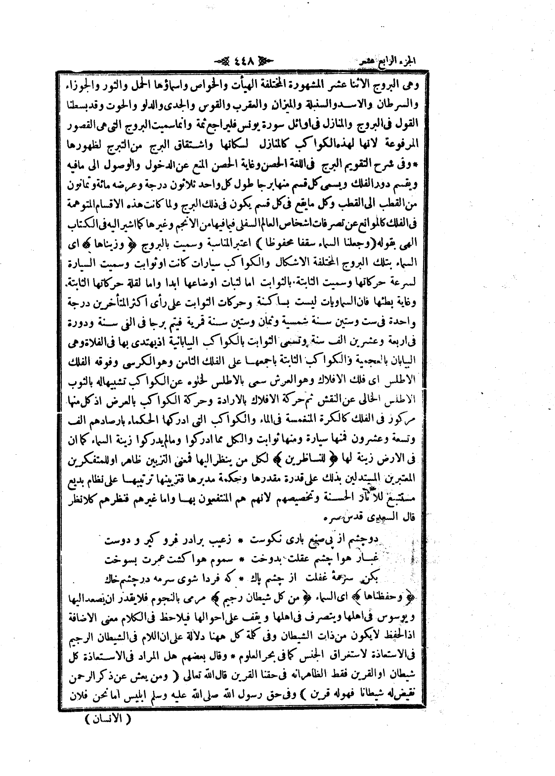 وهى البروج الاثنا عشر المشهورة المختلفة الهيئات والخواص واسماؤها الحمل والثور والجوزاء والسرطان والأسد والسنبلة والميزان والعقرب والقوس والجدى والدلو والحوت وقد بسطنا القول فى البروج والمنازل فى أوائل سورة يونس فليراجع ثمة وانما سميت البروج التي هى القصور المرفوعة لانها لهذه الكواكب كالمنازل لسكانها واشتقاق البرج من التبرج لظهورها وفى شرح التقويم البرج فى اللغة الحصن وغاية الحصن المنع عن الدخول والوصول الى ما فيه ويقسم دور الفلك ويسمى كل قسم منها برجا طول كل واحد ثلاثون درجة وعرضه مائة وثمانون من القطب الى القطب وكل ما يقع فى كل قسم يكون فى ذلك البرج ولما كانت هذه الاقسام المتوهمة فى الفلك كالموانع عن تصرفات اشخاص العالم السفلى فيما فيها من الأنجم وغيرها كما أشير اليه فى الكتاب الهى بقوله وَجَعَلْنَا السَّماءَ سَقْفاً مَحْفُوظاً اعتبر المناسبة وسميت بالبروج وَزَيَّنَّاها اى السماء بتلك البروج المختلفة الاشكال والكواكب سيارات كانت او ثوابت وسميت السيارة لسرعة حركاتها وسميت الثابتة بالثوابت اما لثبات أوضاعها ابدا واما لقلة حركاتها الثابتة وغاية بطئها فان السماويات ليست بساكنة وحركات الثوابت على رأى اكثر المتأخرين درجة واحدة فى ست وستين سنة شمسية وثمان وستين سنة قمرية فيتم برجا فى الفى سنة ودورة فى اربعة وعشرين الف سنة وتسمى الثوابت بالكواكب البيابانية إذ يهتدى بها فى الفلاة وهى البيابان بالعجمية والكواكب الثابتة بأجمعها على الفلك الثامن وهو الكرسي وفوقه الفلك الأطلس اى فلك الافلاك وهو العرش سمى بالاطلس لخلوه عن الكواكب تشبيها له بالثوب الأطلس الخالي عن النقش ثم حركة الافلاك بالارادة وحركة الكواكب بالعرض إذ كل منها مركوز فى الفلك كالكرة المنغمسة فى الماء والكواكب التي أدركها الحكماء بإرصادهم الف وتسعة وعشرون فمنها سيارة ومنها ثوابت والكل مما أدركوا وما لم يدركوا زينة السماء كما ان فى الأرض زينة لها لِلنَّاظِرِينَ لكل من ينظر إليها فمعنى التزيين ظاهر او للمتفكرين المعتبرين المستدلين بذلك على قدرة مقدرها وحكمة مدبرها فتزيينها ترتيبها على نظام بديع مستتبع للآثار الحسنة وتخصيصهم لانهم هم المنتفعون بها واما غيرهم فنظرهم كلا نظر قال السعدي قدس سره