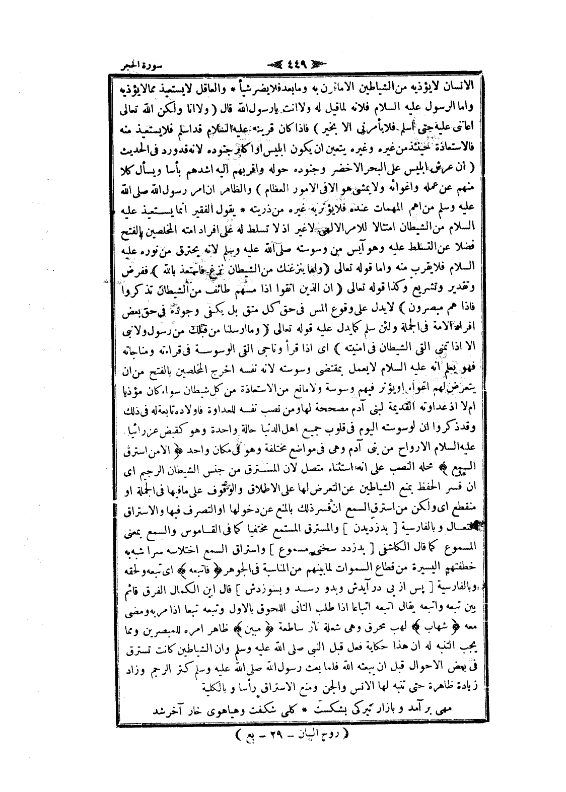 الإنسان لا يؤذيه من الشياطين الا ما قرن به وما بعد فلا يضر شيأ والعاقل لا يستعيذ مما لا يؤذيه واما الرسول عليه السلام فلانه لما قيل له ولا أنت يا رسول الله قال (ولا انا ولكن الله تعالى أعانني عليه حتى اسلم فلا يأمرنى الا بخير) فاذا كان قرينه عليه السلام قد اسلم فلا يستعيذ منه فالاستعاذة حينئذ من غيره وغيره يتعين ان يكون إبليس او أكابر جنوده لانه قد ورد فى الحديث (ان عرش إبليس على البحر الأخضر وجنوده حوله وأقربهم اليه أشدهم بأسا ويسأل كلا منهم عن عمله واغوائه ولا يمشى هو الا فى الأمور العظام) والظاهر ان امر رسول الله صلى الله عليه وسلم من أهم المهمات عنده فلا يؤثر به غيره من ذريته يقول الفقير انما يستعيذ عليه السلام من الشيطان امتثالا للامر الإلهي لا غير إذ لا تسلط له على افراد أمته المخلصين بالفتح فضلا عن التسلط عليه وهو آيس من وسوسته صلى الله عليه وسلم لانه يحترق من نوره عليه السلام فلا يقرب منه واما قوله تعالى وَإِمَّا يَنْزَغَنَّكَ مِنَ الشَّيْطانِ نَزْغٌ فَاسْتَعِذْ بِاللَّهِ ففرض وتقدير وتشريع وكذا قوله تعالى إِنَّ الَّذِينَ اتَّقَوْا إِذا مَسَّهُمْ طائِفٌ مِنَ الشَّيْطانِ تَذَكَّرُوا فَإِذا هُمْ مُبْصِرُونَ لا يدل على وقوع المس فى حق كل متق بل يكفى وجوده فى حق بعض افراد الامة فى الجملة ولئن سلم كما يدل عليه قوله تعالى وَما أَرْسَلْنا مِنْ قَبْلِكَ مِنْ رَسُولٍ وَلا نَبِيٍّ إِلَّا إِذا تَمَنَّى أَلْقَى الشَّيْطانُ فِي أُمْنِيَّتِهِ اى إذا قرأ وناجى القى الوسوسة فى قراءته ومناجاته فهو يعلم انه عليه السلام لا يعمل بمقتضى وسوسته لانه نفسه اخرج المخلصين بالفتح من ان يتعرض لهم إغواء او يؤثر فيهم وسوسة ولا مانع من الاستعاذة من كل شيطان سواء كان مؤذيا أم لا إذ عداوته القديمة لبنى آدم مصححة لها ومن نصب نفسه للعداوة فاولاده تابعة له فى ذلك وقد ذكروا ان لوسوسته اليوم فى قلوب جميع اهل الدنيا حالة واحدة وهو كقبض عزرائيل عليه السلام الأرواح من بنى آدم وهى فى مواضع مختلفة وهو فى مكان واحد إِلَّا مَنِ اسْتَرَقَ السَّمْعَ محله النصب على انه استثناء متصل لان المسترق من جنس الشيطان الرجيم اى ان فسر الحفظ بمنع الشياطين عن التعرض لها على الإطلاق والوقوف على ما فيها فى الجملة او منقطع اى ولكن من استرق السمع ان فسر ذلك بالمنع عن دخولها او التصرف فيها والاستراق افتعال وبالفارسية [بدزديدن] والمسترق المستمع مختفيا كما فى القاموس والسمع بمعنى المسموع كما قال الكاشفى [بدزدد سخنى مسموع] واستراق السمع اختلاسه سرا شبه به خطفتهم اليسيرة من قطاع السموات لما بينهم من المناسبة فى الجوهر فَأَتْبَعَهُ اى تبعه ولحقه وبالفارسية [پس از پى در آيدش وبدو رسد وبسوزدش] قال ابن الكمال الفرق قائم بين تبعه واتبعه يقال اتبعه اتباعا إذا طلب الثاني اللحوق بالأول وتبعه تبعا إذا مر به ومضى معه شِهابٌ لهب محرق وهى شعلة نار ساطعة مُبِينٌ ظاهر امره للمبصرين ومما يجب التنبه له ان هذا حكاية فعل قبل النبي صلى الله عليه وسلم وان الشياطين كانت تسترق فى بعض الأحوال قبل ان يبعثه الله فلما بعث رسول الله صلى الله عليه وسلم كثر الرجم وزاد زيادة ظاهرة حتى تنبه لها الانس والجن ومنع الاستراق رأسا وبالكلية