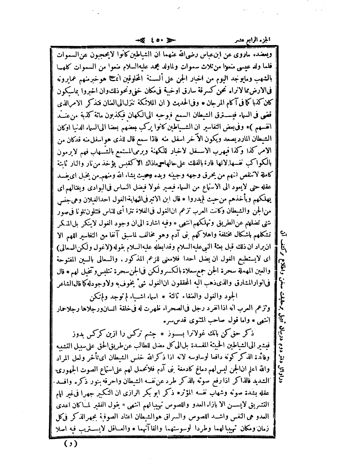 ويعضده ما روى عن ابن عباس رضى الله عنهما ان الشياطين كانوا لا يحجبون عن السموات فلما ولد عيسى منعوا من ثلاث سموات ولما ولد محمد عليه السلام منعوا من السموات كلها بالشهب وما يوجد اليوم من اخبار الجن على ألسنة المخلوقين انما هو خبر منهم عما يرونه فى الأرض مما لا نراه نحن كسرقة سارق او خبية فى مكان خفى ونحو ذلك وان أخبروا بما سيكون كان كذبا كما فى آكام المرجان وفى الحديث (ان الملائكة تنزل الى العنان فتذكر الأمر الذي قضى فى السماء فيسترق الشيطان السمع فيوحيه الى الكهان فيكذبون مائة كذبة من عند أنفسهم) وفى بعض التفاسير ان الشياطين كانوا يركب بعضهم بعضا الى السماء الدنيا او كان الشيطان المارد يصعد ويكون الآخر أسفل منه فاذا سمع قال للذى هو أسفل