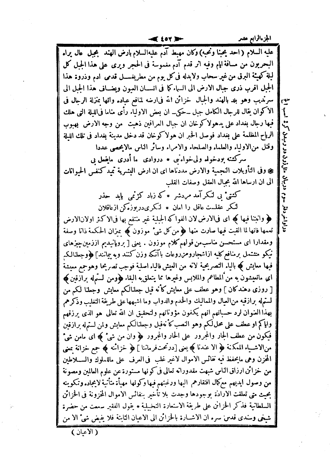 عليه السلام (أحد يحبنا ونحبه) وكان مهبط آدم عليه السلام بأرض الهند بجبل عال يراه البحريون من مسافة ايام وفيه اثر قدم آدم مغموسة فى الحجر ويرى على هذا الجبل كل ليلة كهيئة البرق من غير سحاب ولا بد له فى كل يوم من مطر يغسل قدمى آدم وذروة هذا الجبل اقرب ذرى جبال الأرض الى السماء كما فى انسان العيون ويضاف هذا الجبل الى سر نديب وهو بلد بالهند والجبال خزائن الله فى ارضه لمنافع عباده وانها بمنزلة الرجال فى الأكوان يقال للرجال الكامل جبل- حكى- ان بعض الأولياء رأى مناما فى الليلة التي هلك فيها رجال بغداد على يد هولاكوخان ان جبال العراقين ذهبت من وجه الأرض بهبوب الرياح المظلمة على بغداد فوصل الخبر ان هولاكوخان قد دخل مدينة بغداد فى تلك الليلة وقتل من الأولياء والعلماء والصلحاء والأمراء وسائر الناس ما لا يحصى عددا