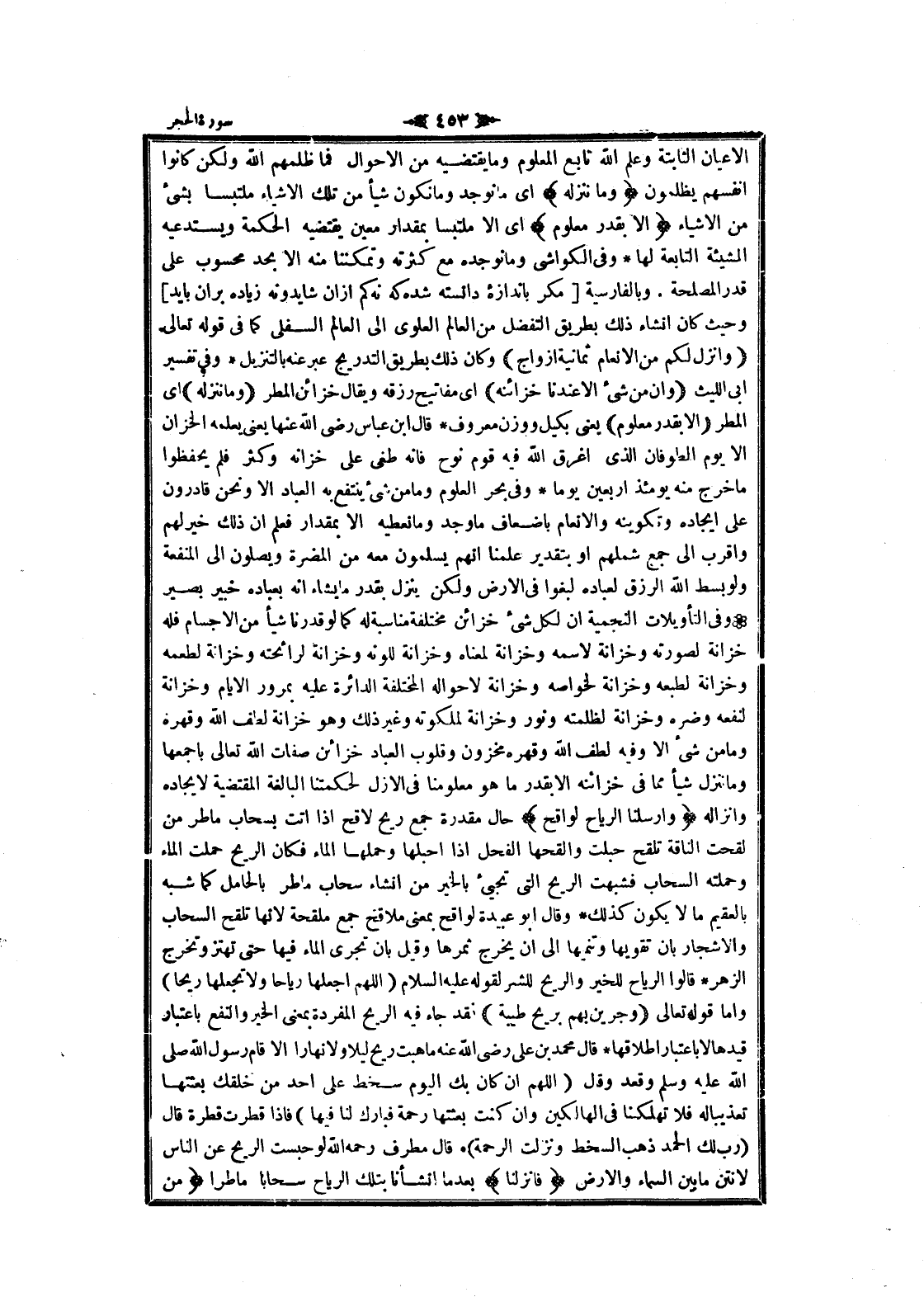 الأعيان الثابتة وعلم الله تابع المعلوم وما يقتضيه من الأحوال فما ظلمهم الله ولكن كانوا أنفسهم يظلمون وَما نُنَزِّلُهُ اى ما نوجد وما نكون شيأ من تلك الأشياء ملتبسا بشئ من الأشياء إِلَّا بِقَدَرٍ مَعْلُومٍ اى الا ملتبسا بمقدار معين يقتضيه الحكمة ويستدعيه المشيئة التابعة لها وفى الكواشي وما نوجده مع كثرته وتمكننا منه الا بحد محسوب على قدر المصلحة. وبالفارسية [مگر باندازه دانسته شده كه نه كم از ان شايد ونه زياده بر ان بايد] وحيث كان إنشاء ذلك بطريق التفضل من العالم العلوي الى العالم السفلى كما فى قوله تعالى وَأَنْزَلَ لَكُمْ مِنَ الْأَنْعامِ ثَمانِيَةَ أَزْواجٍ وكان ذلك بطريق التدريج عبر عنه بالتنزيل وفى تفسير ابى الليث وَإِنْ مِنْ شَيْءٍ إِلَّا عِنْدَنا خَزائِنُهُ اى مفاتيح رزقه ويقال خزائن المطر وَما نُنَزِّلُهُ اى المطر إِلَّا بِقَدَرٍ مَعْلُومٍ يعنى بكيل ووزن معروف قال ابن عباس رضى الله عنها يعنى يعلمه الخزان الا يوم الطوفان الذي أغرق الله فيه قوم نوح فانه طغى على خزانه وكثر فلم يحفظوا ما خرج منه يومئذ أربعين يوما وفى بحر العلوم وما من شىء ينتفع به العباد الا ونحن قادرون على إيجاده وتكوينه والانعام بأضعاف ما وجد وما نعطيه الا بمقدار فعلم ان ذلك خير لهم واقرب الى جمع شملهم او بتقدير علمنا انهم يسلمون معه من المضرة ويصلون الى المنفعة ولو بسط الله الرزق لعباده لبغوا فى الأرض ولكن ينزل بقدر ما يشاء انه بعباده خبير بصير وفى التأويلات النجمية ان لكل شىء خزائن مختلفة مناسبة له كما لو قدرنا شيأ من الأجسام فله خزانة لصورته وخزانة لاسمه وخزانة لمعناه وخزانة للونه وخزانة لرائحته وخزانة لطعمه وخزانة لطبعه وخزانة لخواصه وخزانة لاحواله المختلفة الدائرة عليه بمرور الأيام وخزانة لنفعه وضره وخزانة لظلمته ونور وخزانة لملكوته وغير ذلك وهو خزانة لطف الله وقهره وما من شىء الا وفيه لطف الله وقهره مخزون وقلوب العباد خزائن صفات الله تعالى بأجمعها وما ننزل شيأ مما فى خزائنه الا بقدر ما هو معلومنا فى الأزل لحكمتنا البالغة المقتضية لايجاده وانزاله وَأَرْسَلْنَا الرِّياحَ لَواقِحَ حال مقدرة جمع ريح لاقح إذا أتت بسحاب ماطر من لقحت الناقة تلقح حبلت والقحها الفحل إذا أحبلها وحملها الماء فكان الريح حملت الماء وحملته السحاب فشبهت الريح التي تجيئ بالخير من إنشاء سحاب ماطر بالحامل كما شبه بالعقيم ما لا يكون كذلك وقال ابو عبيدة لواقح بمعنى ملاقح جمع ملقحة لانها تلقح السحاب والأشجار بان تقويها وتنميها الى ان يخرج ثمرها وقيل بان تجرى الماء فيها حتى تهتز وتخرج الزهر قالوا الرياح للخير والريح للشر لقوله عليه السلام (اللهم اجعلها رياحا ولا تجعلها ريحا) واما قوله تعالى وَجَرَيْنَ بِهِمْ بِرِيحٍ طَيِّبَةٍ نقد جاء فيه الريح المفردة بمعنى الخير والنفع باعتبار قيدها لا باعتبار إطلاقها قال محمد بن على رضى الله عنه ما هبت ريح ليلا ولا نهارا الا قام رسول الله صلى الله عليه وسلم وقعد وقال (اللهم ان كان بك اليوم سخط على أحد من خلقك بعثتها تعذيبا له فلا تهلكنا فى الهالكين وان كنت بعثتها رحمة فبارك لنا فيها) فاذا قطرت قطرة قال (رب لك الحمد ذهب السخط ونزلت الرحمة) قال مطرف رحمه الله لو حبست الريح عن الناس لانتن ما بين السماء والأرض فَأَنْزَلْنا بعد ما انشأنا بتلك الرياح سحابا ماطرا مِنَ السَّماءِ
