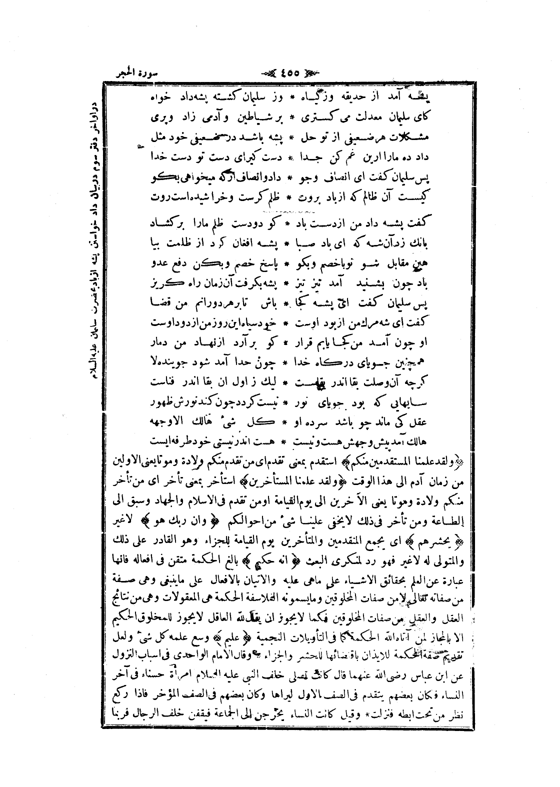 وَلَقَدْ عَلِمْنَا الْمُسْتَقْدِمِينَ مِنْكُمْ استقدم بمعنى تقدم اى من تقدم منكم ولادة وموتا يعنى الأولين من زمان آدم الى هذا الوقت وَلَقَدْ عَلِمْنَا الْمُسْتَأْخِرِينَ استأخر بمعنى تأخر اى من تأخر منكم ولادة وموتا يعنى الآخرين الى يوم القيامة او من تقدم فى الإسلام والجهاد وسبق الى الطاعة ومن تأخر فى ذلك لا يخفى علينا شىء من أحوالكم وَإِنَّ رَبَّكَ هُوَ لا غير يَحْشُرُهُمْ اى يجمع المتقدمين والمتأخرين يوم القيامة للجزاء وهو القادر على ذلك والمتولى له لا غير فهو رد لمنكرى البعث إِنَّهُ حَكِيمٌ بالغ الحكمة متقن فى أفعاله فانها عبارة عن العلم بحقائق الأشياء على ما هى عليه والإتيان بالافعال على ما ينبغى وهى صفة من صفاته تعالى لا من صفات المخلوقين وما يسمونه الفلاسفة الحكمة هى المعقولات وهى من نتائج العقل والعقل من صفات المخلوقين فكما لا يجوز ان يقال لله العاقل لا يجوز للمخلوق الحكيم الا بالمجاز لمن آتاه الله الحكمة كما فى التأويلات النجمية عَلِيمٌ وسع علمه كل شىء ولعل تقديم صفة الحكمة للايذان باقتضائها للحشر والجزاء وقال الامام الواحدي فى اسباب النزول عن ابن عباس رضى الله عنهما قال كانت تصلى خلف النبي عليه السلام امرأة حسناء فى آخر النساء فكان بعضهم يتقدم فى الصف الاول ليراها وكان بعضهم فى الصف المؤخر فاذا ركع نظر من تحت إبطه فنزلت وقيل كانت النساء يخرجن الى الجماعة فيقفن خلف الرجال فربما