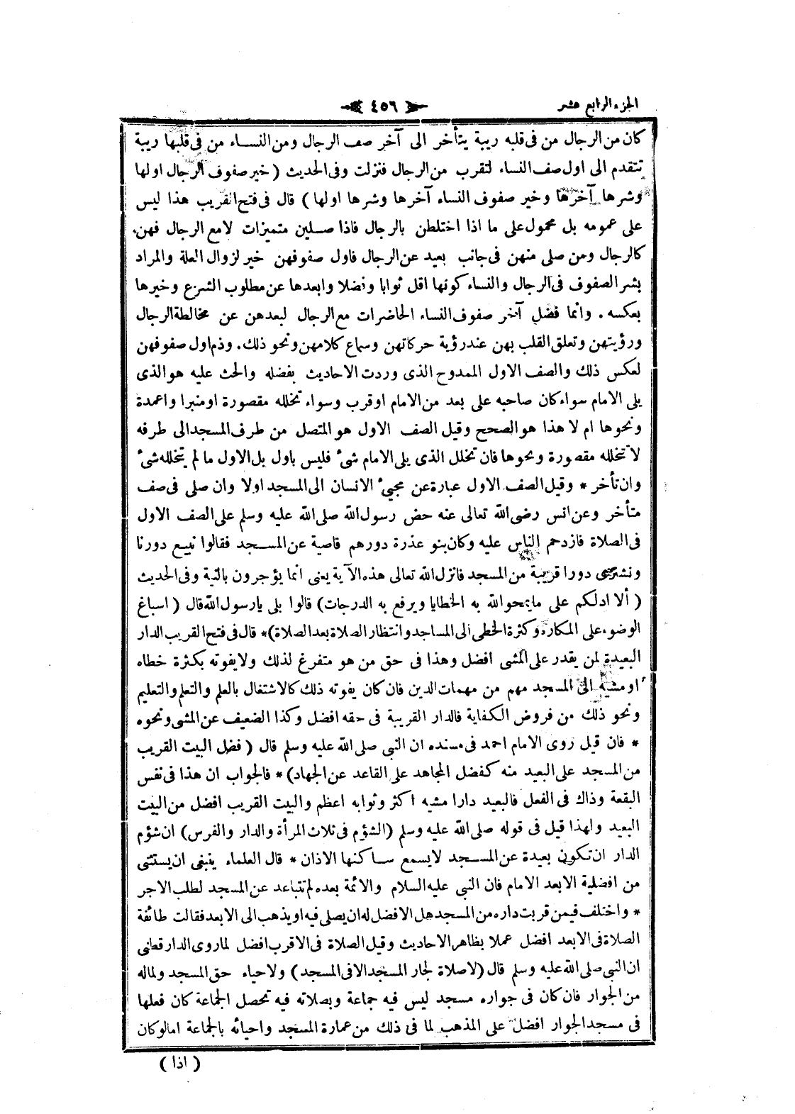 كان من الرجال من فى قلبه ريبة يتأخر الى آخر صف الرجال ومن النساء من فى قلبها ريبة تتقدم الى أول صف النساء لتقرب من الرجال فنزلت وفى الحديث (خير صفوف الرجال أولها وشرها آخرها وخير صفوف النساء آخرها وشرها أولها) قال فى فتح القريب هذا ليس على عمومه بل محمول على ما إذا اختلطن بالرجال فاذا صلين متميزات لا مع الرجال فهن كالرجال ومن صلى منهن فى جانب بعيد عن الرجال فاول صفوفهن خير لزوال العلة والمراد بشر الصفوف فى الرجال والنساء كونها اقل ثوابا وفضلا وأبعدها عن مطلوب الشرع وخيرها بعكسه. وانما فضل آخر صفوف النساء الحاضرات مع الرجال لبعدهن عن مخالطة الرجال ورؤيتهن وتعلق القلب بهن عند رؤية حركاتهن وسماع كلامهن ونحو ذلك. وذم أول صفوفهن لعكس ذلك والصف الاول الممدوح الذي وردت الأحاديث بفضله والحث عليه هو الذي يلى الامام سواء كان صاحبه على بعد من الامام او قرب وسواء تخلله مقصورة او منبرا واعمدة ونحوها أم لا هذا هو الصحيح وقيل الصف الاول هو المتصل من طرف المسجد الى طرفه لا تتخلله مقصورة ونحوها فان تخلل الذي يلى الامام شىء فليس باول بل الاول ما لم يتخلله شىء وان تأخر وقيل الصف الاول عبارة عن مجيئ الإنسان الى المسجد اولا وان صلى فى صف متأخر وعن انس رضى الله تعالى عنه حض رسول الله صلى الله عليه وسلم على الصف الاول فى الصلاة فازدحم الناس عليه وكان بنو عذرة دورهم قاصية عن المسجد فقالوا نبيع دورنا ونشترى دورا قريبة من المسجد فانزل الله تعالى هذه الآية يعنى انما يؤجرون بالنية وفى الحديث (ألا أدلكم على ما يمحو الله به الخطايا ويرفع به الدرجات) قالوا بلى يا رسول الله قال (إسباغ الوضوء على المكاره وكثرة الخطى الى المساجد وانتظار الصلاة بعد الصلاة) قال فى فتح القريب الدار البعيدة لمن يقدر على المشي أفضل وهذا فى حق من هو متفرغ لذلك ولا يفوته بكثرة خطاه او مشيه الى المسجد مهم من مهمات الدين فان كان يفوته ذلك كالاشتغال بالعلم والتعلم والتعليم ونحو ذلك من فروض الكفاية فالدار القريبة فى حقه أفضل وكذا الضعيف عن المشي ونحوه فان قيل روى الامام احمد فى مسنده ان النبي صلى الله عليه وسلم قال (فضل البيت القريب من المسجد على البعيد منه كفضل المجاهد على القاعد عن الجهاد) فالجواب ان هذا فى نفس البقعة وذاك فى الفعل فالبعيد دارا مشيه اكثر وثوابه أعظم والبيت القريب أفضل من البيت البعيد ولهذا قيل فى قوله صلى الله عليه وسلم (الشؤم فى ثلاث المرأة والدار والفرس) ان شؤم الدار ان تكون بعيدة عن المسجد لا يسمع
