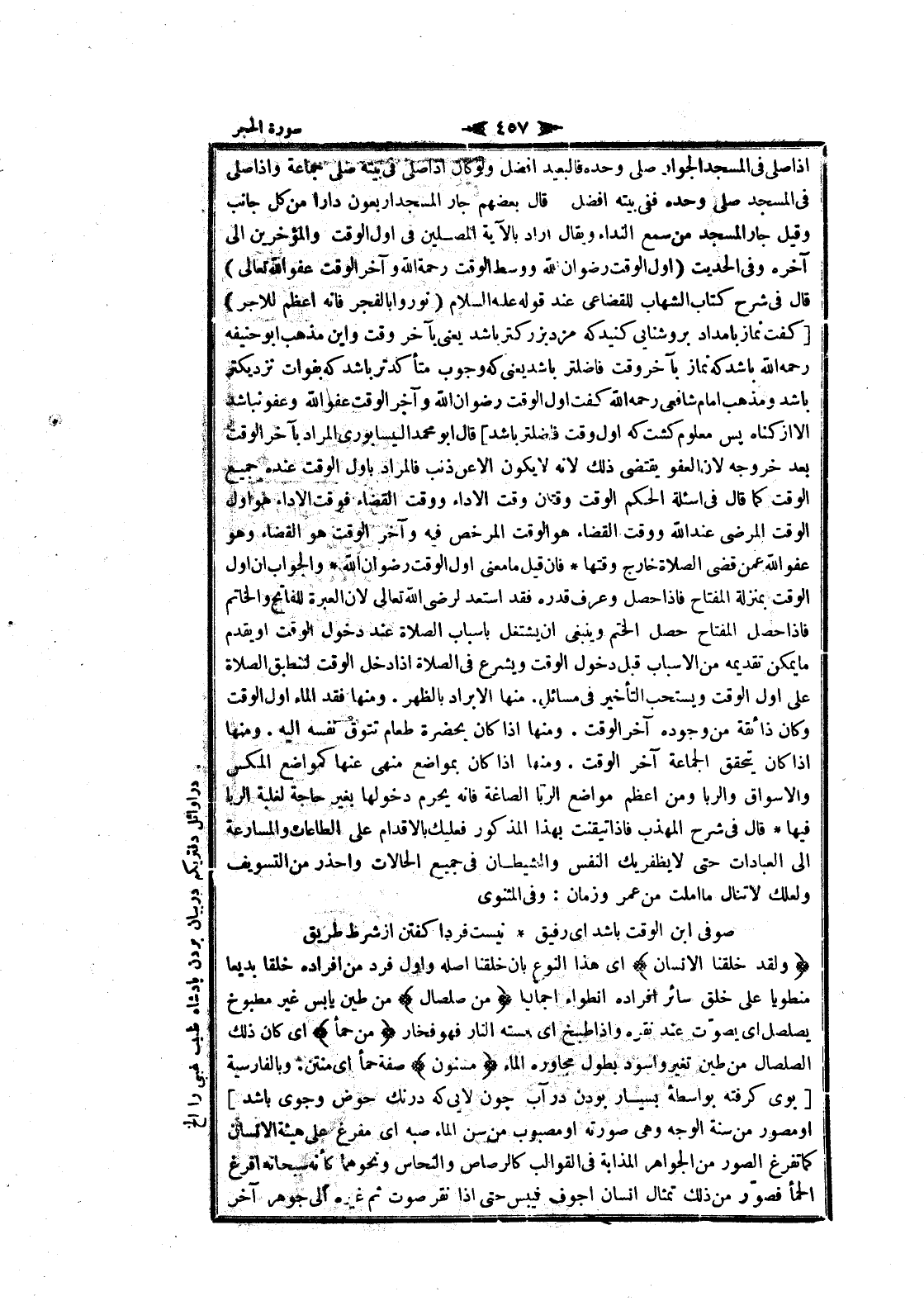 إذا صلى فى المسجد الجوار صلى وحده فالبعيد أفضل ولو كان إذا صلى فى بيته صلى جماعة وإذا صلى فى المسجد صلى وحده ففى بيته أفضل قال بعضهم جار المسجد أربعون دارا من كل جانب وقيل جار المسجد من سمع النداء ويقال أراد بالآية المصلين فى أول الوقت والمؤخرين الى آخره وفى الحديث (أول الوقت رضوان الله ووسط الوقت رحمة الله وآخر الوقت عفو الله تعالى) قال فى شرح كتاب الشهاب للقضاعى عند قوله عليه السلام (نور وأبا لفجر فانه أعظم للاجر) [گفت نماز بامداد بروشنايى كنيد كه مزد بزرگتر باشد يعنى بآخر وقت واين مذهب ابو حنيفه رحمه الله باشد كه نماز بآخر وقت فاضلتر باشد يعنى كه وجوب متأكدتر باشد كه بفوات نزديكتر باشد ومذهب امام شافعى رحمه الله گفت أول الوقت رضوان الله وآخر الوقت عفو الله وعفو نباشد الا از گناه پس معلوم گشت كه أول وقت فاضلتر باشد] قال ابو محمد النيسابورى المراد بآخر الوقت بعد خروجه لان العفو يقتضى ذلك لانه لا يكون الا عن ذنب فالمراد باول الوقت عنده جميع الوقت كما قال فى اسئلة الحكم الوقت وقتان وقت الأداء ووقت القضاء فوقت الأداء هو أول الوقت المرضى عند الله ووقت القضاء هو الوقت المرخص فيه وآخر الوقت هو القضاء وهو عفو الله عمن قضى الصلاة خارج وقتها فان قيل ما معنى أول الوقت رضوان الله والجواب ان أول الوقت بمنزلة المفتاح فاذا حصل وعرف قدره فقد استعد لرضى الله تعالى لان العبرة للفاتح والخاتم فاذا حصل المفتاح حصل الختم وينبغى ان يشتغل بأسباب الصلاة عند دخول الوقت او يقدم ما يمكن تقديمه من الأسباب قبل دخول الوقت ويشرع فى الصلاة إذا دخل الوقت لتنطبق الصلاة على أول الوقت ويستحب التأخير فى مسائل. منها الإبراد بالظهر. ومنها فقد الماء أول الوقت وكان ذائقة من وجوده آخر الوقت. ومنها إذا كان بحضرة طعام تتوق نفسه اليه. ومنها إذا كان يتحقق الجماعة آخر الوقت. ومنها إذا كان بمواضع منهى عنها كمواضع المكس والأسواق والربا ومن أعظم مواضع الربا الصاغة فانه يحرم دخولها بغير حاجة لغلبة الربا فيها قال فى شرح المهذب فاذا تيقنت بهذا المذكور فعليك بالاقدام على الطاعات والمسارعة الى العبادات حتى لا يظفريك النفس والشيطان فى جميع الحالات واحذر من التسويف ولعلك لا تنال ما أملت من عمر وزمان: وفى المثنوى