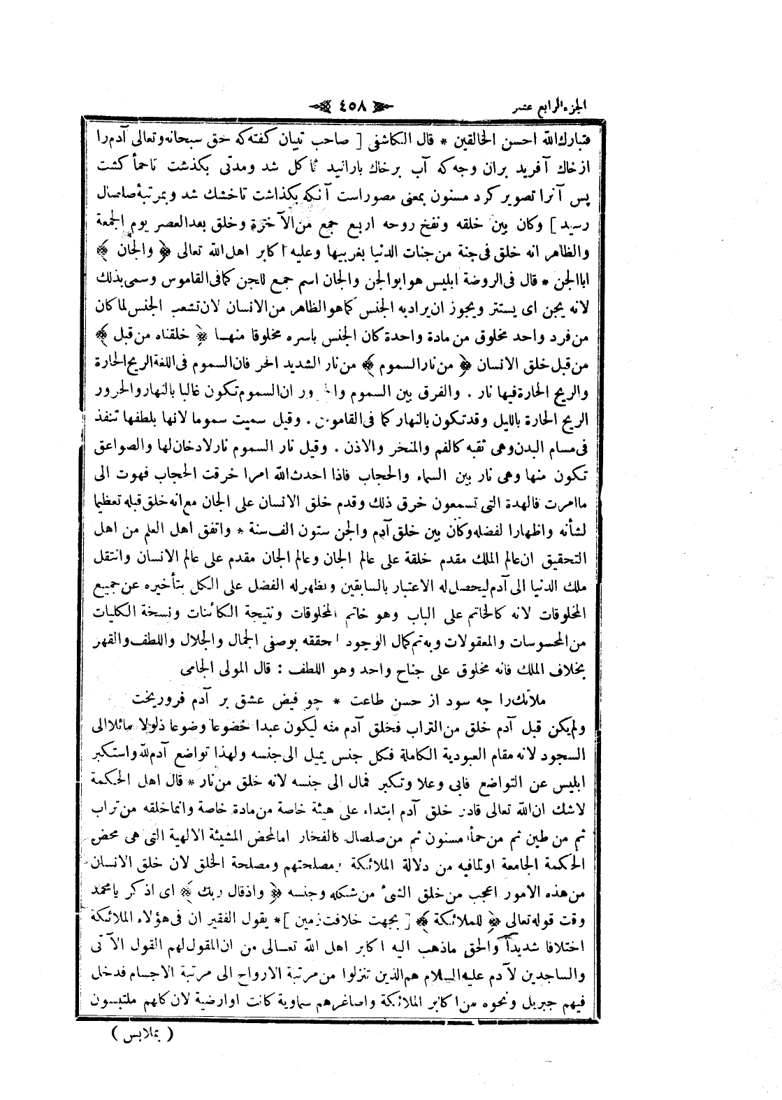 فتبارك الله احسن الخالقين قال الكاشفى [صاحب تبيان گفته كه حق سبحانه وتعالى آدم را از خاك آفريد بران وجه كه آب بر خاك بارانيد تا گل شد ومدتى بگذشت تا حمأ گشت پس آنرا تصوير كرد مسنون بمعنى مصور است آنكه بگذاشت تا خشك شد وبمرتبه صلصال رسيد] وكان بين خلقه ونفخ روحه اربع جمع من الآخرة وخلق بعد العصر يوم الجمعة والظاهر انه خلق فى جنة من جنات الدنيا بغربيها وعليه أكابر اهل الله تعالى وَالْجَانَّ أبا الجن قال فى الروضة إبليس هو ابو الجن والجان اسم جمع للجن كما فى القاموس وسمى بذلك لانه يجن اى يستتر ويجوز ان يراد به الجنس كما هو الظاهر من الإنسان لان تشعب الجنس لما كان من فرد واحد مخلوق من مادة واحدة كان الجنس باسره مخلوقا منها خَلَقْناهُ مِنْ قَبْلُ من قبل خلق الإنسان مِنْ نارِ السَّمُومِ من نار الشديد الحرفان السموم فى اللغة الريح الحارة والريح الحارة فيها نار. والفرق بين السموم والحرور ان السموم تكون غالبا بالنهار والحرور الريح الحارة بالليل وقد تكون بالنهار كما فى القاموس. وقيل سميت سموما لانها بلطفها تنفذ فى مسام البدن وهى ثقبه كالفم والمنخر والاذن. وقيل نار السموم نار لا دخان لها والصواعق تكون منها وهى نار بين السماء والحجاب فاذا أحدث الله امرا خرقت الحجاب فهوت الى ما أمرت فالهدة التي تسمعون خرق ذلك وقدم خلق الإنسان على الجان مع انه خلق قبله تعظيما لشأنه وإظهارا لفضله وكان بين خلق آدم والجن ستون الف سنة واتفق اهل العلم من اهل التحقيق ان عالم الملك مقدم خلقة على عالم الجان وعالم الجان مقدم على عالم الإنسان وانتقل ملك الدنيا الى آدم ليحصل له الاعتبار بالسابقين ويظهر له الفضل على الكل بتأخيره عن جميع المخلوقات لانه كالخاتم على الباب وهو خاتم المخلوقات ونتيجة الكائنات ونسخة الكليات من المحسوسات والمعقولات وبه تم كمال الوجود لتحققه بوصفى الجمال والجلال واللطف والقهر بخلاف الملك فانه مخلوق على جناح واحد وهو اللطف: قال المولى الجامى