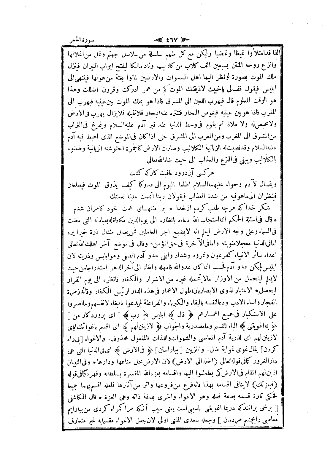 الفا قد امتلأوا غيظا وغضبا وليكن مع كل منهم سلسلة من سلاسل جهنم وغل من أغلالها وانزع روحه المنتن بسبعين الف كلاب من كلاليبها وناد مالكا ليفتح أبواب النيران فينزل ملك الموت بصورة لو نظر إليها اهل السموات والأرضين لما توا بغتة من هولها فينتهى الى إبليس فيقول قف لى يا خبيث لا ذيقنك الموت كم من عمر أدركت وقرون أضللت وهذا هو الوقت المعلوم قال فيهرب اللعين الى المشرق فاذا هو بملك الموت بين عينيه فيهرب الى المغرب فاذا هو بين عينيه فيغوص البحار فتتنزه عنه البحار فلا تقبله فلا يزال يهرب فى الأرض ولا محيص له ولا ملاذ ثم يقوم فى وسط الدنيا عند قبر آدم عليه السلام ويتمرغ فى التراب من المشرق الى المغرب ومن المغرب الى المشرق حتى إذا كان فى الموضع الذي اهبط فيه آدم عليه السلام وقد نصبت له الزبانية الكلاليب وصارت الأرض كالجمرة احتوشته الزبانية وطعنوه بالكلاليب ويبقى فى النزع والعذاب الى حيث شاء الله تعالى هر كسى آن درود عاقبت كار كه كشت ويقال لآدم وحواء عليهما السلام اطلعا اليوم الى عدو كما كيف يذوق الموت فيطلعان فينظر ان الى ما هو فيه من شدة العذاب فيقولان ربنا أتممت علينا نعمتك