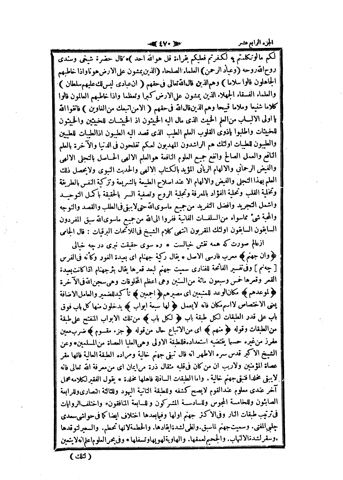 لكم ما لو تكلمتم به لكفرتم فعليكم بقراءة قل هو الله أحد) قال حضرة شيخى وسندى روح الله روحه وَعِبادُ الرَّحْمنِ العلماء الصلحاء الَّذِينَ يَمْشُونَ عَلَى الْأَرْضِ هَوْناً وَإِذا خاطَبَهُمُ الْجاهِلُونَ قالُوا سَلاماً وهم الذين قال الله تعالى فى حقهم إِنَّ عِبادِي لَيْسَ لَكَ عَلَيْهِمْ سُلْطانٌ والعلماء الفسقاء الجهلاء الذين يمشون على الأرض كبرا وتعظما وإذا خاطبهم العالمون قالوا كلاما شنيعا وملاما قبيحا وهم الذين قال الله فى حقهم إِلَّا مَنِ اتَّبَعَكَ مِنَ الْغاوِينَ فاتقوا الله يا اولى الألباب من العلم الخبيث الذي مال اليه الخبيثون إذ الخبيثات للخبيثين والخبيثون للخبيثات واطلبوا يا ذوى القلوب العلم الطيب الذي قصد اليه الطيبون إذ الطيبات للطيبين والطيبون للطيبات أولئك هم الراشدون المهديون لعكم تفلحون فى الدنيا والآخرة بالعلم النافع والعمل الصالح وانفع جميع العلوم النافعة هو العلم الإلهي الحاصل بالتجلى الإلهي والفيض الرحمانى والإلهام الرباني المؤيد بالكتاب الإلهي والحديث النبوي ولا يحصل ذلك العلم بهذا التجلي والفيض والإلهام الا عند إصلاح الطبيعة بالشريعة وتزكية النفس بالطريقة وتخلية القلب وتحلية الفؤاد بالمعرفة وتجلية الروح وتصفية السر بالحقيقة بأكمل التوحيد وأشمل التجريد وأفضل التفريد من جميع ما سوى الله حتى لا يبقى فى الطلب والقصد والتوجه والمحبة شىء مما سواه من السلفات الفانية ففروا الى الله من جميع ما سوى الله سبق المفردون السابقون السابقون أولئك المقربون انتهى كلام الشيخ فى اللائحات البرقيات: قال الجامى