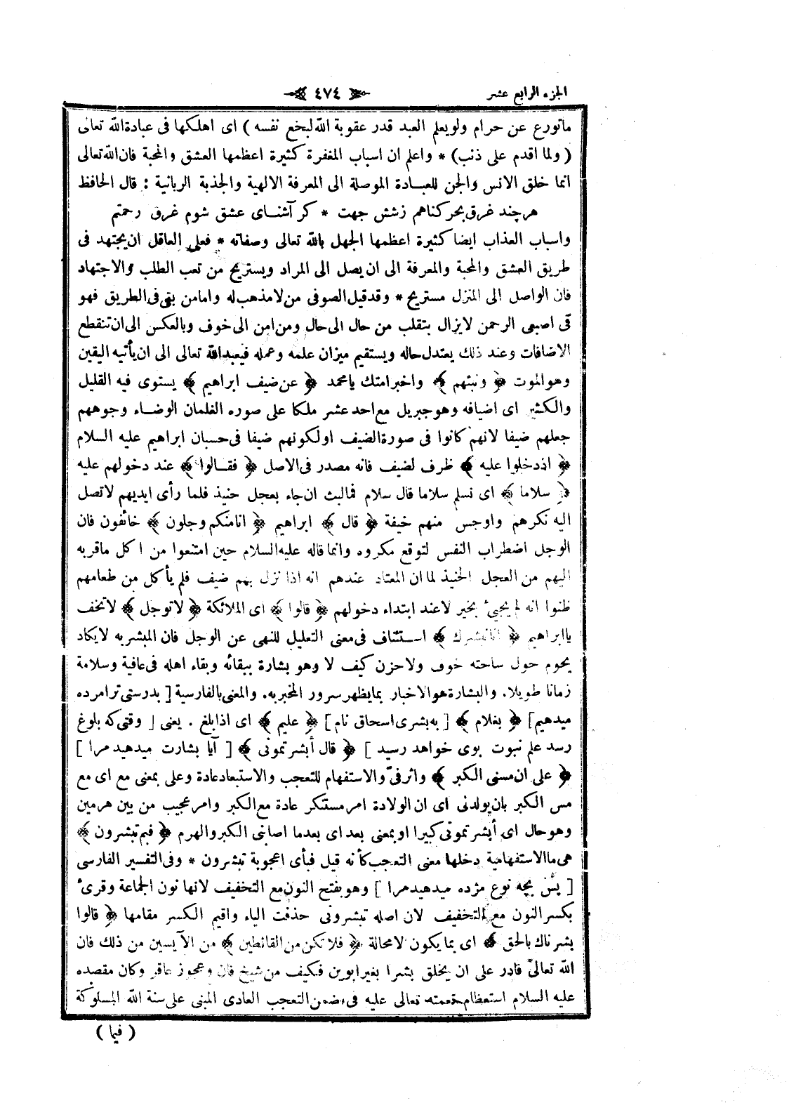 واسباب العذاب ايضا كثيرة أعظمها الجهل بالله تعالى وصفاته فعلى العاقل ان يجتهد فى طريق العشق والمحبة والمعرفة الى ان يصل الى المراد ويستريح من تعب الطلب والاجتهاد فان الواصل الى المنزل مستريح وقد قيل الصوفي من لا مذهب له واما من بقي فى الطريق فهو فى إصبعي الرحمن لا يزال يتقلب من حال الى حال ومن أمن الى خوف وبالعكس الى ان تنقطع الإضافات وعند ذلك يعتدل حاله ويستقيم ميزان علمه وعمله فيعبد الله تعالى الى ان يأتيه اليقين وهو الموت وَنَبِّئْهُمْ واخبر أمتك يا محمد عَنْ ضَيْفِ إِبْراهِيمَ يستوى فيه القليل والكثير اى أضيافه وهو جبريل مع أحد عشر ملكا على صورة الغلمان الوضاء وجوههم جعلهم ضيفا لانهم كانوا فى صورة الضيف او لكونهم ضيفا فى حسبان ابراهيم عليه السلام إِذْ دَخَلُوا عَلَيْهِ ظرف لضيف فانه مصدر فى الأصل فَقالُوا عند دخولهم عليه سَلاماً اى نسلم سلاما قال سلام فما لبث ان جاء بعجل حنيذ فلما رأى أيديهم لا تصل اليه نكرهم وأوجس منهم خيفة قالَ ابراهيم إِنَّا مِنْكُمْ وَجِلُونَ خائفون فان الوجل اضطراب النفس لتوقع مكروه وانما قاله عليه السلام حين امتنعوا من أكل ما قربه إليهم من العجل الحنيذ لما ان المعتاد عندهم انه إذا نزل بهم ضيف فلم يأكل من طعامهم ظنوا انه لم يجيئ بخير لا عند ابتداء دخولهم قالُوا اى الملائكة لا تَوْجَلْ لا تخف يا ابراهيم إِنَّا نُبَشِّرُكَ استئناف فى معنى التعليل للنهى عن الوجل فان المبشريه لا يكاد يحوم حول ساحته خوف ولا حزن كيف لا وهو بشارة ببقائه وبقاء اهله فى عافية وسلامة زمانا طويلا. والبشارة هو الاخبار بما يظهر سرور المخبر به. والمعنى بالفارسية [بدرستى ترا مژده ميدهيم] بِغُلامٍ [به بشرى إسحاق نام] عَلِيمٍ اى إذا بلغ. يعنى [وقتى كه بلوغ رسد علم نبوت بوى خواهد رسيد] قالَ أَبَشَّرْتُمُونِي [آيا بشارت ميدهيد مرا] عَلى أَنْ مَسَّنِيَ الْكِبَرُ واثر فىّ والاستفهام للتعجب والاستبعاد عادة وعلى بمعنى مع اى مع مس الكبر بان يولد لى اى ان الولادة امر مستنكر عادة مع الكبر وامر عجيب من بين هرمين وهو حال اى أبشرتموني كبيرا او بمعنى بعد اى بعد ما أصابني الكبر والهرم فَبِمَ تُبَشِّرُونَ هى ما الاستفهامية دخلها معنى التعجب كأنه قيل فبأى اعجوبة تبشرون وفى التفسير الفارسي [پس بچهـ نوع مژده ميدهيد مرا] وهو بفتح النون مع التخفيف لانها نون الجماعة وقرئ بكسر النون مع التخفيف لان أصله تبشروني حذفت الياء وأقيم الكسر مقامها قالُوا بَشَّرْناكَ بِالْحَقِّ اى بما يكون لا محالة فَلا تَكُنْ مِنَ الْقانِطِينَ من الآيسين من ذلك فان الله تعالى قادر على ان يخلق بشرا بغير أبوين فكيف من شيخ فان وعجوز عاقر وكان مقصده عليه السلام استعظام نعمته تعالى عليه فى ضمن التعجب العادي المبنى على سنة الله المسلوكة