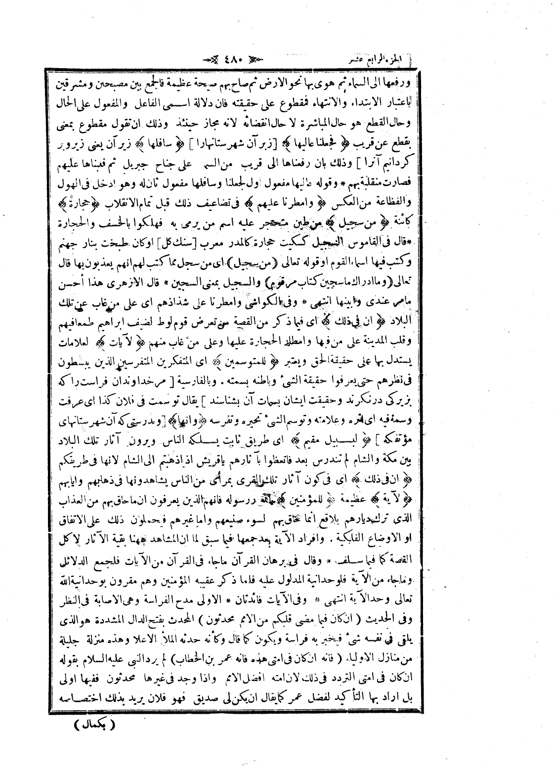 ورفعها الى السماء ثم هوى بها نحو الأرض ثم صاح بهم صيحة عظيمة فالجمع بين مصبحين ومشرقين باعتبار الابتداء والانتهاء فمقطوع على حقيقته فان دلالة اسمى الفاعل والمفعول على الحال وحال القطع هو حال المباشرة لا حال انقضائه لانه مجاز حينئذ وذلك ان تقول مقطوع بمعنى بقطع عن قريب فَجَعَلْنا عالِيَها [زبر آن شهرستانها را] سافِلَها زير آن يعنى زير وبر كردانيم آنرا] وذلك بان رفعناها الى قريب من السماء على جناح جبريل ثم قلبناها عليهم فصارت منقلبة بهم وقوله عاليها مفعول أول لجعلنا وسافلها مفعول ثان له وهو ادخل فى الهول والفظاعة من العكس وَأَمْطَرْنا عَلَيْهِمْ فى تضاعيف ذلك قبل تمام الانقلاب حِجارَةً كائنة مِنْ سِجِّيلٍ من طين متحجر عليه اسم من يرمى به فهلكوا بالخسف والحجارة قال فى القاموس السجيل كسكيت حجارة كالمدر معرب [سنك كل] او كان طبخت بنار جهنم وكتب فيها اسماء القوم او قوله تعالى مِنْ سِجِّيلٍ اى من سجل مما كتب لهم انهم يعذبون بها قال تعالى وَما أَدْراكَ ما سِجِّينٌ كِتابٌ مَرْقُومٌ والسجيل بمعنى السجين قال الأزهري هذا أحسن ما مر عندى وأبينها انتهى وفى الكواشي وأمطرنا على شذاذهم اى على من غاب عن تلك البلاد إِنَّ فِي ذلِكَ اى فيما ذكر من القصة من تعرض قوم لوط لضيف ابراهيم طمعا فيهم وقلب المدينة على من فيها وامطار الحجارة عليها وعلى من غاب منهم لَآياتٍ لعلامات يستدل بها على حقيقة الحق ويعتبر لِلْمُتَوَسِّمِينَ اى المتفكرين المتفرسين الذين يبسطون فى نظرهم حتى يعرفوا حقيقة الشيء وباطنه بسمته. وبالفارسية [مر خداوندان فراست را كه بزيركى در نكرند وحقيقت ايشان بسمات آن بشناسند] يقال تو سمت فى فلان كذا اى عرفت وسمه فيه اى اثره وعلامته وتوسم الشيء تحيره وتفرسه وَإِنَّها [وبدرستى كه آن شهرستانهاى مؤتفكه] لَبِسَبِيلٍ مُقِيمٍ اى طريق ثابت يسلكه الناس ويرون آثار تلك البلاد بين مكة والشام لم تندرس بعد فاتعظوا بآثارهم يا قريش إذ أذهبتم الى الشام لانها فى طريقكم إِنَّ فِي ذلِكَ اى فى كون آثار تلك القرى بمرأى من الناس يشاهدونها فى ذهابهم وإيابهم لَآيَةً عظيمة لِلْمُؤْمِنِينَ بالله رسوله فانهم الذين يعرفون ان ما حاق بهم من العذاب الذي ترك ديارهم بلاقع انما حاق بهم لسوء صنيعهم واما غيرهم فيحملون ذلك على الاتفاق او الأوضاع الفلكية. وافراد الآية بعد جمعها فيما سبق لما ان المشاهد هاهنا بقية الآثار لاكل القصة كما فيما سلف وقال فى برهان القرآن ما جاء فى القرآن من الآيات فلجمع الدلائل وما جاء من الآية فلو حدانية المدلول عليه فلما ذكر عقيبه المؤمنين وهم مقرون بوحدانية الله تعالى وحد الآية انتهى وفى الآيات فائدتان الاولى مدح الفراسة وهى الاصابة فى النظر وفى الحديث (ان كان فيما مضى قلبكم من الأمم محدثون) المحدث بفتح الدال المشددة هو الذي يلقى فى نفسه شىء فيخبر به فراسة ويكون كما قال وكأنه حدثه الملأ الأعلى وهذه منزلة جليلة من منازل الأولياء (فانه ان كان فى أمتي هذه فانه عمر بن الخطاب) لم يرد النبي عليه السلام بقوله ان كان فى أمتي التردد فى ذلك لان أمته أفضل الأمم وإذا وجد فى غيرها محدثون ففيها اولى بل أراد بها التأكيد لفضل عمر كما يقال ان يكن لى صديق فهو فلان يريد بذلك اختصاصه