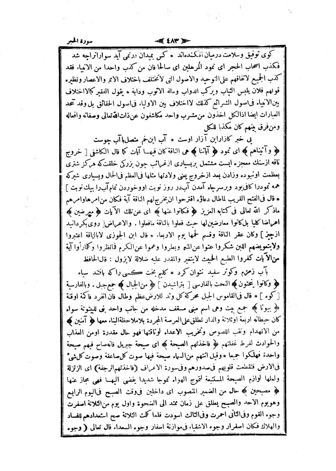 وَكانُوا يَنْحِتُونَ النحت بالفارسي [بتراشيدن] مِنَ الْجِبالِ جمع جبل. وبالفارسية [كوه] قال فى القاموس الجبل محركة كل وتد للارض عظم وطال فان انفرد فاكمة أو قنة بُيُوتاً جمع بيت وهى اسم مبنى مسقف مدخله من جانب واحد بنى للبيتوتة سواء كان حيطانه اربعة او ثلاثة والدار تطلق على العرصة المجردة بلا ملاحظة البناء معها آمِنِينَ من الانهدام ونقب اللصوص وتخريب الأعداء لوثاقتها فهو حال مقدرة او من العذاب والحوادث لفرط غفلتهم فَأَخَذَتْهُمُ الصَّيْحَةُ اى صيحة جبريل فانه صاح فيهم صيحة واحدة فهلكوا جميعا وقيل أتتهم من السماء صيحة فيها صوت كل صاعقة وصوت كل شىء فى الأرض فتقطعت قلوبهم فى صدورهم وفى سورة الأعراف فَأَخَذَتْهُمُ الرَّجْفَةُ