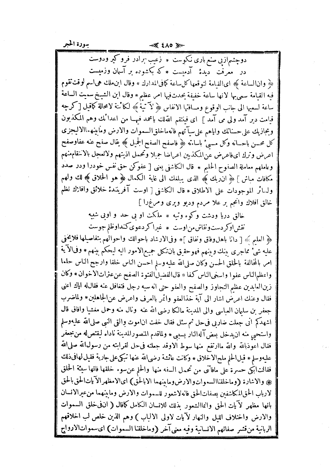 الْعَلِيمُ [دانا باهل وفاق ونفاق] وفى الإرشاد بأحوالك وأحوالهم بتفاصيلها فلا يخفى عليه شىء مما جرى بينك وبينهم فهو حقيق بان تكل جميع الأمور اليه ليحكم بينهم وفى الآية امر بالمخالفة بالخلق الحسن وكان صلى الله عليه وسلم احسن الناس خلقا وأرجح الناس حلما وأعظم الناس عفوا وأسخى الناس كفا قال الفضيل الفتوة الصفح عن عثرات الاخوان وكان زين العابدين عظيم التجاوز والصفح والعفو حتى انه سبه رجل فتغافل عنه فقال له إياك اعنى فقال وعنك اعرض أشار الى آية خذ العفو وأمر بالعرف واعرض عن الجاهلين ولما ضرب جعفر بن سليمان العباسي والى المدينة مالكا رضى الله عنه ونال منه وحمل مغشيا وأفاق قال أشهدكم انى جعلت ضاربى فى حل ثم سئل فقال خفت ان أموت والقى النبي صلى الله عليه وسلم واستحيى منه ان يدخل بعض آله النار بسببى ولما قدم المنصور المدينة ناداه ليقتص له من جعفر فقال أعوذ بالله والله ما ارتفع منها سوط الا وقد جعلته فى حل لقرابته من رسول الله صلى الله عليه وسلم قيل الحلم ملح الأخلاق وكانت عائشة رضى الله عنها تبكى على جارية فقيل لها فى ذلك فقالت ابكى حسرة على ما فاتنى من تحمل السفه منها والحلم عن سوء خلقها فانها سيئة الخلق والاشارة وَما خَلَقْنَا السَّماواتِ وَالْأَرْضَ وَما بَيْنَهُما إِلَّا بِالْحَقِّ اى الا مظهر الآيات الحق بالحق لارباب الحق المكاشفين بصفات الحق فانه لا شعور للسموات والأرض وما بينهما من غير الإنسان بانها مظهر لآيات الحق وانما الشعور بذلك للانسان الكامل كما قال إِنَّ فِي خَلْقِ السَّماواتِ وَالْأَرْضِ وَاخْتِلافِ اللَّيْلِ وَالنَّهارِ لَآياتٍ لِأُولِي الْأَلْبابِ وهم الذين خلص لب اخلاقهم الربانية من قشر صفاتهم الانسانية وفيه معنى آخر وَما خَلَقْنَا السَّماواتِ اى سموات الأرواح