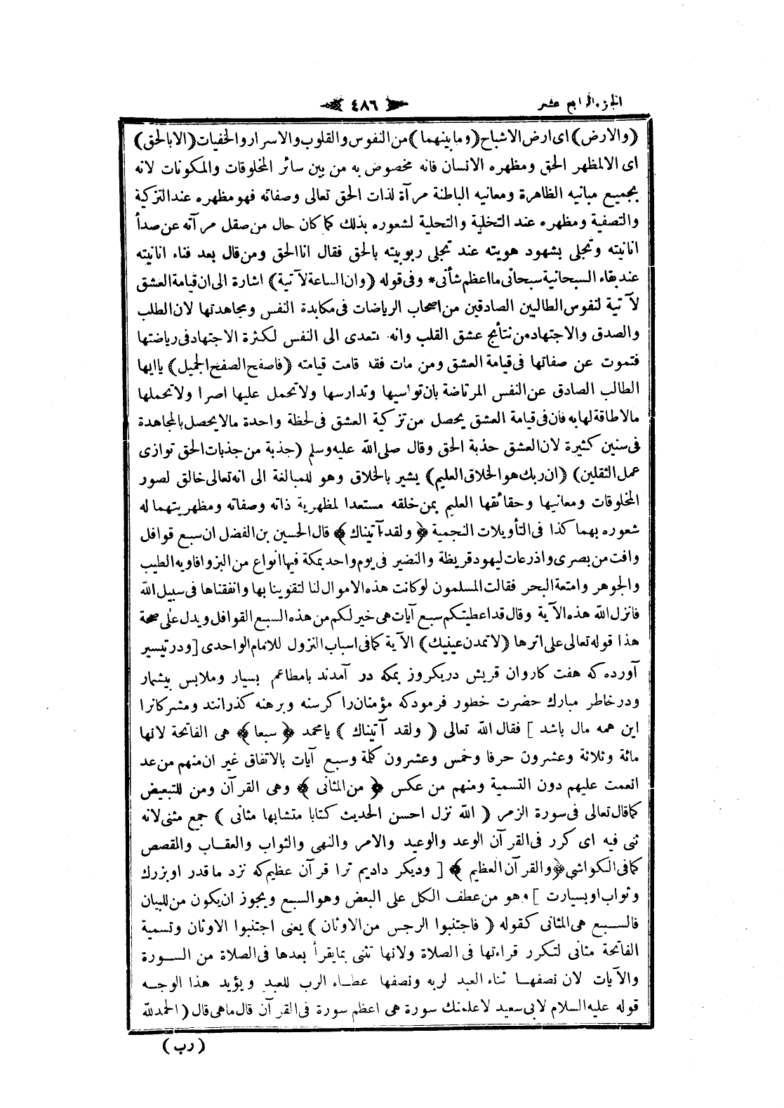 وَالْأَرْضَ اى ارض الأشباح وَما بَيْنَهُما من النفوس والقلوب والاسرار والخفيات إِلَّا بِالْحَقِّ اى الا لمظهر الحق ومظهره الإنسان فانه مخصوص به من بين سائر المخلوقات والمكونات لانه بجميع مبانيه الظاهرة ومعانيه الباطنة مرآة لذات الحق تعالى وصفاته فهو مظهره عند التزكية والتصفية ومظهره عند التخلية والتحلية لشعوره بذلك كما كان حال من صقل مرآته عن صدأ انانيته وتجلى بشهود هويته عند تجلى ربوبيته بالحق فقال انا الحق ومن قال بعد فناء انانيته عند بقاء السبحانية سبحانى ما أعظم شأنى وفى قوله وَإِنَّ السَّاعَةَ لَآتِيَةٌ اشارة الى ان قيامة العشق لآتية لنفوس الطالبين الصادقين من اصحاب الرياضات فى مكابدة النفس ومجاهدتها لان الطلب والصدق والاجتهاد من نتائج عشق القلب وانه سيتعدى الى النفس لكثرة الاجتهاد فى رياضتها فتموت عن صفاتها فى قيامة العشق ومن مات فقد قامت قيامته فَاصْفَحِ الصَّفْحَ الْجَمِيلَ يا ايها الطالب الصادق عن النفس المرتاضة بان تواسيها وتدارسها ولا تحمل عليها إصرا ولا تحملها ما لا طاقة لها به فان فى قيامة العشق يحصل من تزكية العشق فى لحظة واحدة ما لا يحصل بالمجاهدة فى سنين كثيرة لان العشق جذبة الحق وقال صلى الله عليه وسلم (جذبة من جذبات الحق توازى عمل الثقلين) إِنَّ رَبَّكَ هُوَ الْخَلَّاقُ الْعَلِيمُ يشير بالخلاق وهو للمبالغة الى انه تعالى خالق لصور المخلوقات ومعانيها وحقائقها العليم بمن خلقه مستعدا لمظهرية ذاته وصفاته ومظهريتهما له شعوره بهما كذا فى التأويلات النجمية وَلَقَدْ آتَيْناكَ قال الحسين بن الفضل ان سبع قوافل وافت من بصرى وأذرعات ليهود قريظة والنضير فى يوم واحد بمكة فيها انواع من البز وأفاويه الطيب والجوهر وامتعة البحر فقالت المسلمون لو كانت هذه الأموال لنا لتقوينا بها وأنفقناها فى سبيل الله فانزل الله هذه الآية وقال قد أعطيتكم سبع آيات هى خير لكم من هذه السبع القوافل ويدل على صحة هذا قوله تعالى على اثرها لا تَمُدَّنَّ عَيْنَيْكَ الآية كما فى اسباب النزول للامام الواحدي [ودر تيسير آورده كه هفت كاروان قريش در يكروز بمكة در آمدند بامطاعم بسيار وملابس بيشمار ودر خاطر مبارك حضرت خطور فرمود كه مؤمنان را كرسنه وبرهنه كذرانند ومشركانرا اين همه مال باشد] فقال الله تعالى وَلَقَدْ آتَيْناكَ يا محمد سَبْعاً هى الفاتحة لانها مائة وثلاثة وعشرون حرفا وخمس وعشرون كلمة وسبع آيات بالاتفاق غير ان منهم من عد أنعمت عليهم دون التسمية ومنهم من عكس مِنَ الْمَثانِي وهى القرآن ومن للتبعيض كما قال تعالى فى سورة الزمر اللَّهُ نَزَّلَ أَحْسَنَ الْحَدِيثِ كِتاباً مُتَشابِهاً مَثانِيَ جمع مثنى لانه ثنى فيه اى كرر فى القرآن الوعد والوعيد والأمر والنهى والثواب والعقاب والقصص كما فى الكواشي وَالْقُرْآنَ الْعَظِيمَ [وديكر داديم ترا قرآن عظيم كه نزد ما قدر او بزرك وثواب او بسيارت] وهو من عطف الكل على البعض وهو السبع ويجوز ان يكون من للبيان فالسبع هى المثاني كقوله فَاجْتَنِبُوا الرِّجْسَ مِنَ الْأَوْثانِ يعنى اجتنبوا الأوثان وتسمية الفاتحة مثانى لتكرر قراءتها فى الصلاة ولانها تثنى بما يقرأ بعدها فى الصلاة من السورة والآيات لان نصفها ثناء العبد لربه ونصفها عطاء الرب للعبد ويؤيد هذا الوجه قوله عليه السلام لابى سعيد لا علمنك سورة هى أعظم سورة فى القرآن قال ما هى قال (الحمد لله