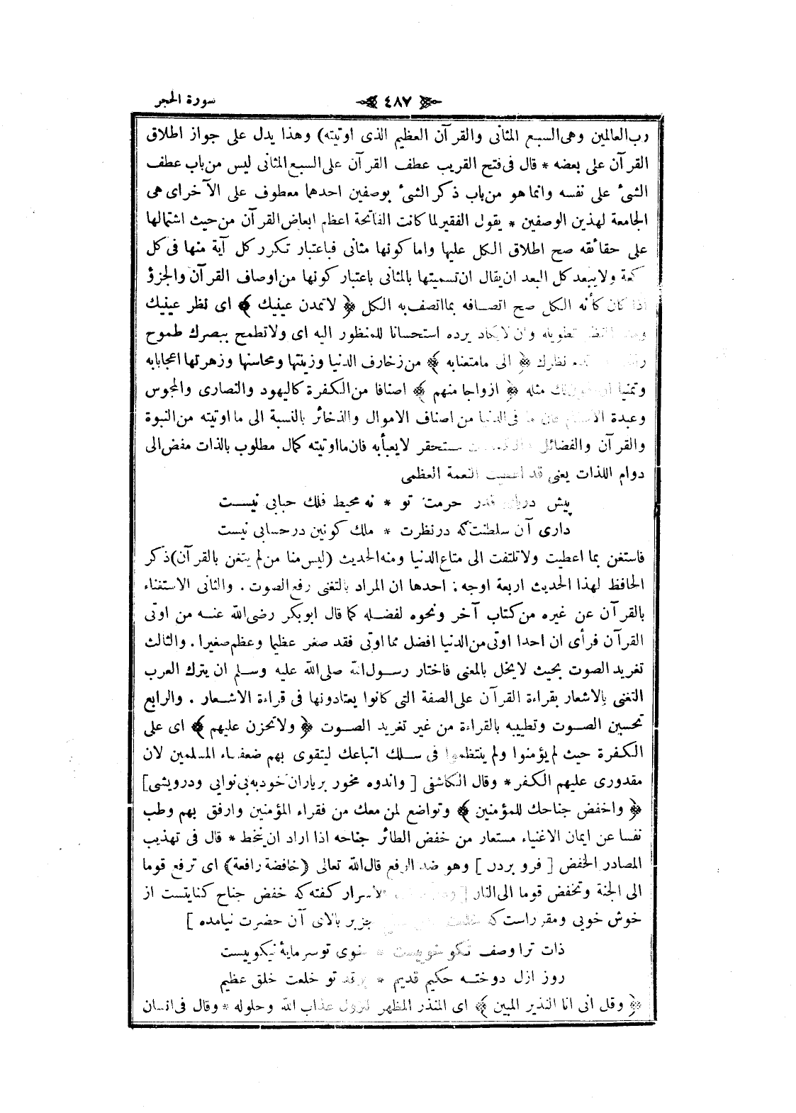 رب العالمين وهى السبع المثاني والقرآن العظيم الذي أوتيته) وهذا يدل على جواز اطلاق القرآن على بعضه قال فى فتح القريب عطف القرآن على السبع المثاني ليس من باب عطف الشيء على نفسه وانما هو من باب ذكر الشيء بوصفين أحدهما معطوف على الآخر اى هى الجامعة لهذين الوصفين يقول الفقير لما كانت الفاتحة أعظم ابعاض القرآن من حيث اشتمالها على حقائقه صح اطلاق الكل عليها واما كونها مثانى فباعتبار تكرر كل آية منها فى كل ركعة ولا يبعد كل البعد ان يقال ان تسميتها بالمثاني باعتبار كونها من أوصاف القرآن والجزء إذا كان كأنه الكل صح اتصافه بما اتصف به الكل لا تَمُدَّنَّ عَيْنَيْكَ اى نظر عينيك ومد النظر تطويله وان لا يكاد يرده استحسانا للمنظور اليه اى ولا تطمح ببصرك طموح راغب ولا تدم نظرك إِلى ما مَتَّعْنا بِهِ من زخارف الدنيا وزينتها ومحاسنها وزهرتها إعجابا به وتمنيا ان يكون لك مثله أَزْواجاً مِنْهُمْ أصنافا من الكفرة كاليهود والنصارى والمجوس وعبدة الأصنام فان ما فى الدنيا من اصناف الأموال والذخائر بالنسبة الى ما أوتيته من النبوة والقرآن والفضائل والكمالات مستحقر لا يعبأ به فان ما أوتيته كمال مطلوب بالذات مفض الى دوام اللذات يعنى قد أعطيت النعمة العظمى