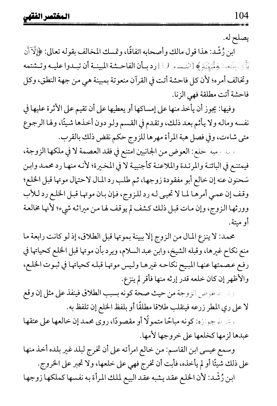 ابن رشد: هذا قول مالك وأصحابه اتفاقاً، وتمسك المخالف بقوله تعالى: {إِلاَّ أَنْ يَاتِينَ بِفَاحِشَةٍ مُبَيِّنَةٍ} [النساء: 19] رد بأن الفاحشة المبينة أن تبدوا عليه وتشتمه وتخالف أمره؛ لأن كل فاحشة أتت في القرآن منعوتة بمبينة هي من جهة النطق، وكل فاحشة أتت مطلقة فهي الزنا.