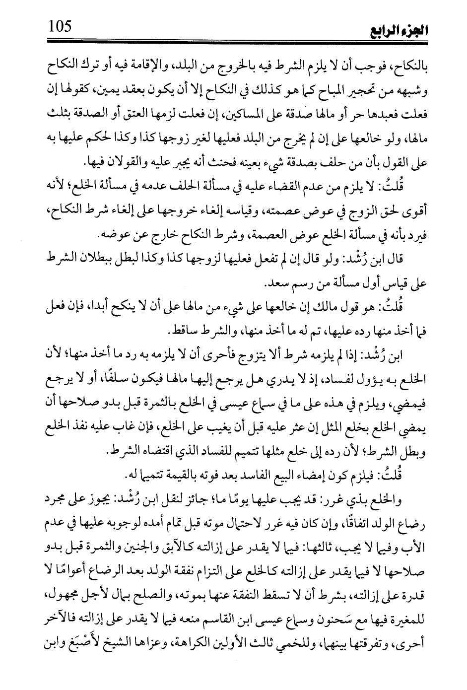 ابن رشد: إذ لم يلزمه شرط ألا يتزوج فأحرى أن لا يلزمه به رد ما أخذ منها؛ لأن الخلع به يؤول لفساد، إذ لا يدري هل يرجع إليها مالها فيكون سلفاً، أو لا يرجع فيمضي، ويلزم في هذه على ما في سماع عيسى في الخلع بالثمرة قبل بدو صلاحها أن يمضي الخلع بخلع المثل إن عثر عليه قبل أن يغيب على الخلع، فإن غاب عليه نفذ الخلع وبطل الشرط؛ لأن رده إلى خلع مثلها تتميم للفساد الذي اقتضاه الشرط.