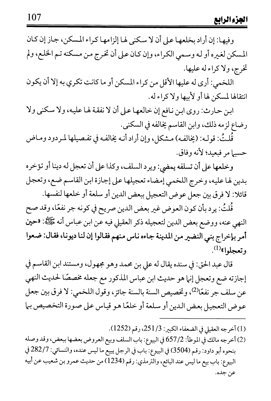 قال عبد الحق: في سنده يقال له على بن محمد وهو مجهول، ومستند ابن القاسم في إجازته ضع وتعجل إنما هو حديث ابن عباس المذكور مع جعله مخصصاً لحديث النهي عن سلف جر نفعاً، وتخصيص السنة بالسنة، وقول اللخمي: لا فرق بين جعل عوض التعجيل بعض الدين أو سلعة أو خلعاً هو قياس على صورة التخصيص بما