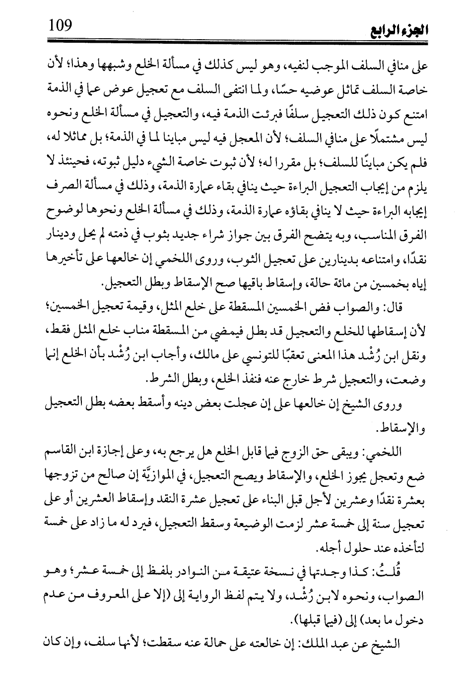 على منافي السلف الموجب لنفيه، وهو ليس كذلك في مسألة الخلع وشبهها وهذا؛ لأن خاصة السلف تماثل عوضيه حساً، ولما انتفى السلف مع تعجيل عوض عما قي الذمة امتنع كون ذلك التعجيل سلفاً فبرئت الذمة فيه، والتعجيل في مسألة الخلع ونحوه ليس مشتملاً على منافي السلف؛ لأن المعجل فيه ليس مباينا لما في الذمة؛ بل مماثلاً له، فلم يكن مبايناً للسلف، بل مقرراً له؛ لأن ثبوت خاصة الشيء دليل ثبوته، فحينئذ لا يلزم من إيجاب التعجيل البراءة حيث ينافي بقاء عمارة الذمة، وذلك في مسألة الصرف إيجابه البراءة حيث لا ينافي بقاؤه عمارة الذمة، وذلك في مسألة الخلع ونحوها لوضوح الفرق المناسب، وبه يتضح الفرق بين جواز شراء جديد بثوب في ذمته لم يحل ودينار نقداً، وامتناعه بدينارين على تعجيل الثوب، وروي اللخمي إن خالعها على تأخيرها إياه بخمسين من مائة حالة، وإسقاط باقيها صح الإسقاط وبطل التعجيل.