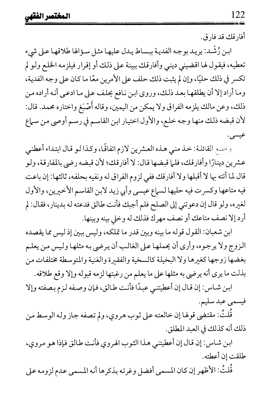 ابن رشد: يريد بوجه الفدية ببساط يدل عليها مثلا سؤالها طلاقها على شيء تعطيه، فيقول لها اقضيني ديني وأفارقك ببينة على ذلك أو إقراره فيلزمه الخلع ولو لم تكسر في ذلك حلياً، وإن لم يثبت ذلك حلف على الأمرين معاً ما كان على وجه الفدية، وما أراد إلا أن يطلقها بعد ذلك، وروي ابن نافع يحلف على ما أدعى أنه أراده من ذلك، وعن مالك يلزمه الفراق ولا يمكن من اليمين، وقاله أصبغ واختاره محمد. قال: لأن قبضته ذلك منها وجع خلع، والأول اختيار ابن القاسم في رسم أوصي من سماع عيسى.