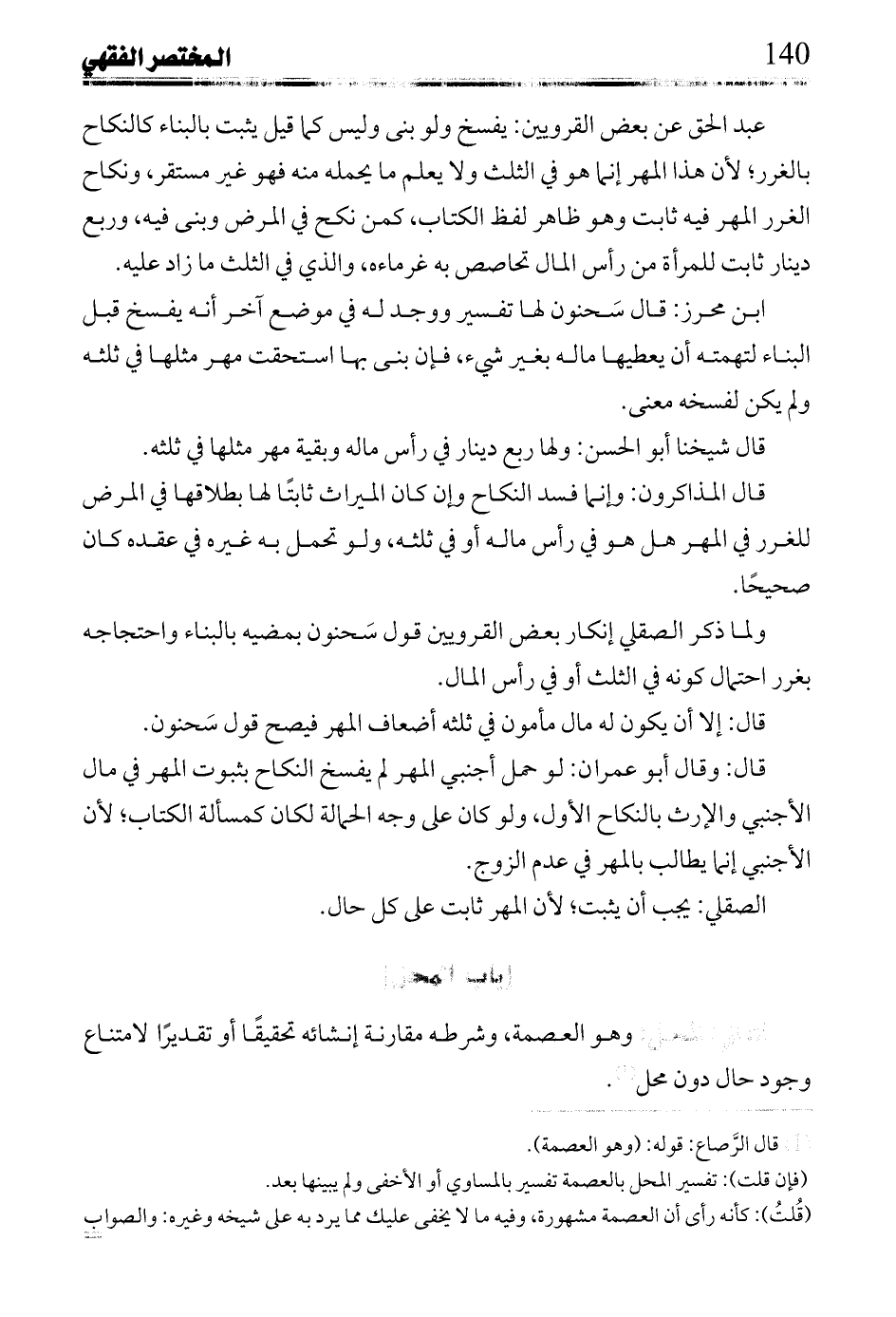 **** وهو العصمة، وشرطه مقارنة إنشائه تحقيقاً أو تقديراً لامتناع وجود حال دون محل.